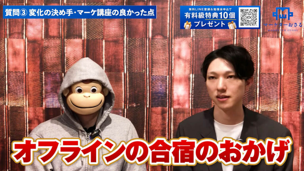 じょじょ:はい、本当に人生が変わったと感じてます。合宿では、おさるさんに動画編集系の商品を出そうとしていたことを止めていただきました(笑)。