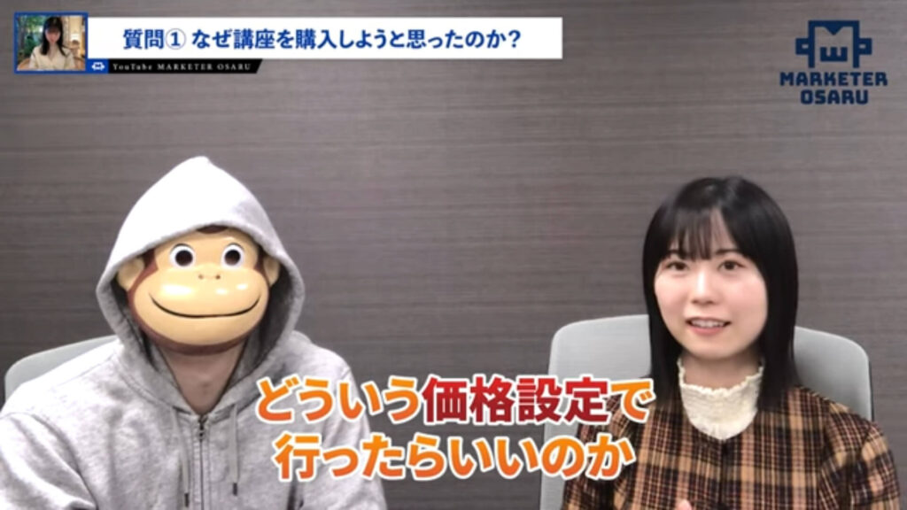 かんな:はい。去年の11月くらいにおさるさんに個別面談をしていただいて、時間で言えば15分くらいだったのですが、そのなかで一気に全部悩みが解決しました。結論として高単価ではなくて「動画編集CAMPみたいな短期集中講座をやりましょう」ということでアドバイスをいただきまして、その方向で進めていきました。
