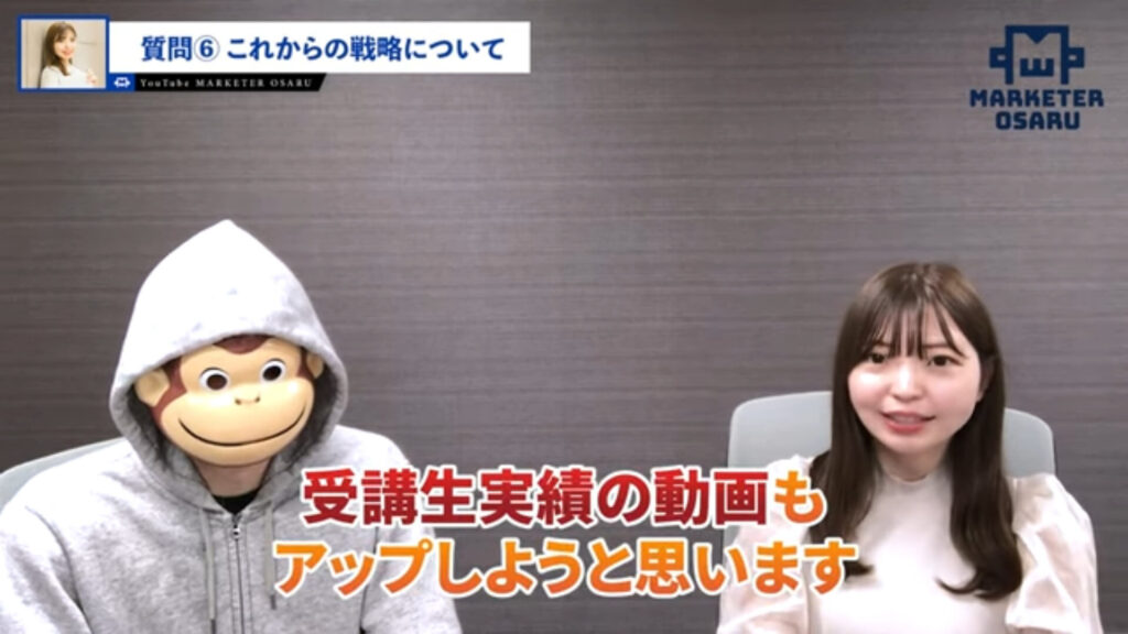 おさる:すごいですね。そこがもう組織化できてしまったということですが、なかなかできることではないです。もしかしたら見た感じオンラインスクールだけを売っているとか皆さん思いがちですが、今回はそちらがむしろあとに着手したというか、よりこちらを強化していこうということで受講していただきました。