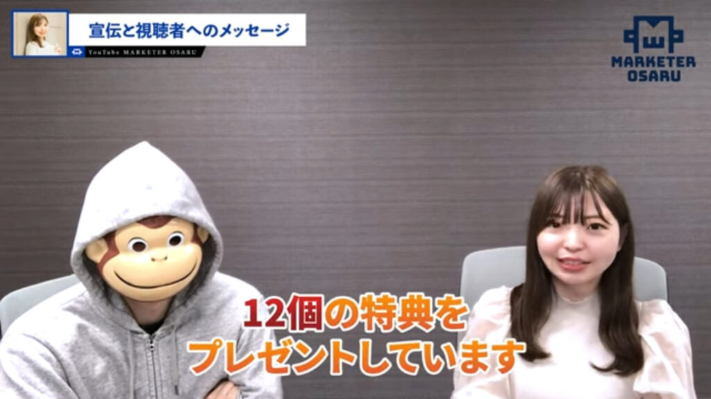 おさる:すごいじゃないですか。しかもクオリティも高いですよね。さらにこれだけではなくて対談動画も撮っていたり、ローンチ動画も撮っていたりとか。特典も変えたんですか?
