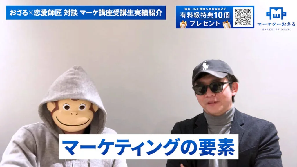おさる:今回はですね、受講生実績者ということで恋愛師匠にお越しいただきました。本日は本当にありがとうございました。