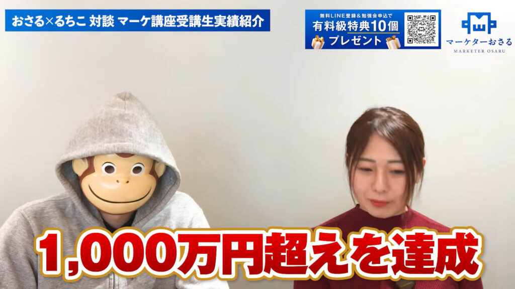 るちこ:1回のローンチで500万円ぐらいが最高でしたね。でも、おさるさんの講座に入ってから、1,000万円に一気に伸びました。