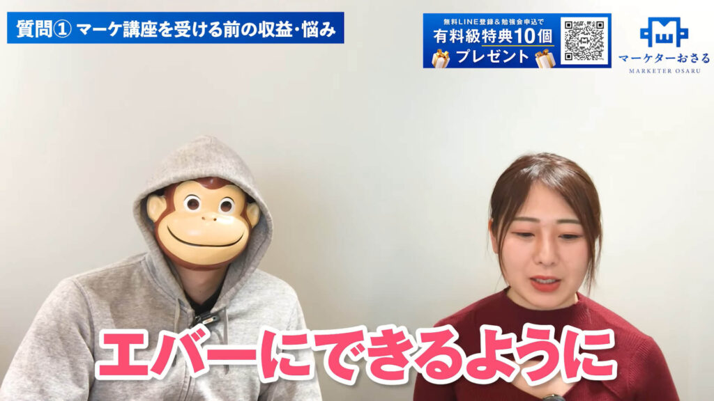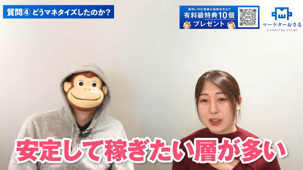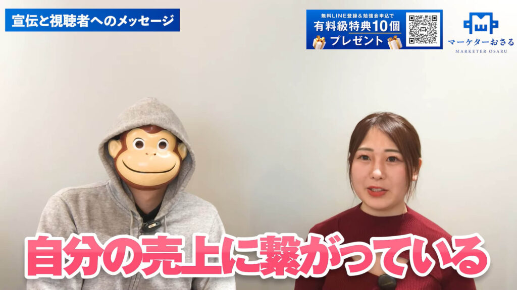 ただ最初は売上がなかなか伸びず、既存フォロワーに売っただけで止まってしまって。そんなときにおさるさんのマーケ講座を知って、参加させていただきました。