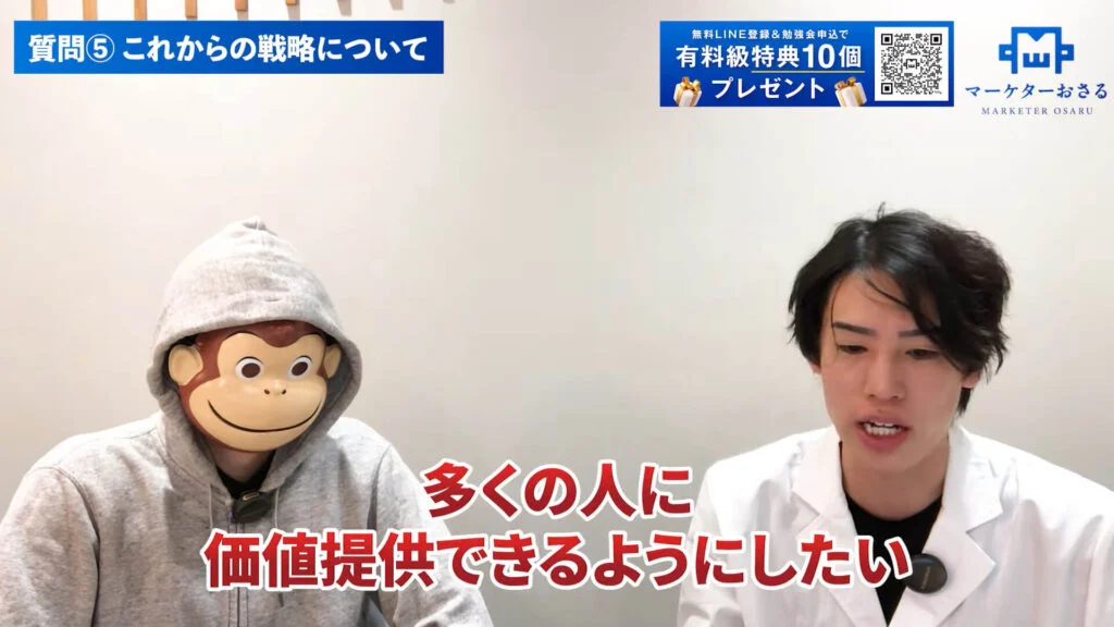 しろ社長:マーケ博士の紹介ですね。おさるさんが講師をされている「おさるマーケ大学」の第2弾に関わっていたマーケ博士と話した際に「しろ社長はおさるさんのところに入ったほうがいい」と勧められて、即決で「入ります」と伝えました。