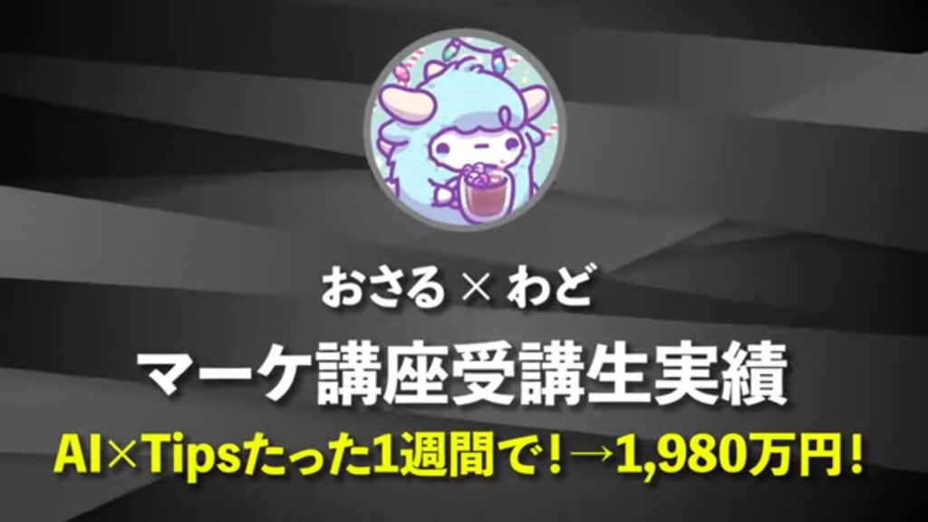 おさる:シンプルにオタクの人というか、僕もそうですけれど、英語も大好きですしマーケティングもずっと向かっていられるっていうのが強みですよね。好きには勝てないというところで、今回はAI×Tipsでたった1週間で1,980万円の実績をあげられました。