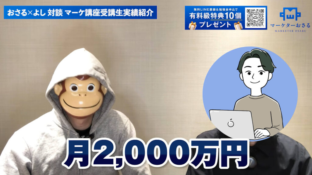 おさる:今回は実績者として再登場いただきありがとうございます!前回も月1,300万円の売上を出された実績で出演いただきましたが、今回はさらに成果が伸びたと伺っています。