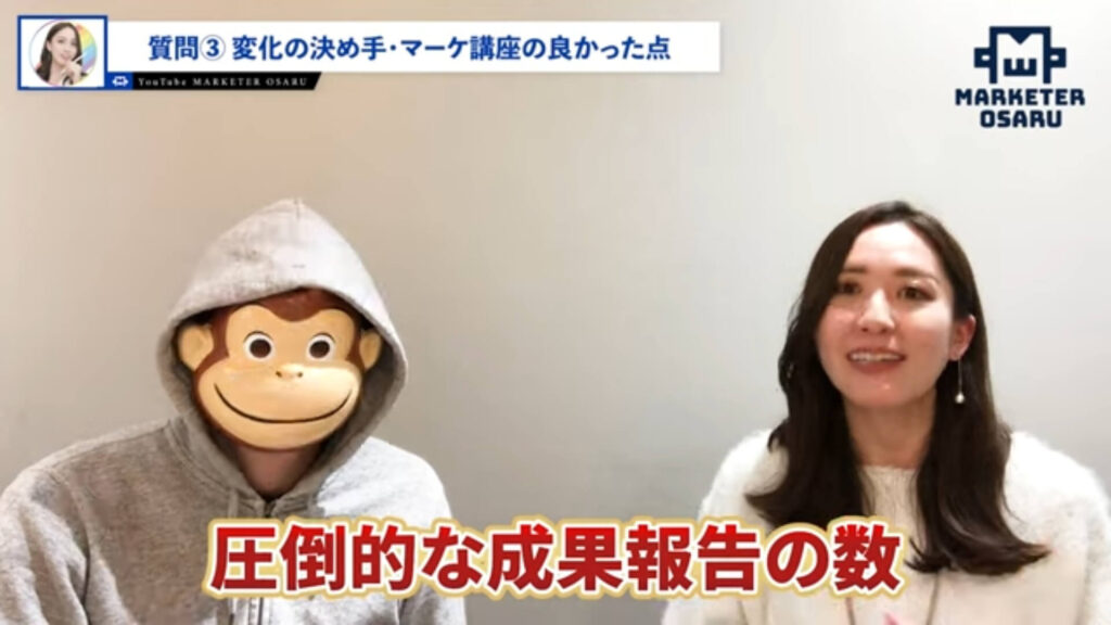 ゆき:2つ目は成果が出る構成を学べたことです。おさるさんの講座ではやるべきことがとてもシンプルで行動しやすいですし、行動を促す教育ができています。おさるさんの行動の基準が伝わる内容になっていて、これが多くの人を結果に導ける秘訣だと感じました。