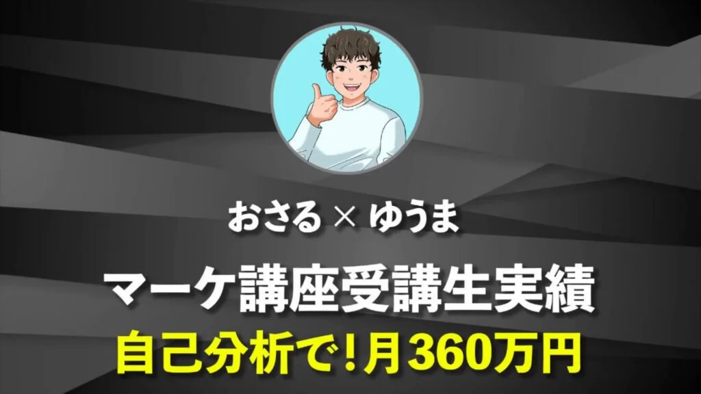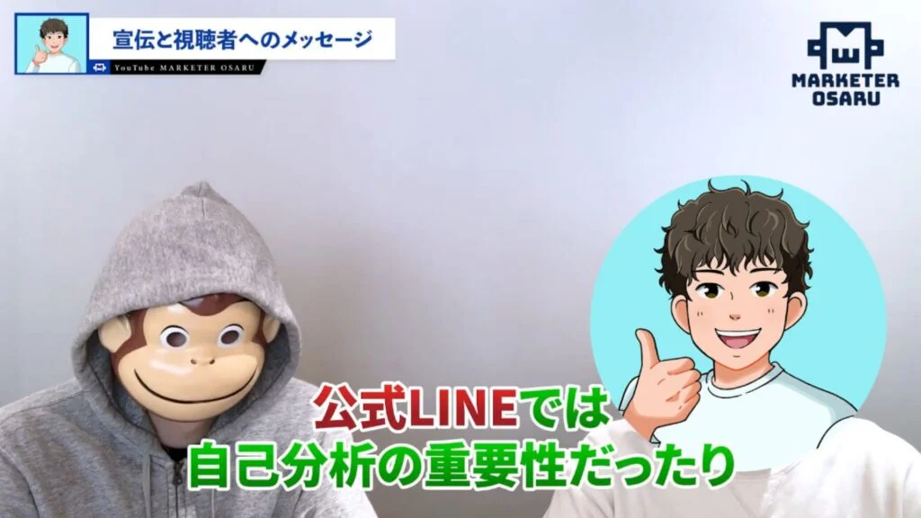 おさる:この動画見ているのは経営者の方が多いですが、皆さん自己分析の重要性がわかったと思いますので概要欄からゆうまさんの公式LINEを登録してみてください。最後にいつも皆さんに聞いているんですが、どんな人に僕の講座を紹介したいですか?