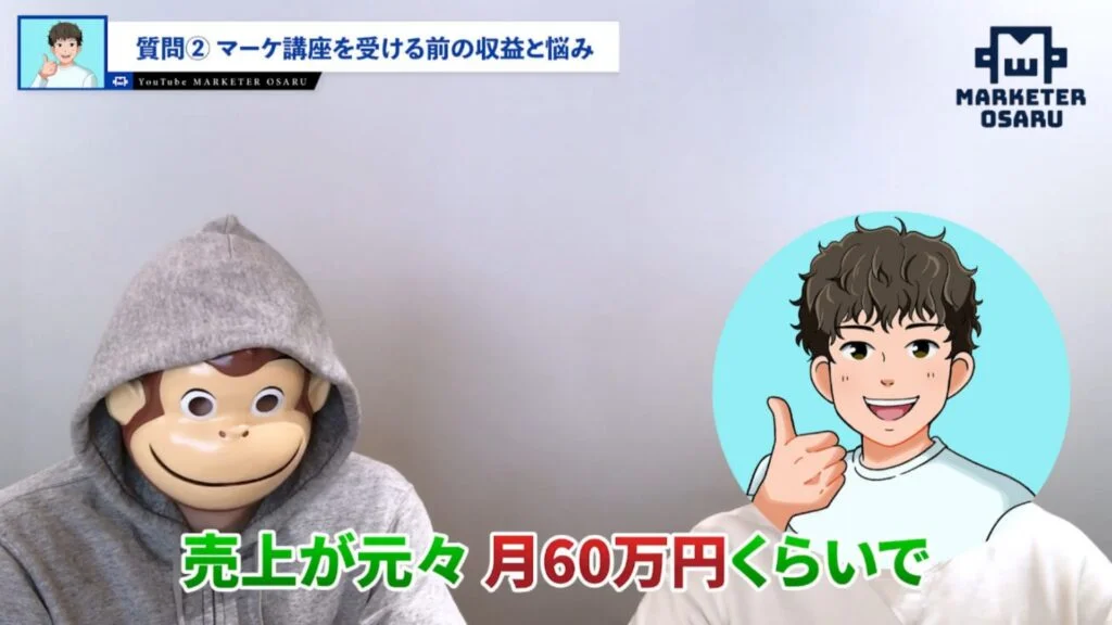おさる:講座に入る前の収益と、悩みを改めて教えていただいてもいいですか?