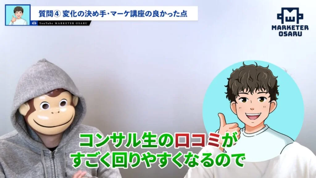 ゆうま:おさるさんの講座を本当に推せる人は0 → 1の人ではなくて、自分では動いているというのが大前提ですが、コンテンツを持っていてマーケティングの部分が不安だったりマネタイズがうまくいかない、コンテンツ販売の答えを知りたい方におすすめです。