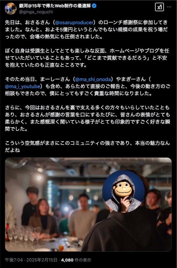 を開催し、5日間のチャレンジローンチ企画で、過去最高となる5億円近くの成果を達成しました。これはおさるひとりで成し遂げたものではなく、たくさんの人たちに支えてもらっての成果です。