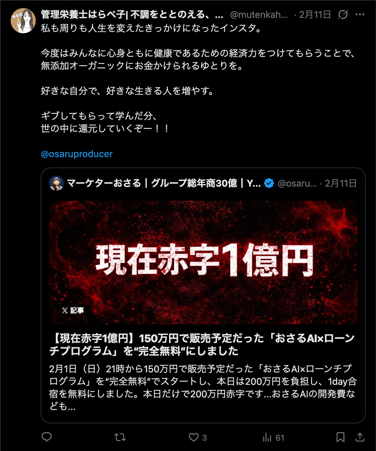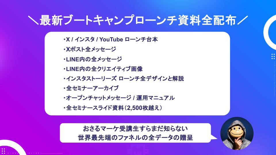 このプログラムは、おさるマーケ講座内で行っている2か月間の集中企画です。新規講座ではなく「ローンチを期間内にやり切る」をコンセプトにした講座内の無料企画ですが、普通なら100万円以上で販売する内容を詰め込んでいます。