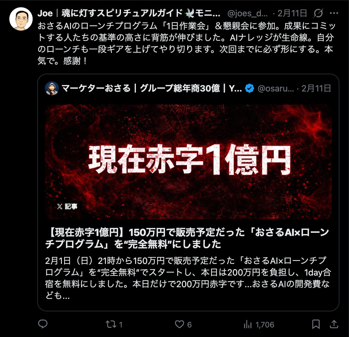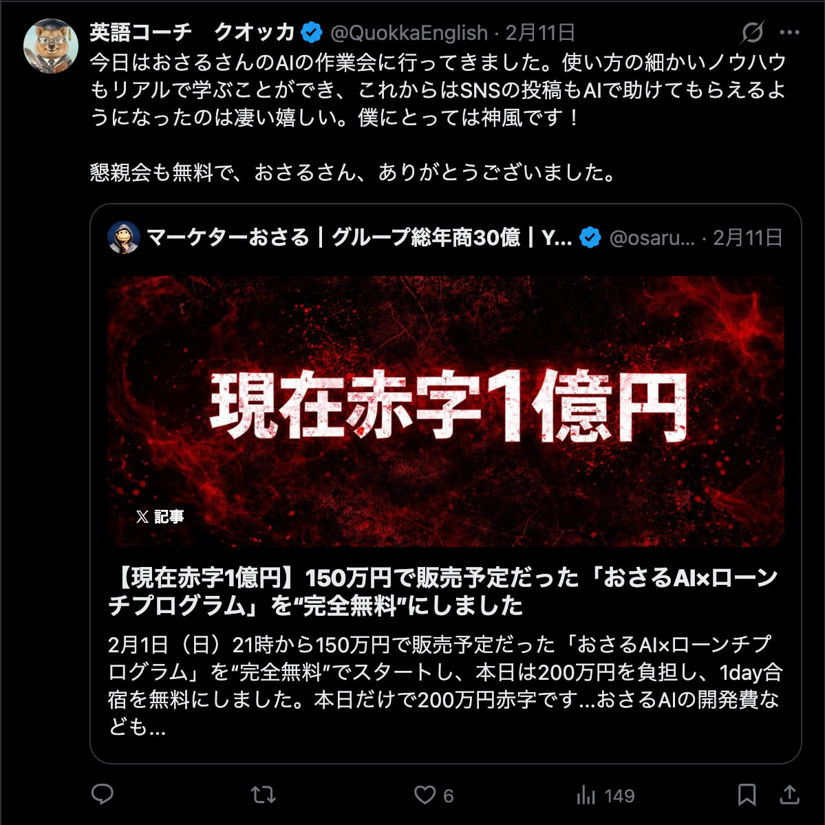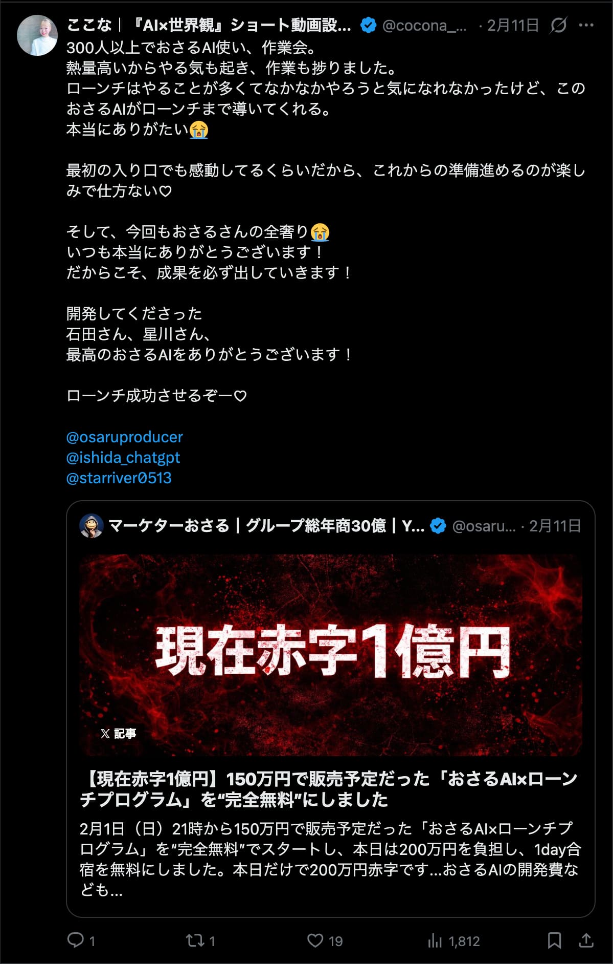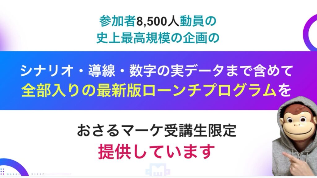 前回の時点で何百人もの成果につなげたローンチプログラムですが、今回はさらにおさるAIを加え、AIを使用してもっと効率的に、もっと精度高く、もっとスピーディにローンチを構築できるようになりました。