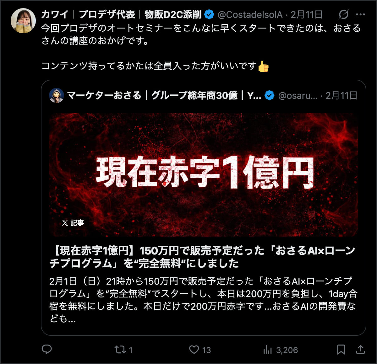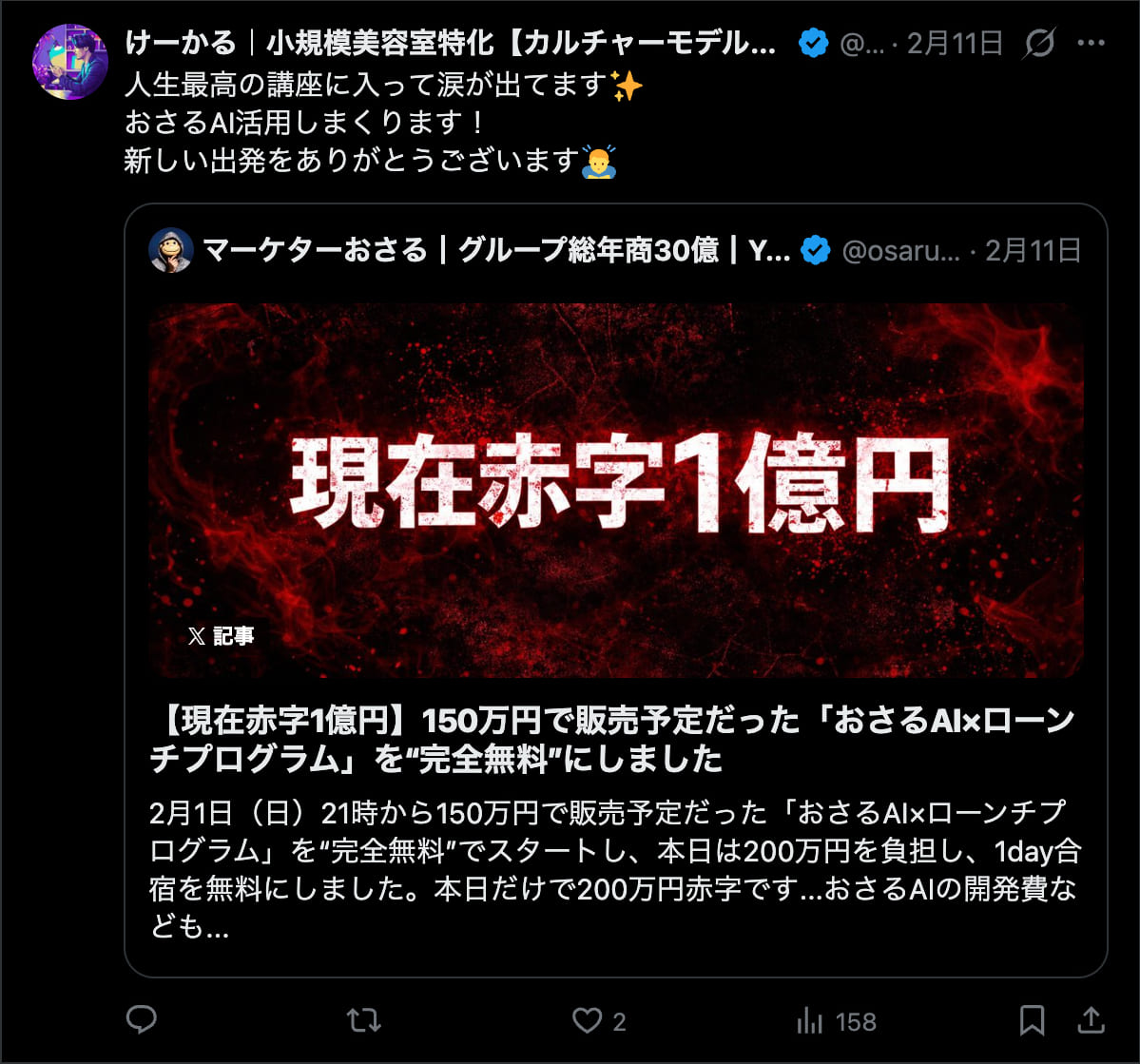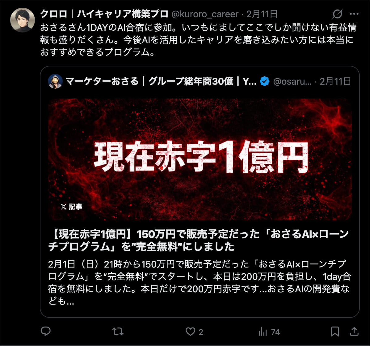 前回の時点で何百人もの成果につなげたローンチプログラムですが、今回はさらにおさるAIを加え、AIを使用してもっと効率的に、もっと精度高く、もっとスピーディにローンチを構築できるようになりました。