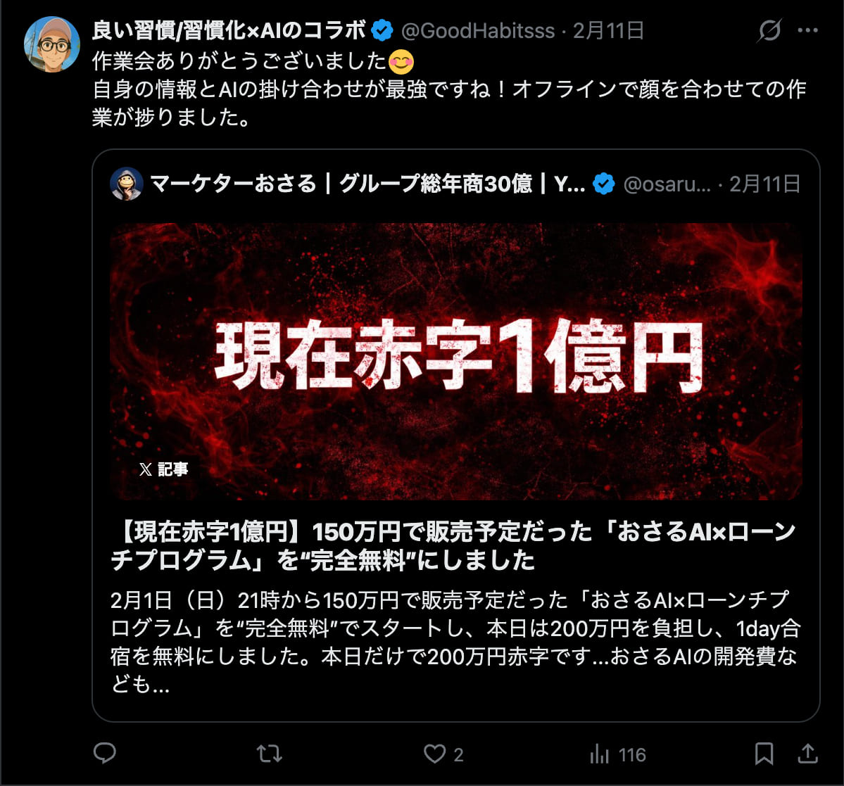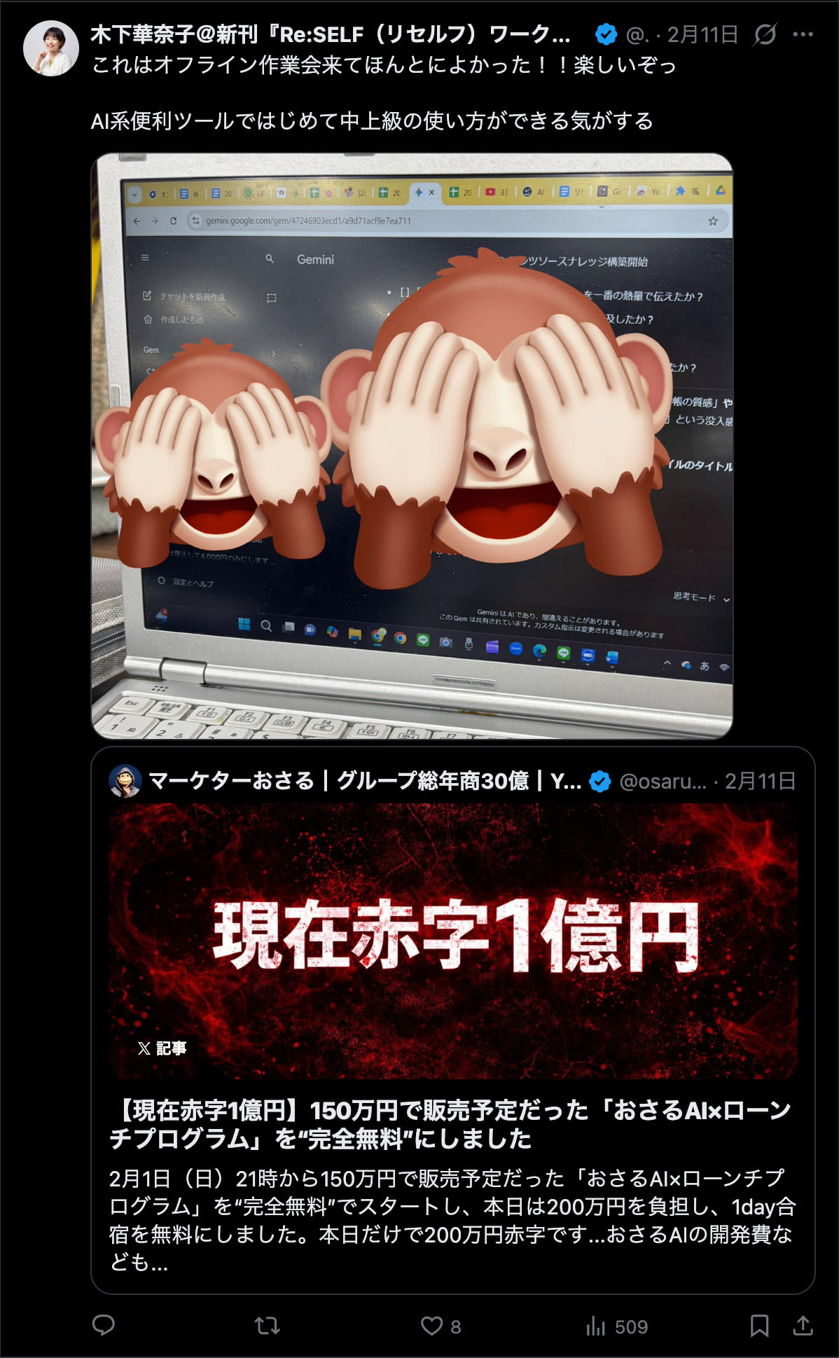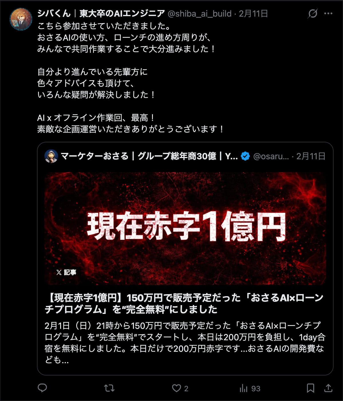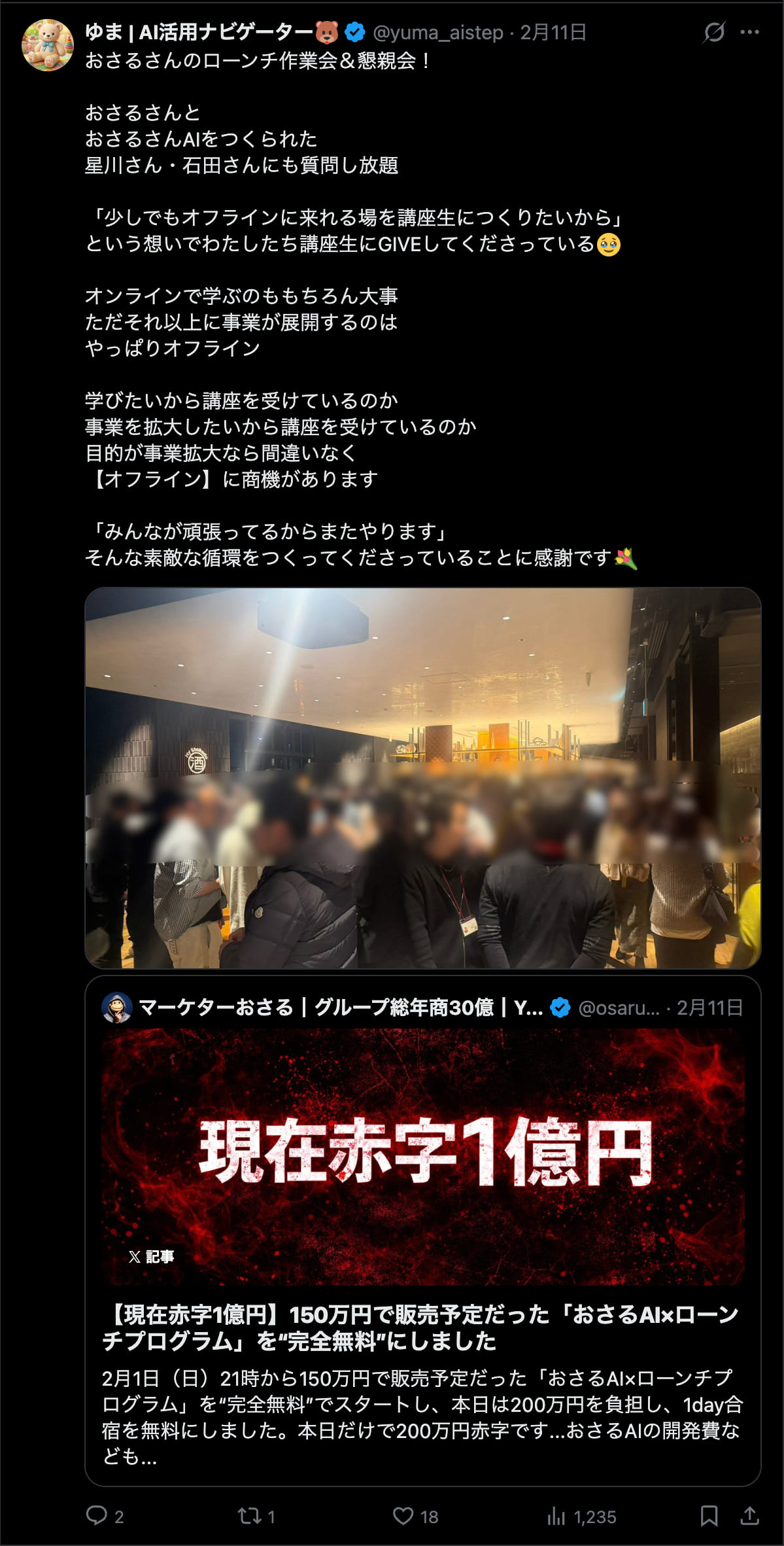 2026年2月11日(水)東京にて、オフラインの「おさるAI × ローンチプログラム1Day合宿」を開催しました。