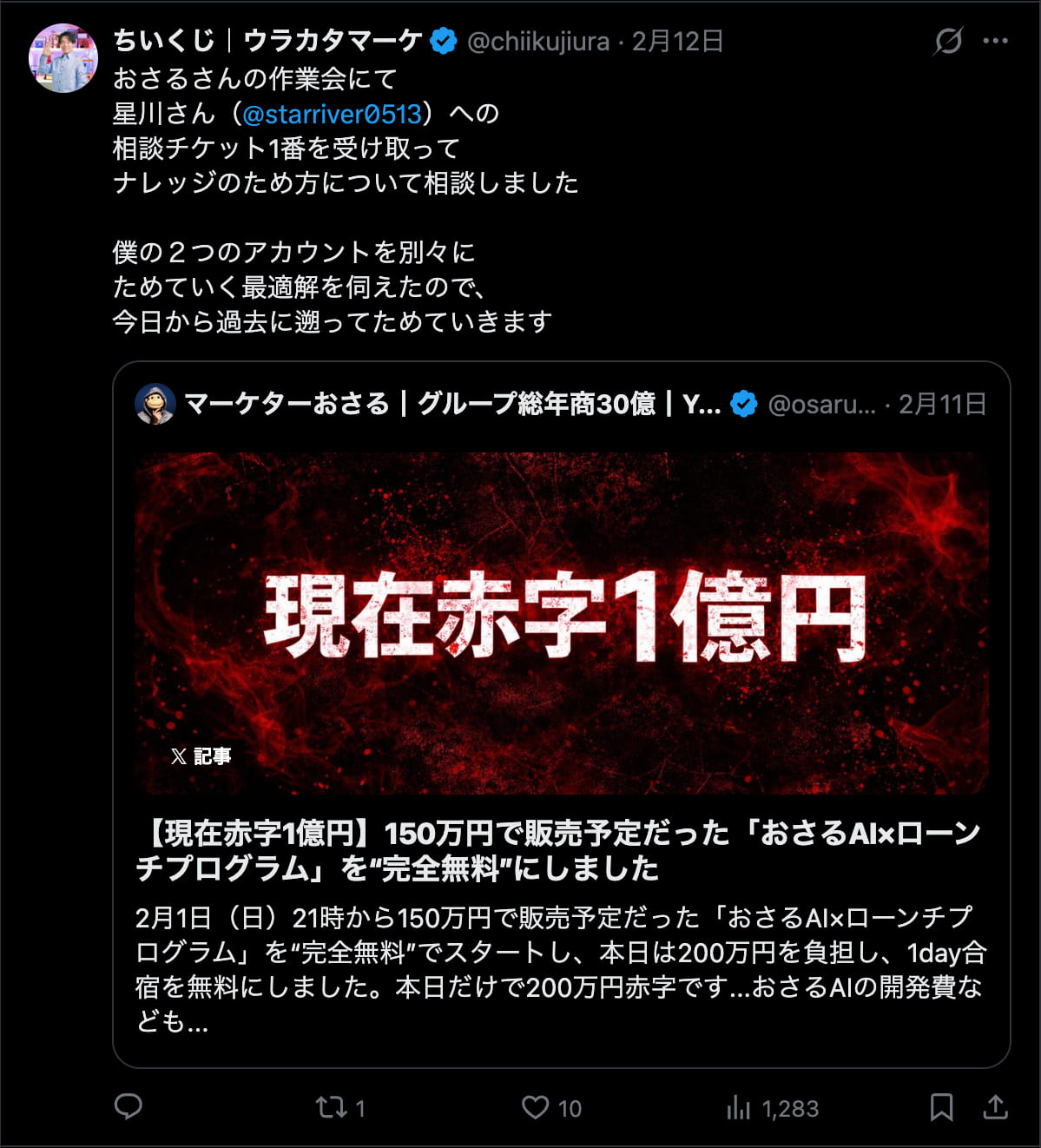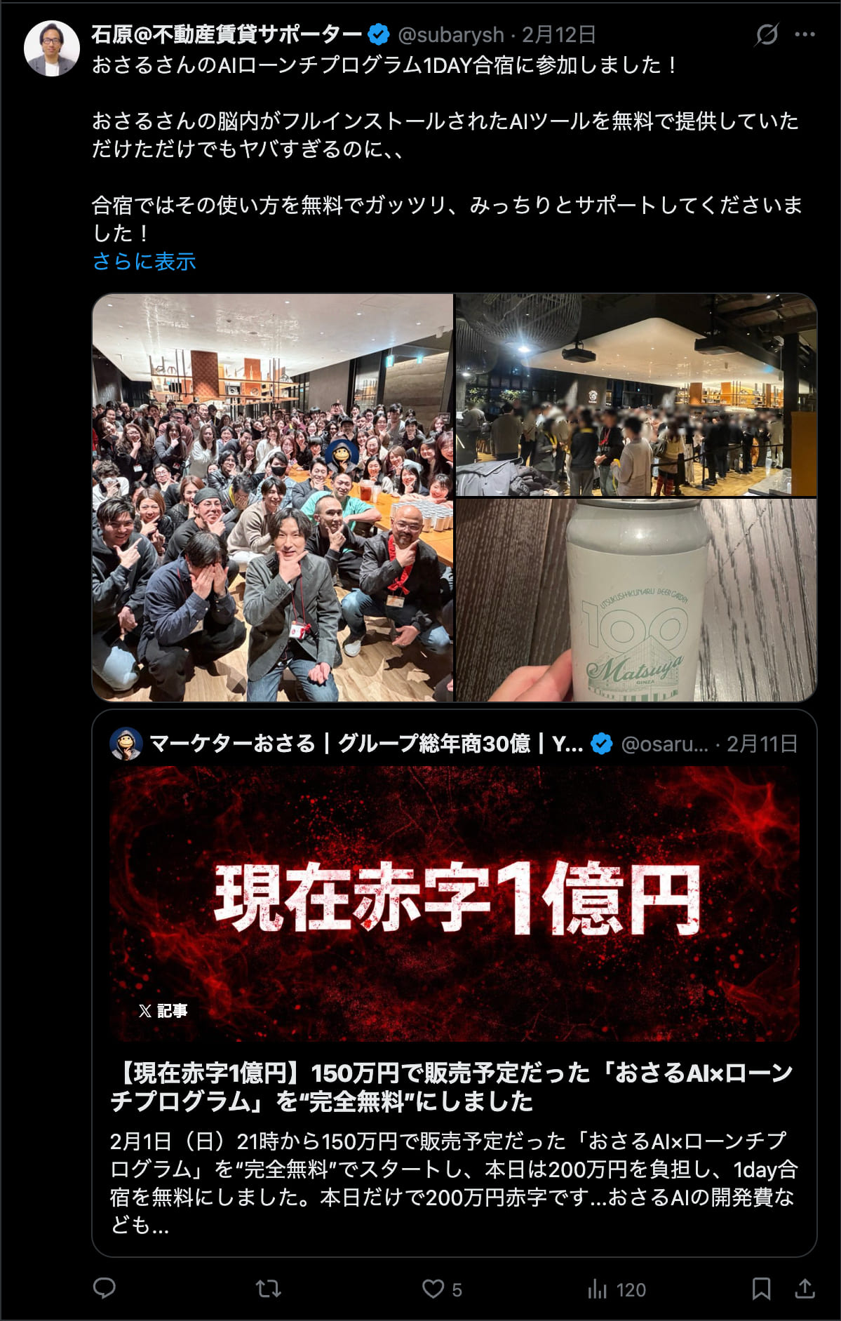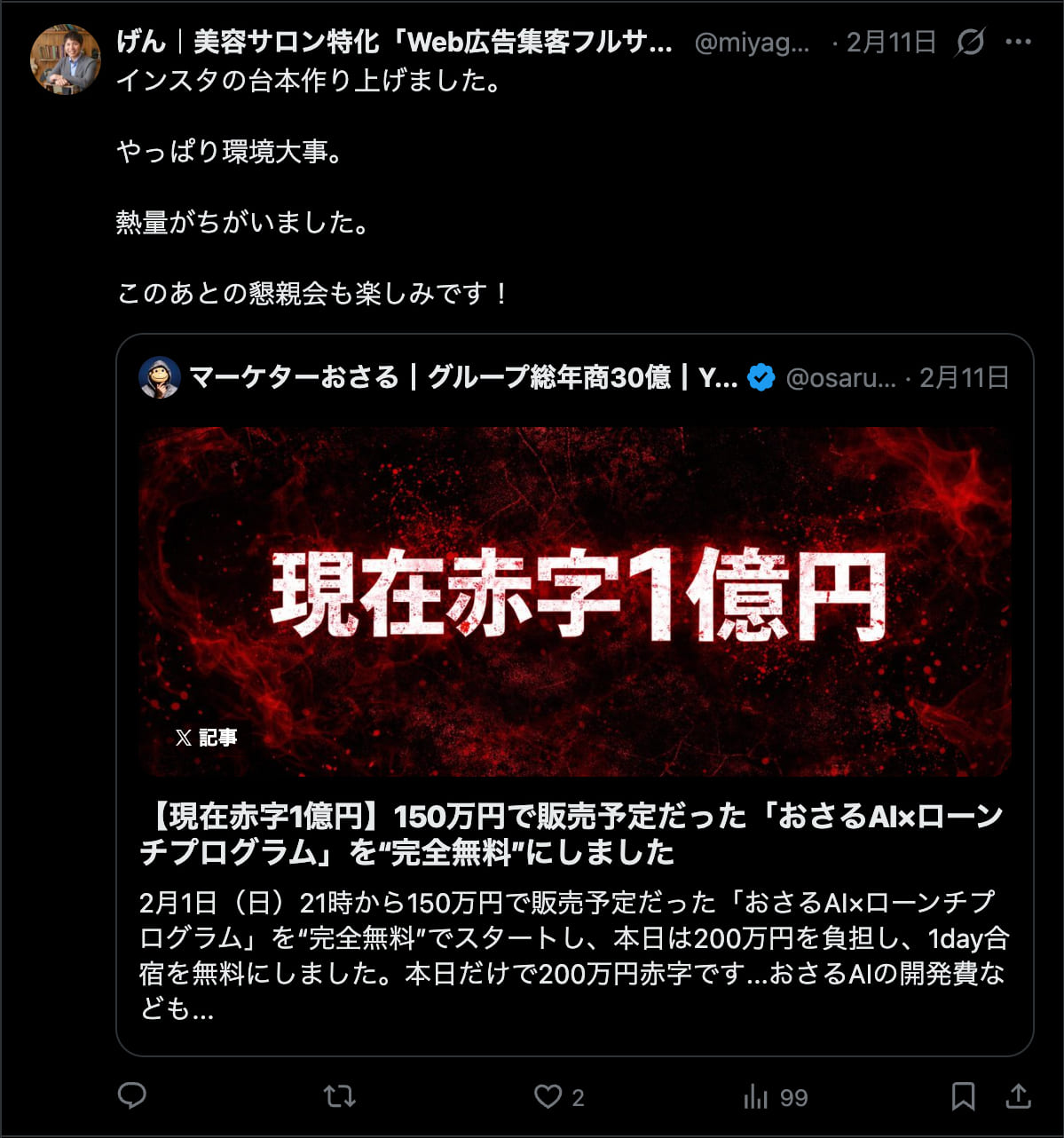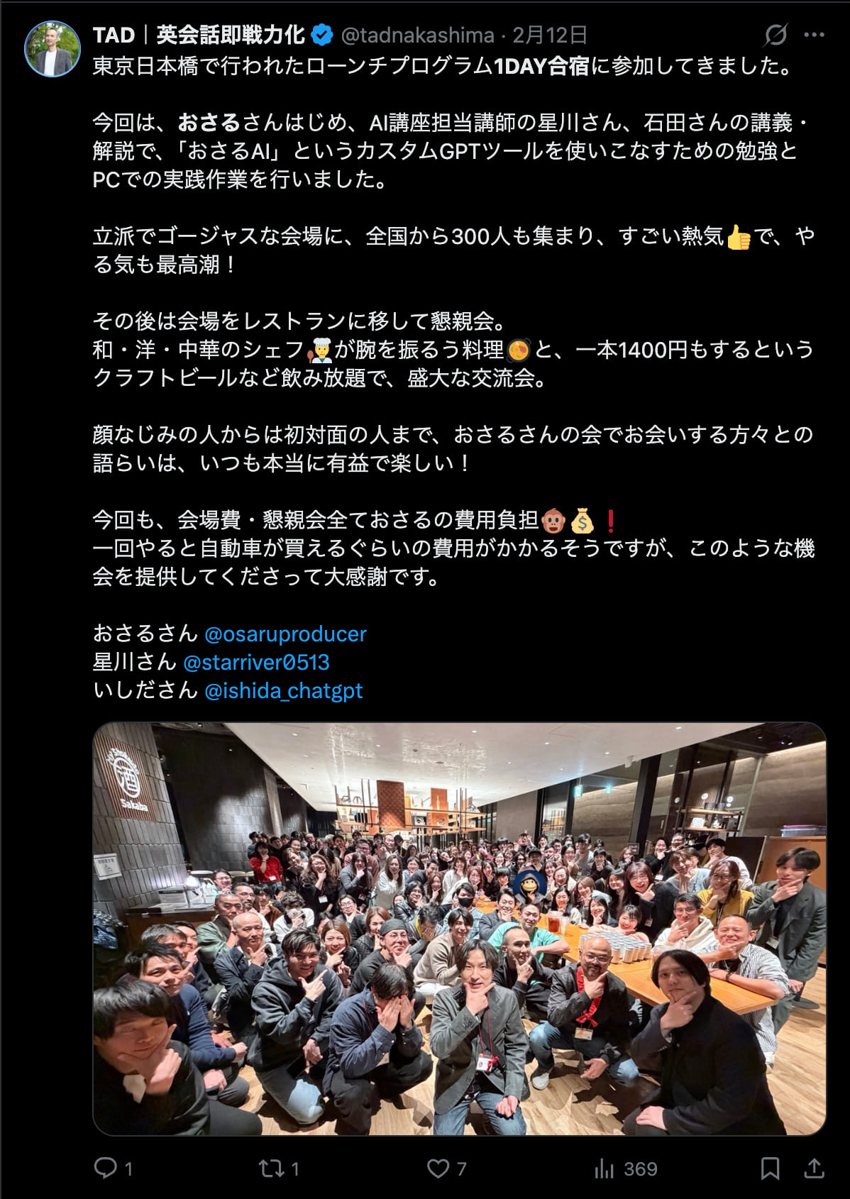 今回の1Day合宿では講師として、おさるAIを開発してくれた星川さんと石田さんのお2人を迎えました。どちらも僕の受講生でおさる式を熟知しており、コンテンツ販売やクライアントワークのスペシャリストです。