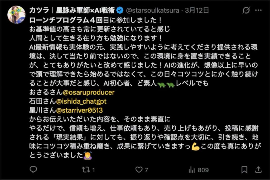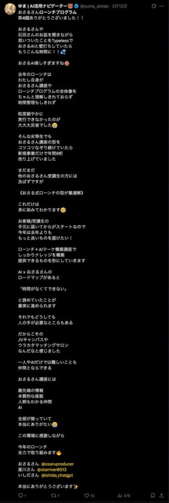 今の時代、ノウハウを知っているだけでは成果は出ません。おさるAIなどを活用し最後までやり切る状態を作ることが今の最大のチャンスです。今日からまた一緒に思考を広げて丁寧なビジネスを構築していきましょう。