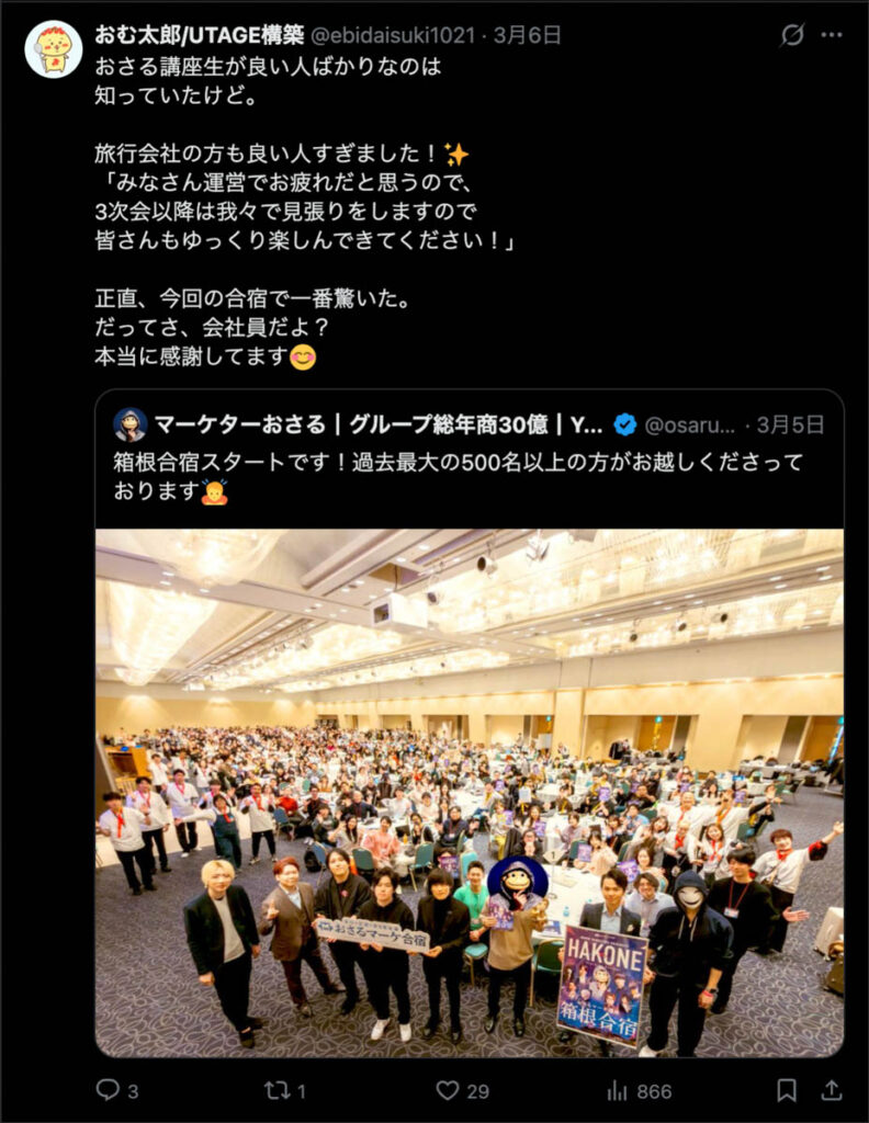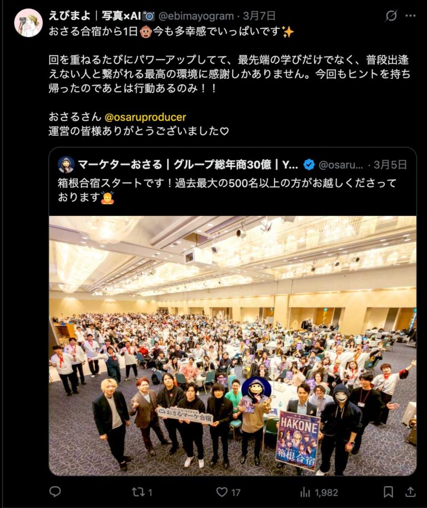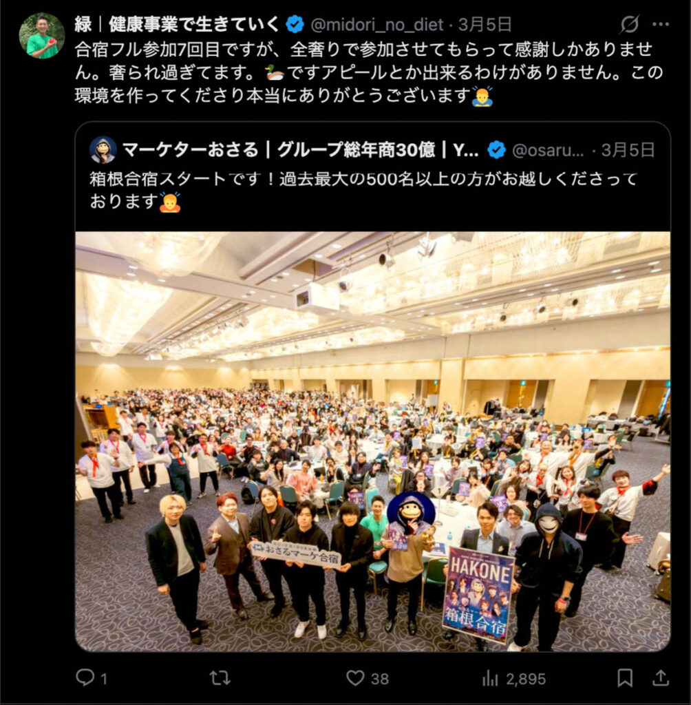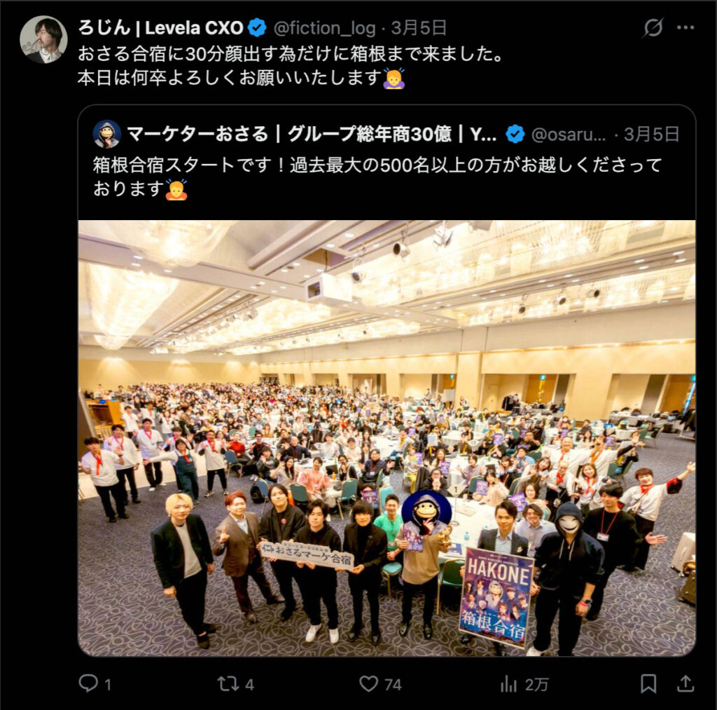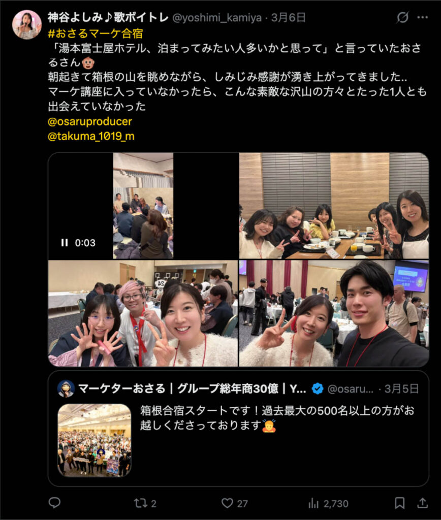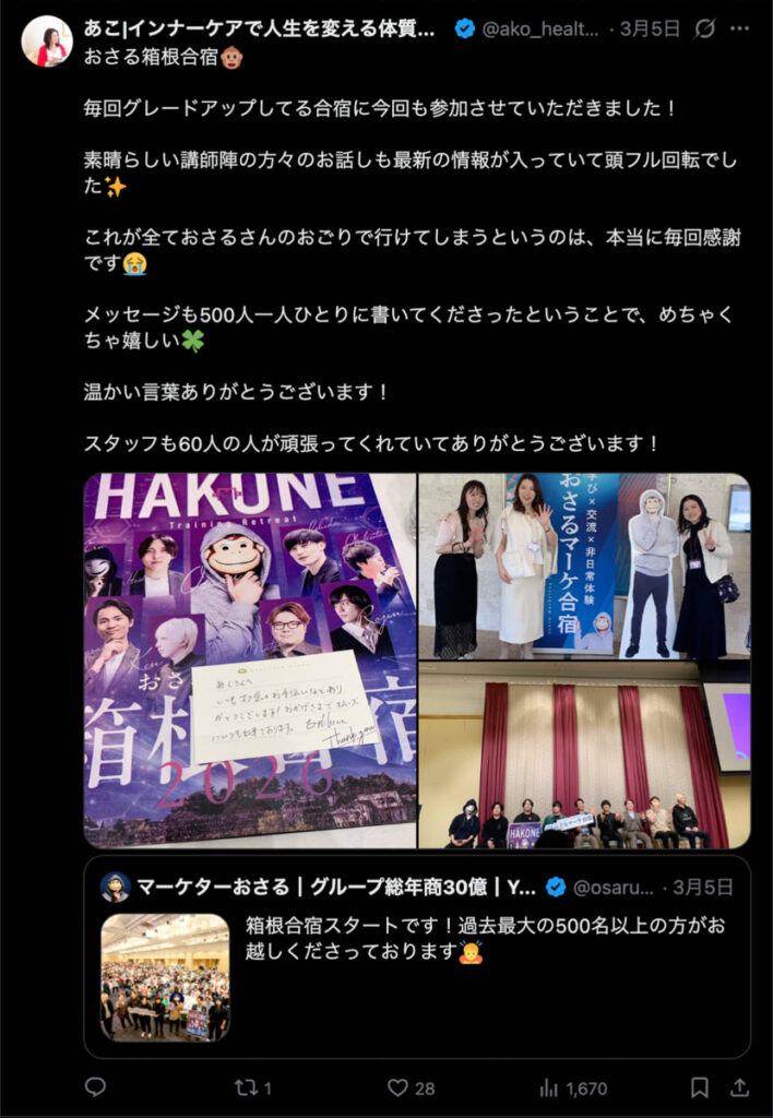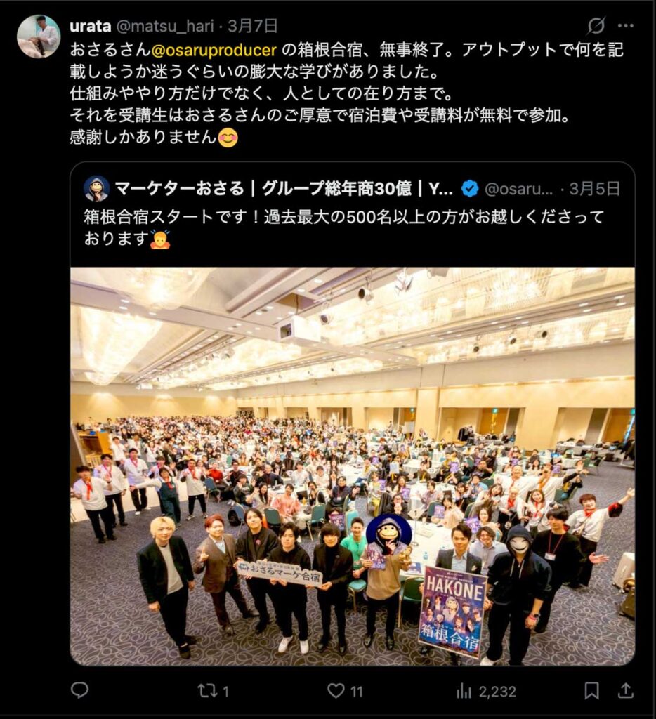 2026年3月5日-6日にかけて、箱根にて、おさるマーケ講座の合宿を開催しました。今回は過去最大規模の500名近い受講生を無料招待しました。
