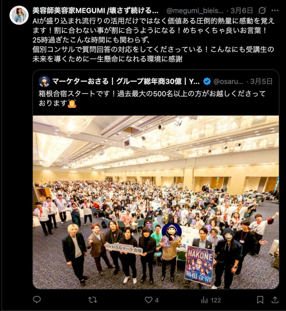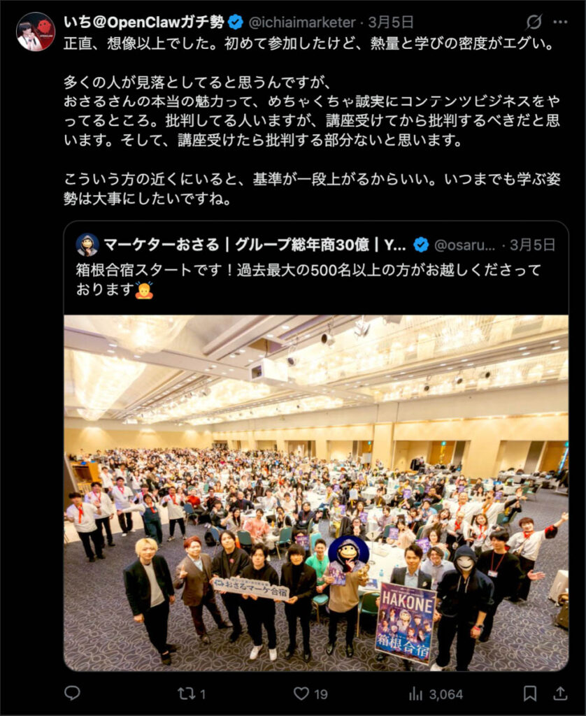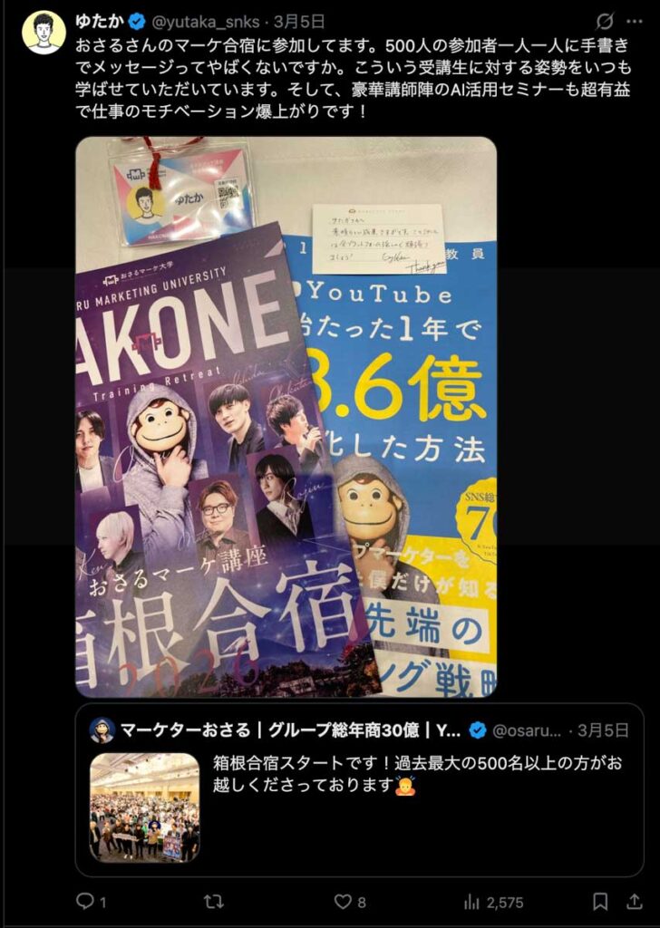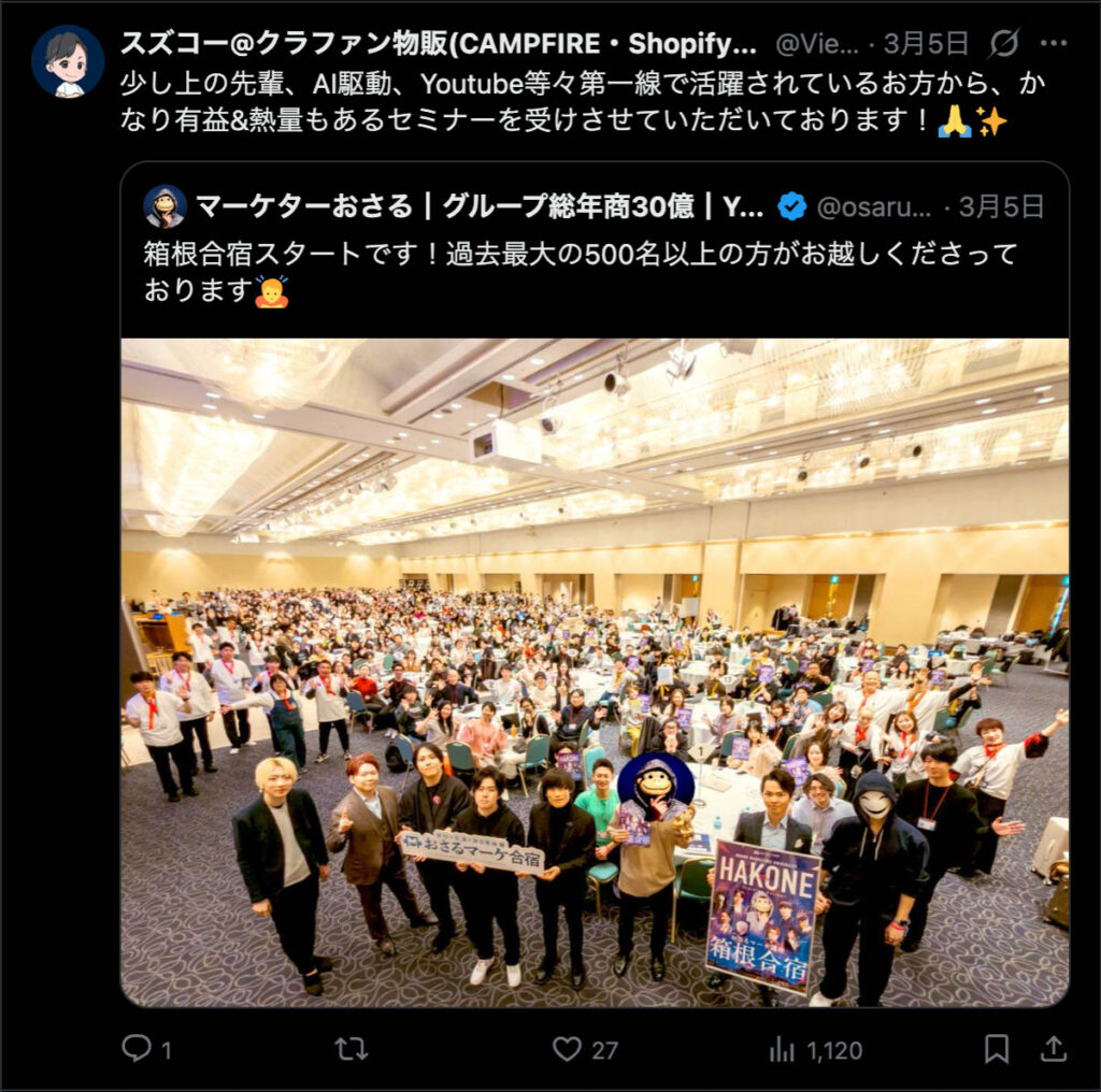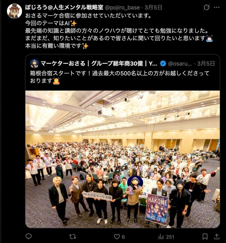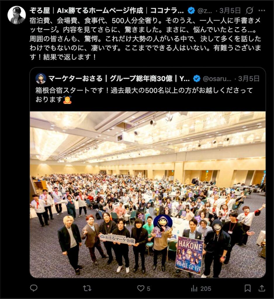 2026年3月5日-6日にかけて、箱根にて、おさるマーケ講座の合宿を開催しました。今回は過去最大規模の500名近い受講生を無料招待しました。