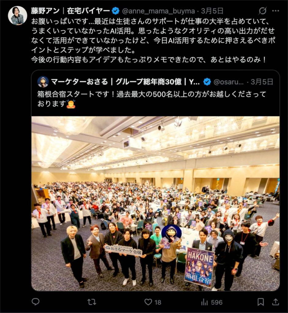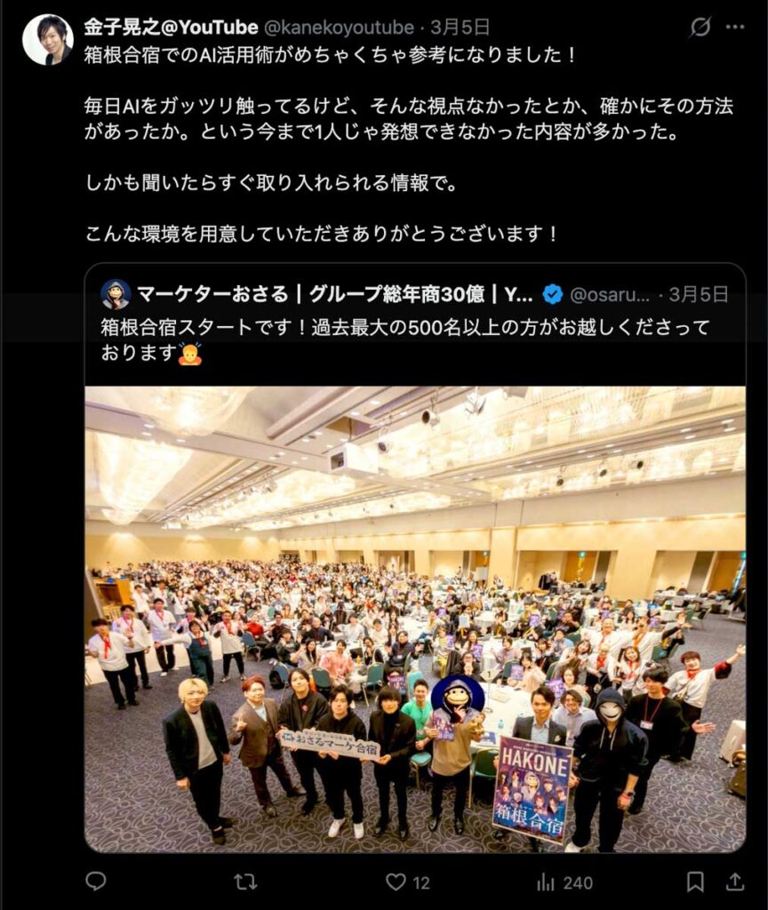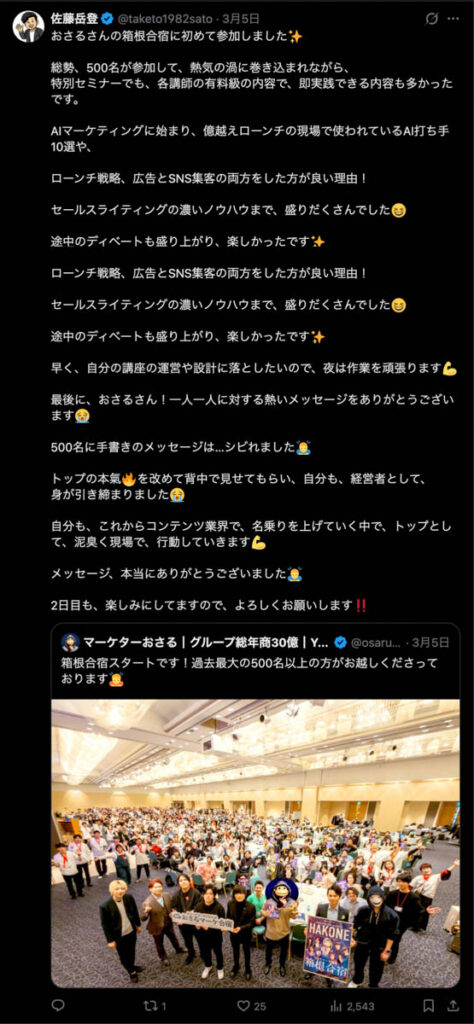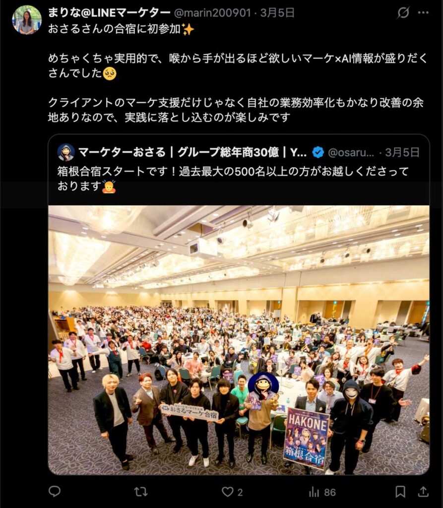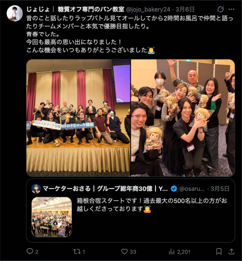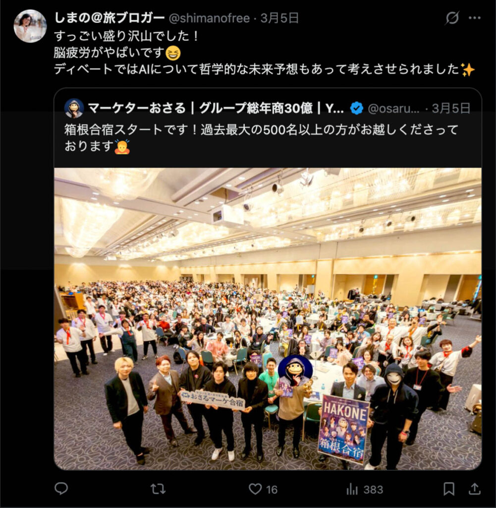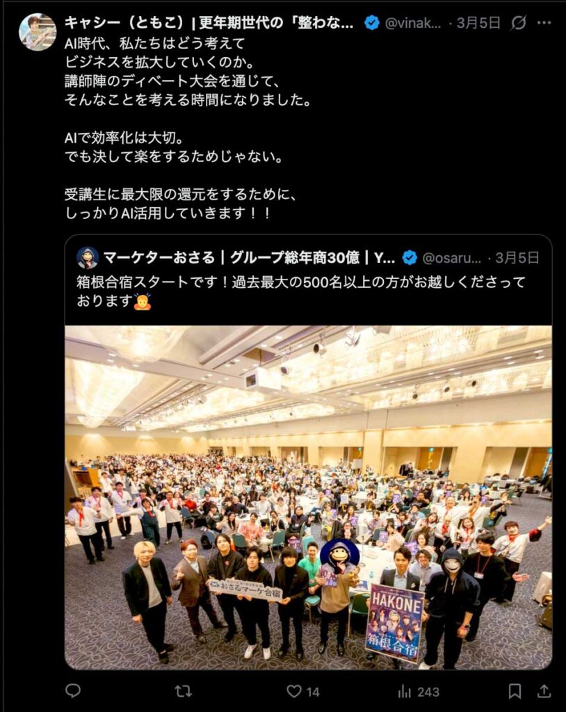 2026年3月5日-6日にかけて、箱根にて、おさるマーケ講座の合宿を開催しました。今回は過去最大規模の500名近い受講生を無料招待しました。