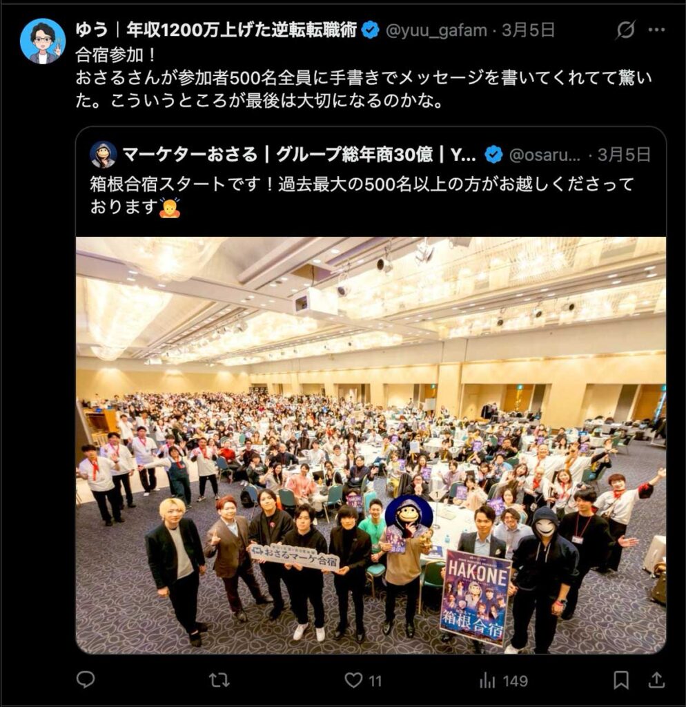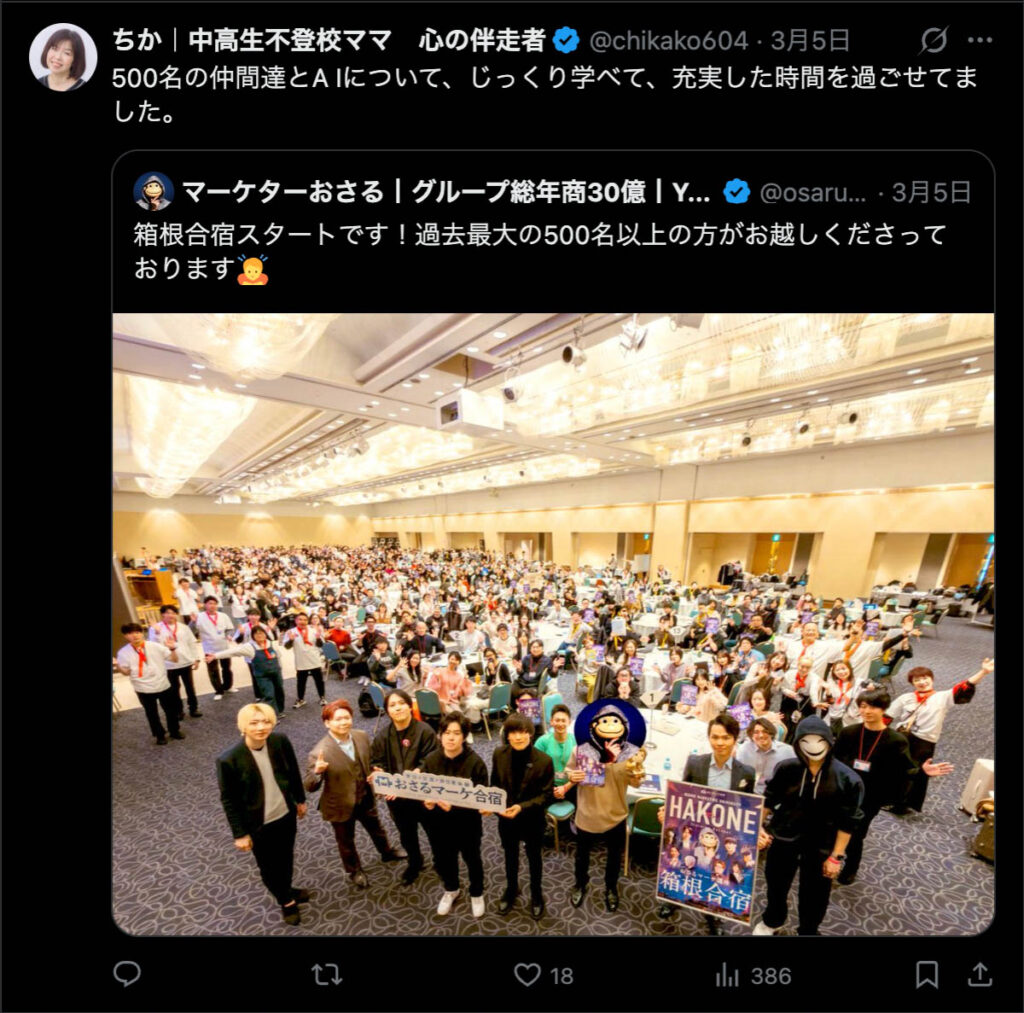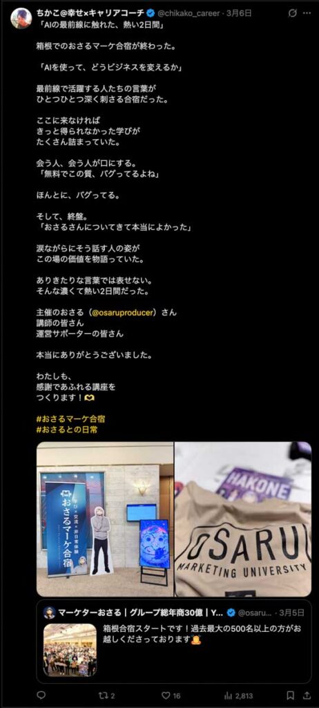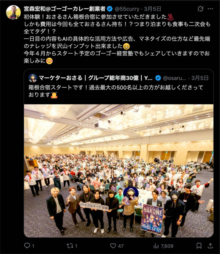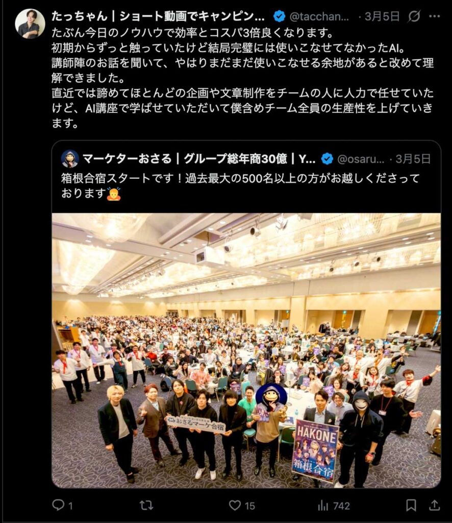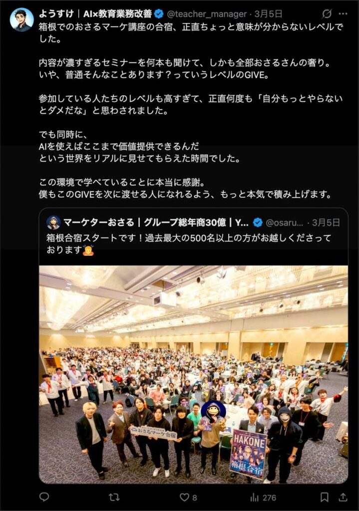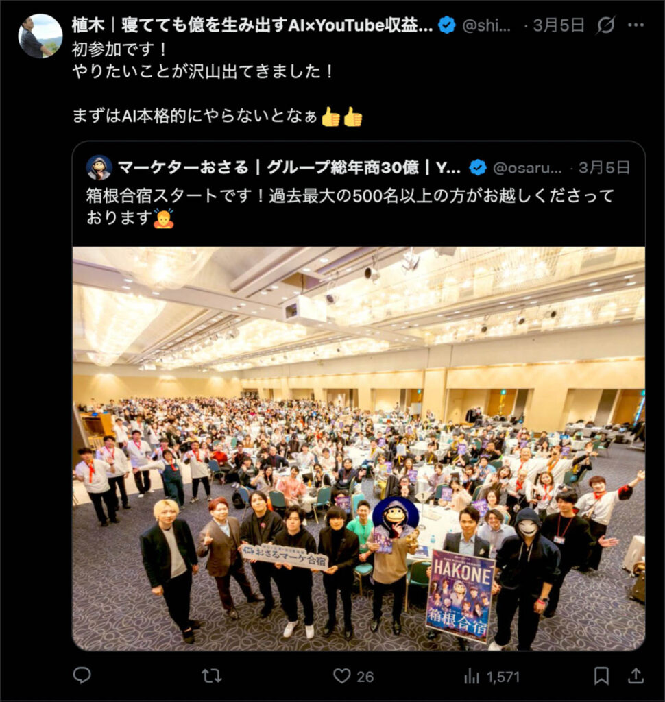 2026年3月5日-6日にかけて、箱根にて、おさるマーケ講座の合宿を開催しました。今回は過去最大規模の500名近い受講生を無料招待しました。