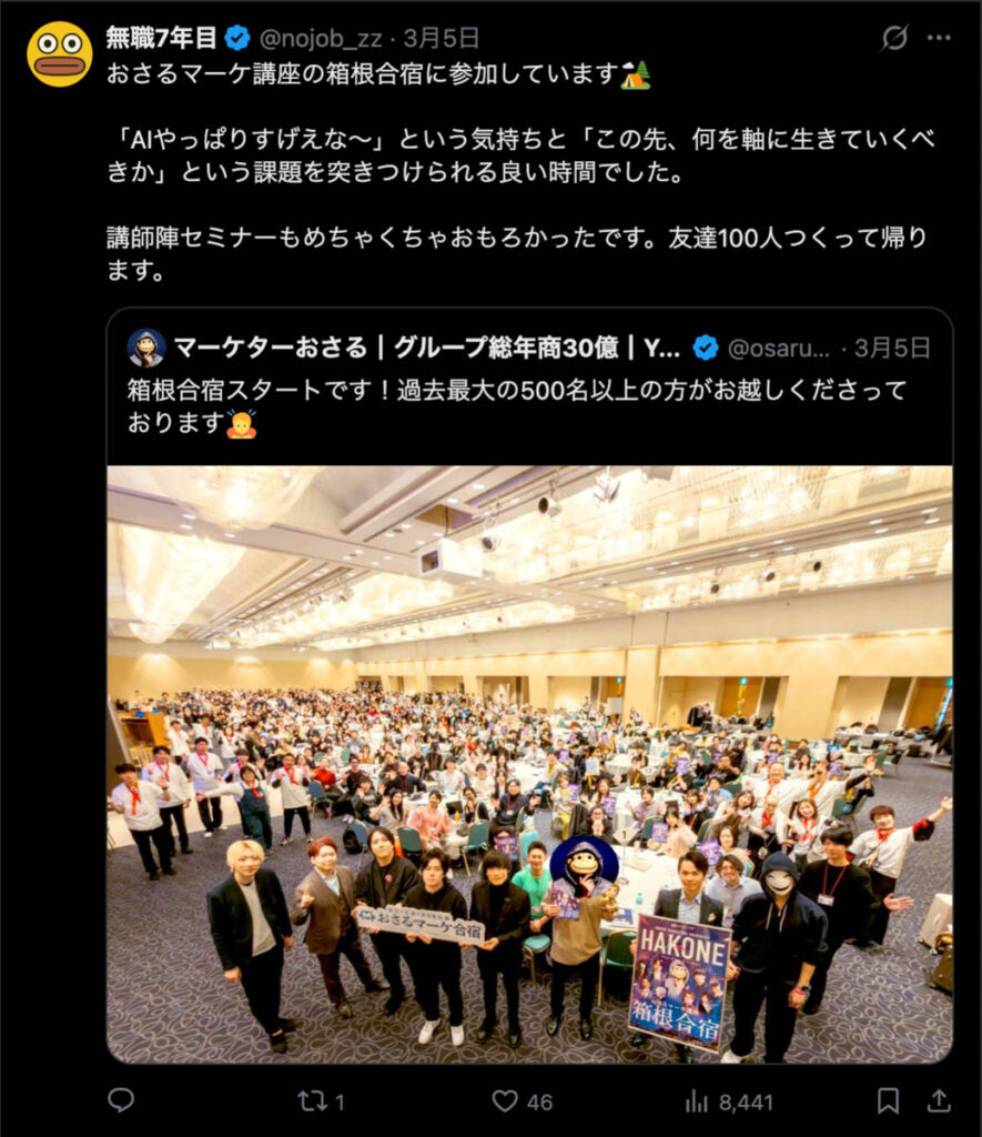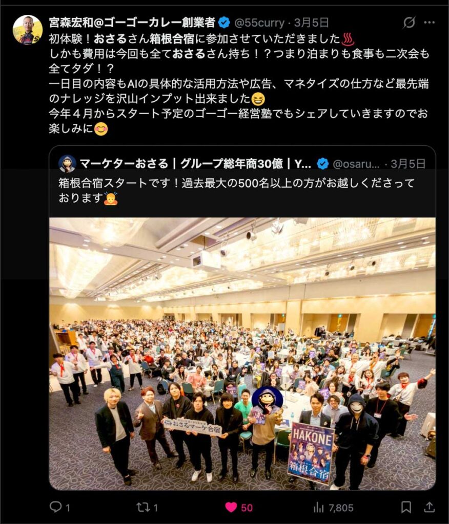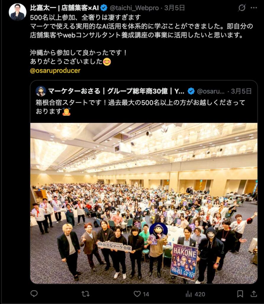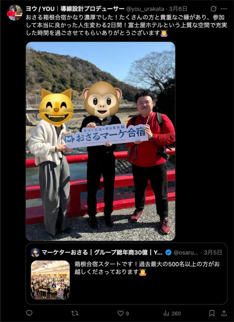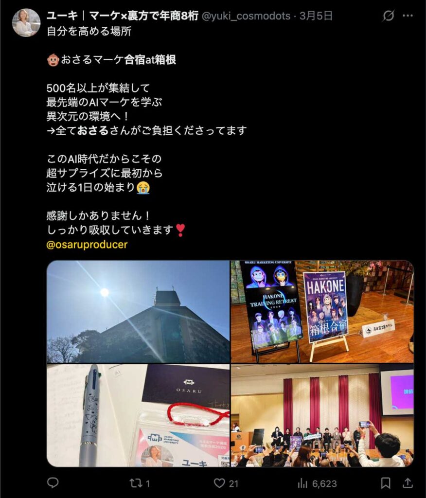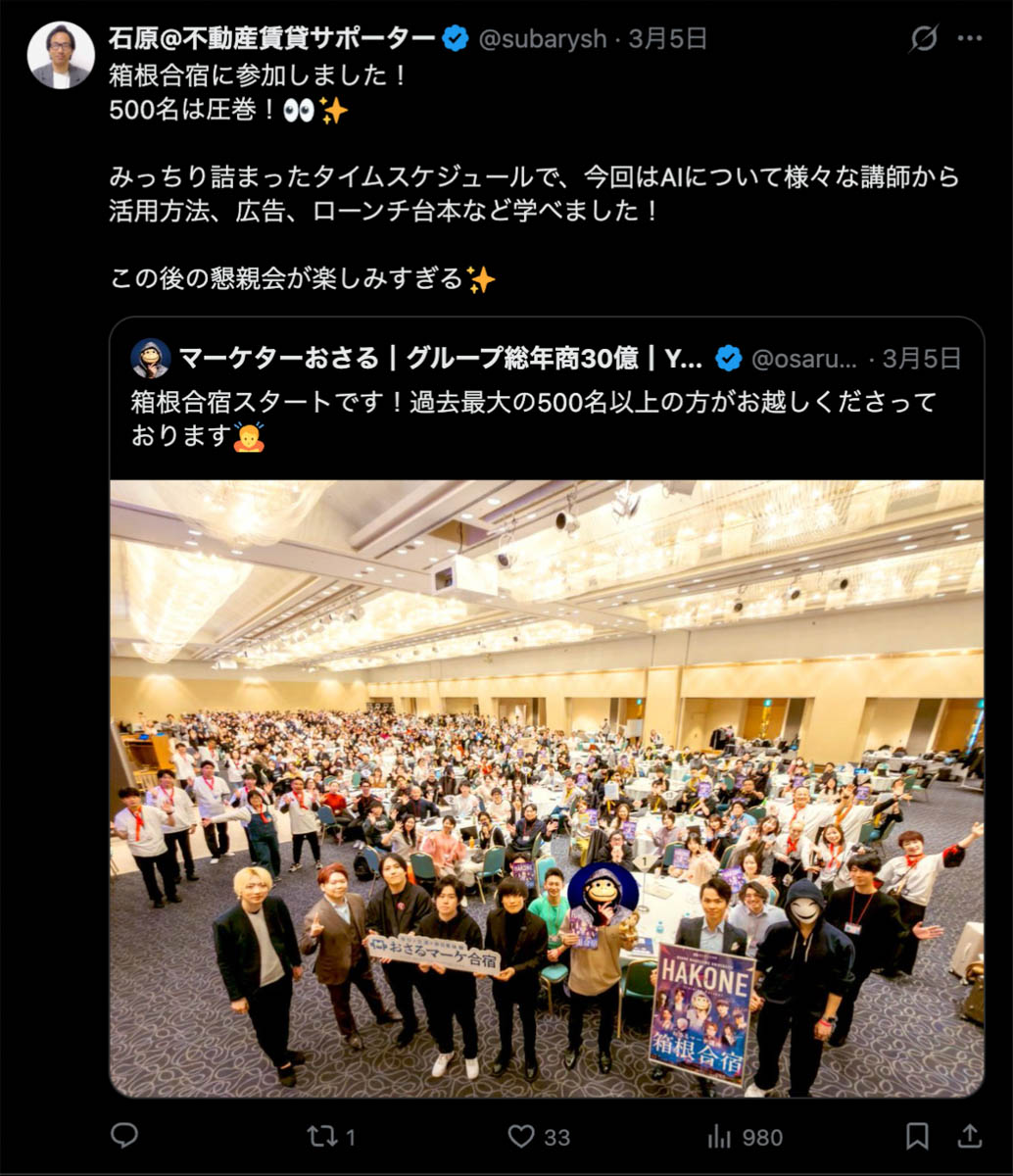 2026年3月5日-6日にかけて、箱根にて、おさるマーケ講座の合宿を開催しました。今回は過去最大規模の500名近い受講生を無料招待しました。