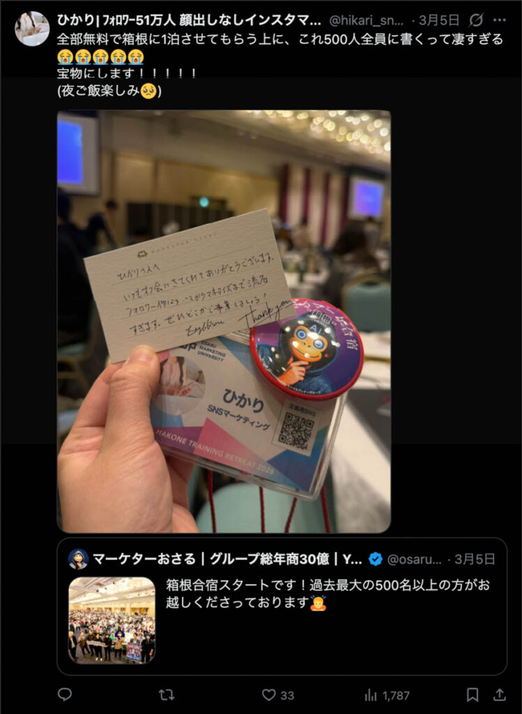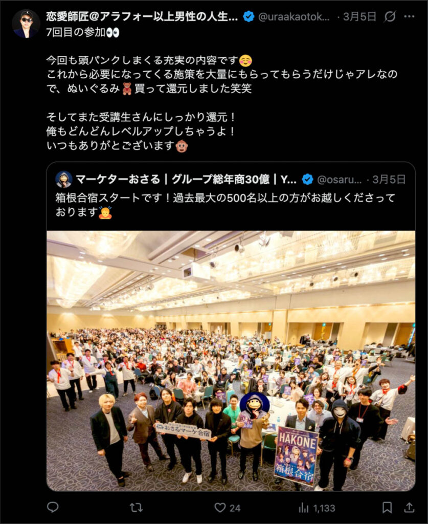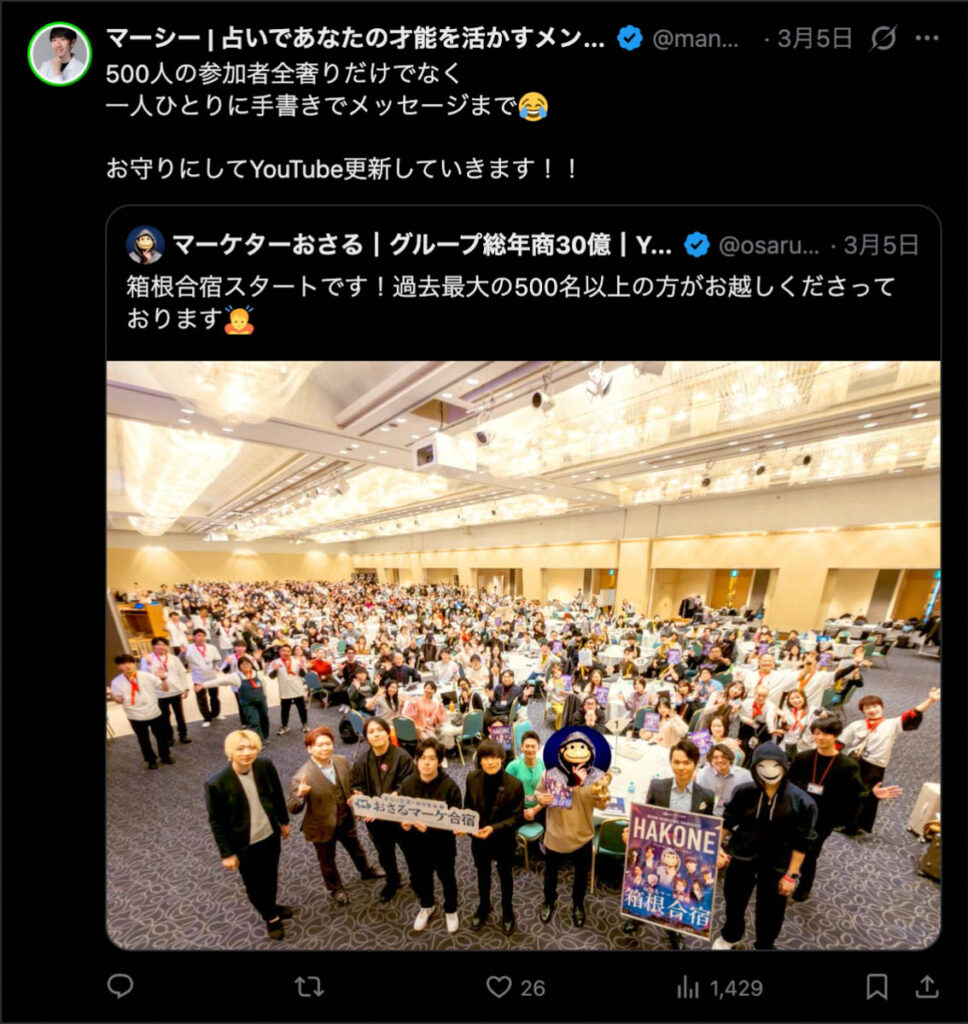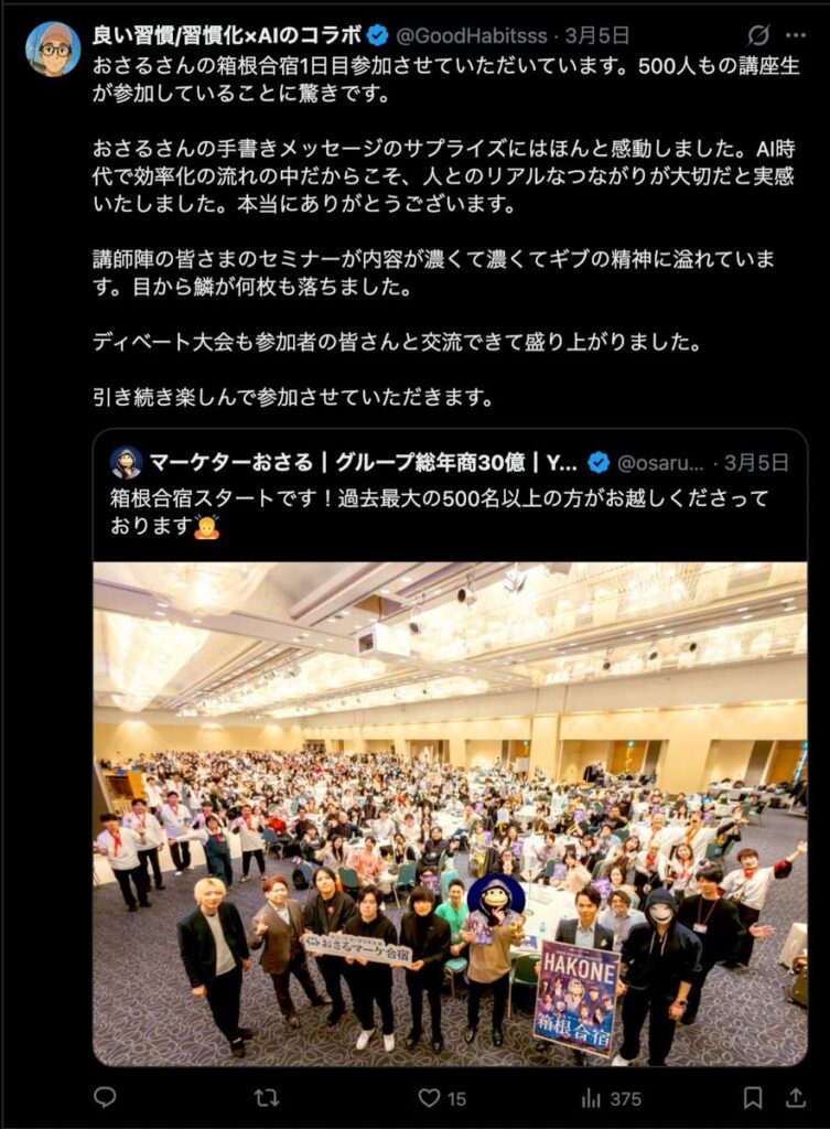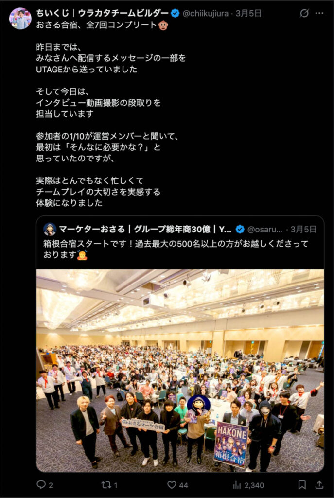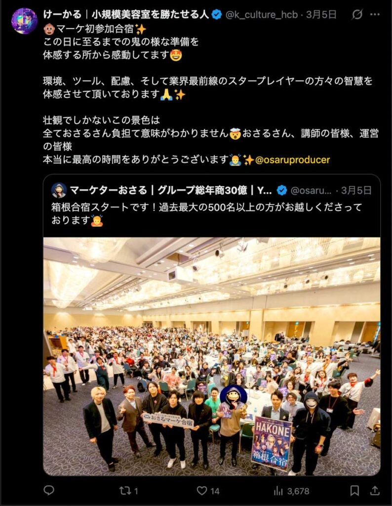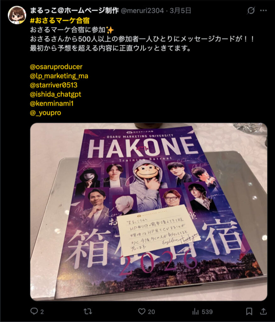 2026年3月5日-6日にかけて、箱根にて、おさるマーケ講座の合宿を開催しました。今回は過去最大規模の500名近い受講生を無料招待しました。