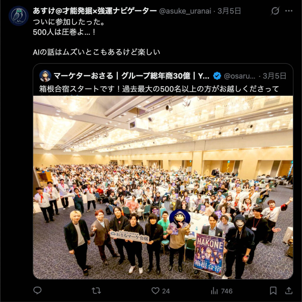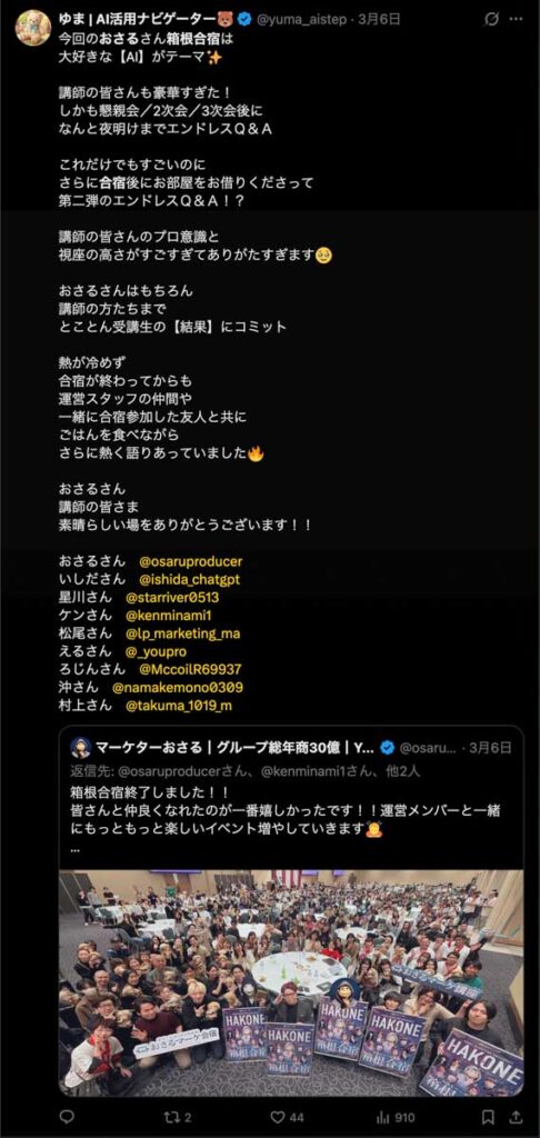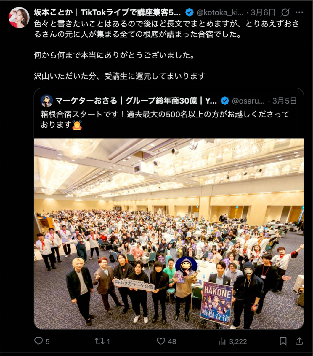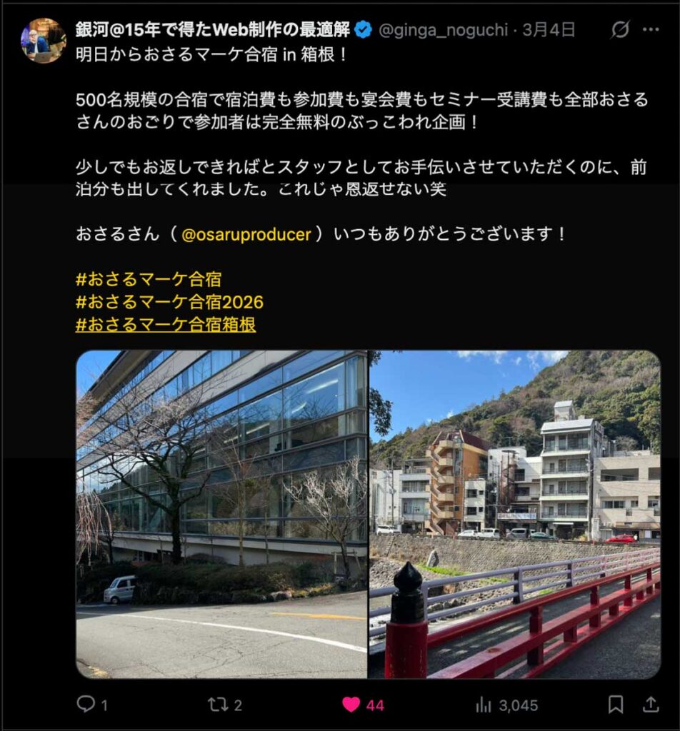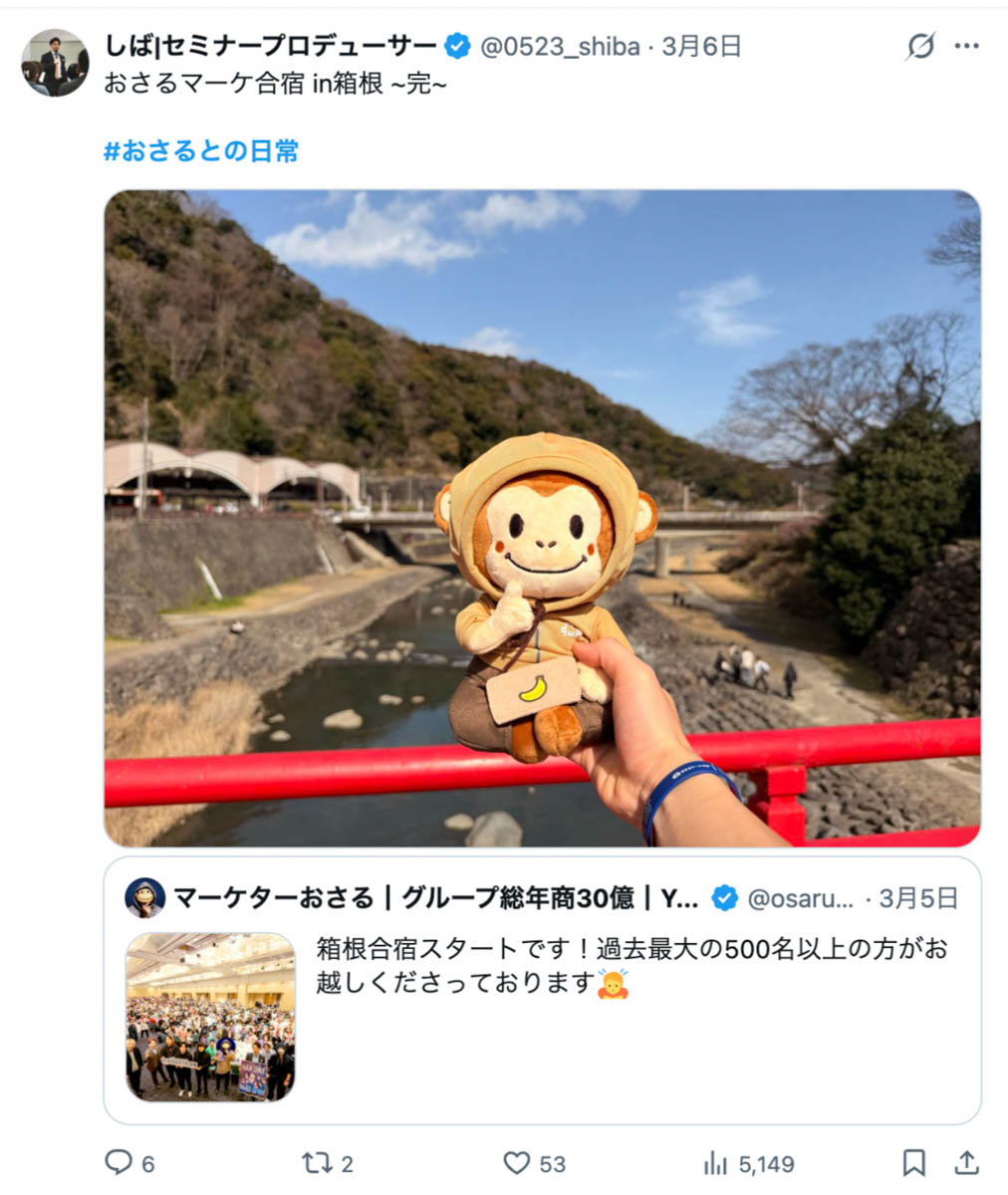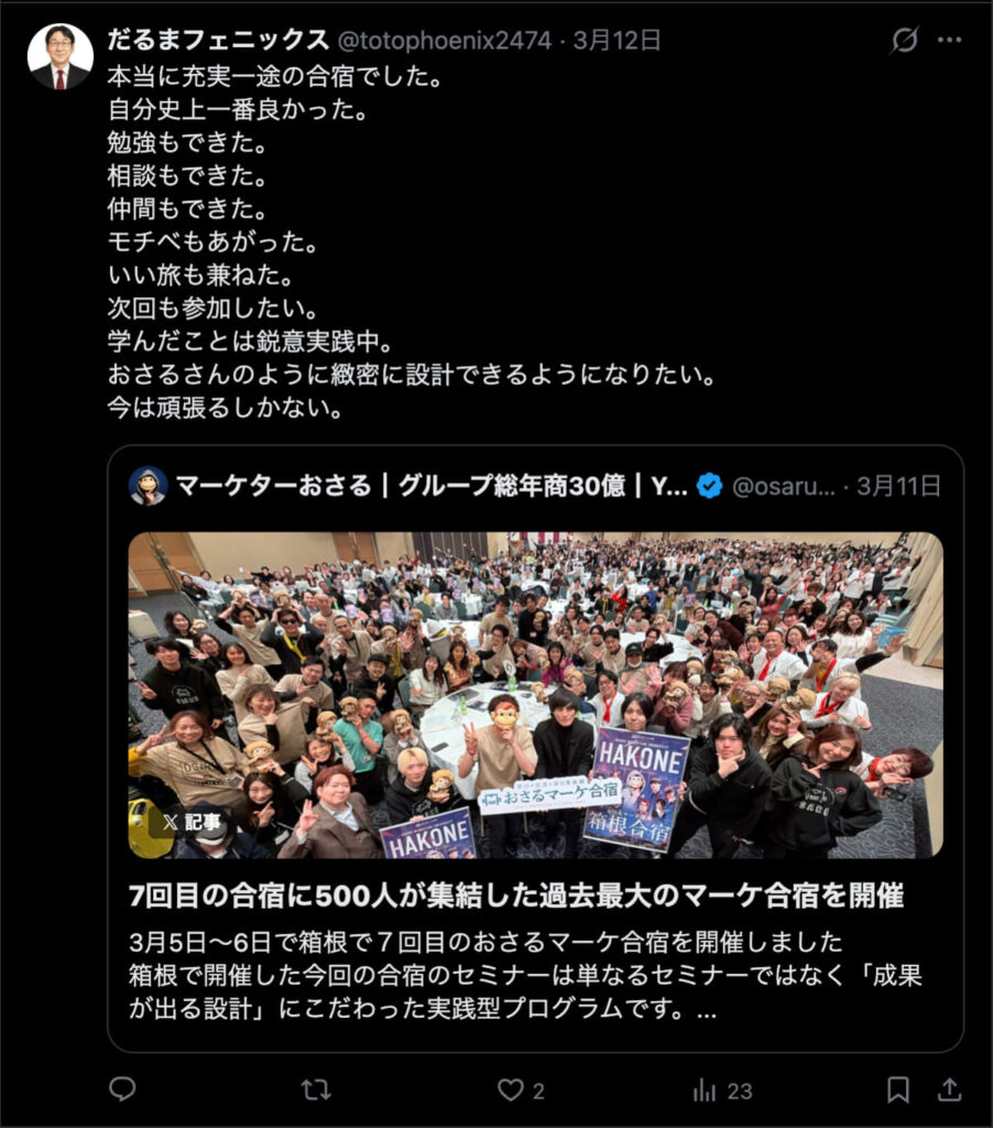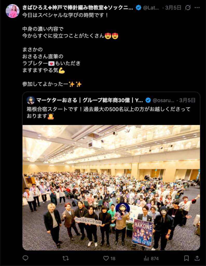 2026年3月5日-6日にかけて、箱根にて、おさるマーケ講座の合宿を開催しました。今回は過去最大規模の500名近い受講生を無料招待しました。