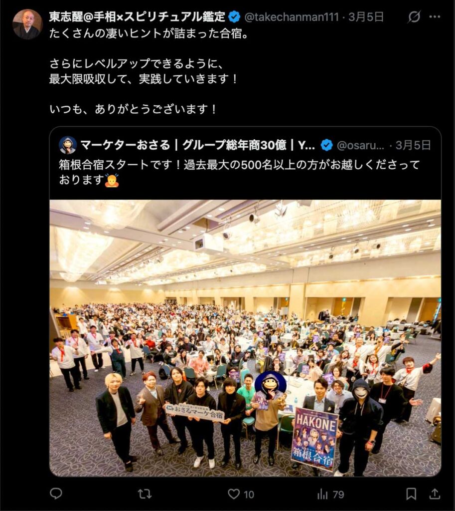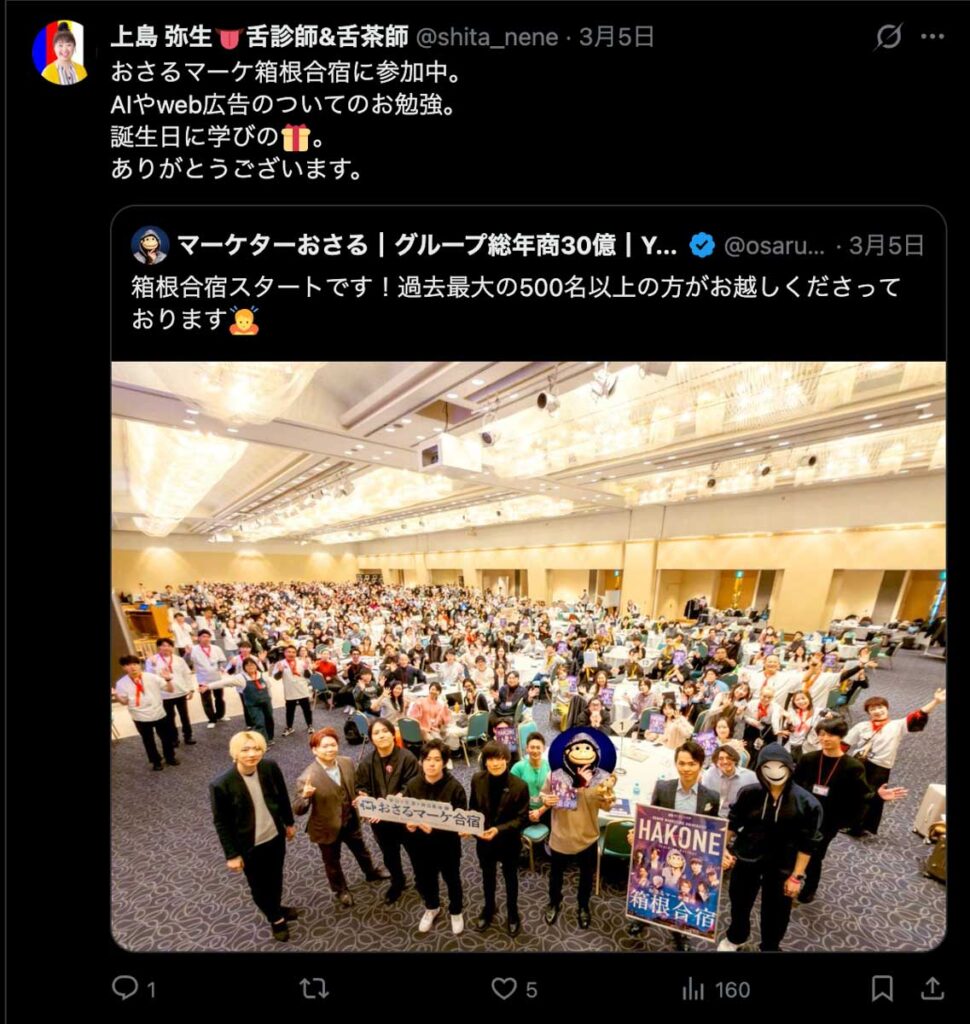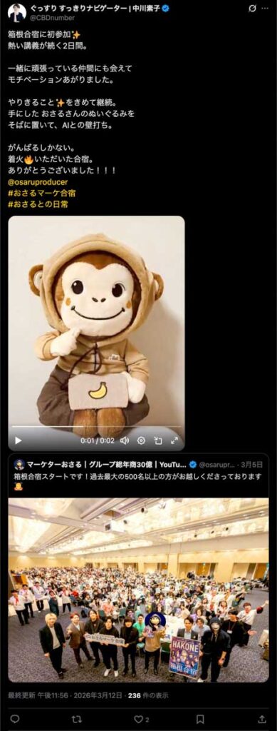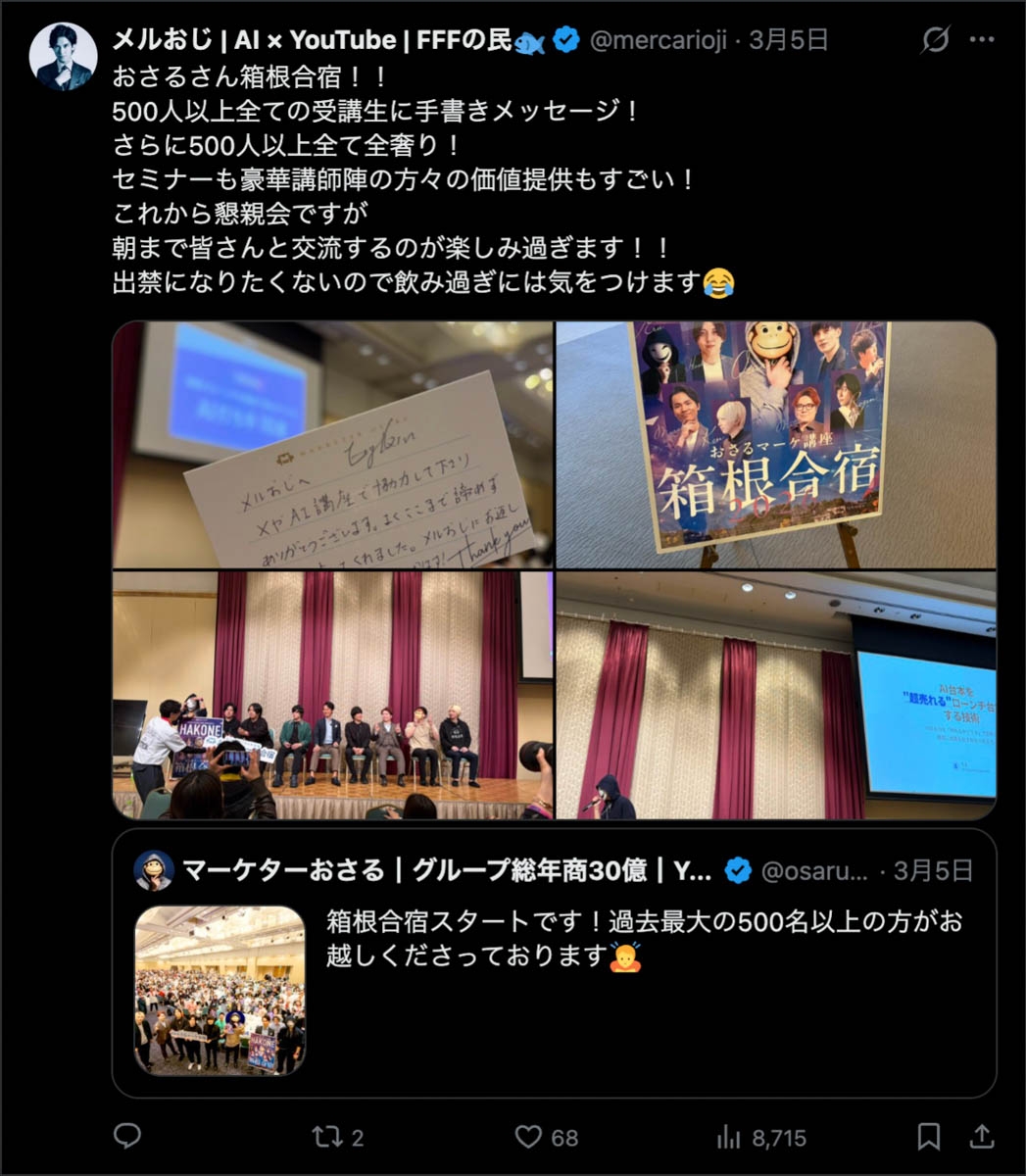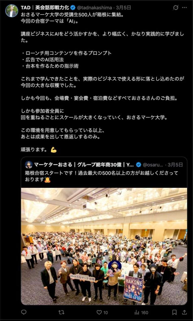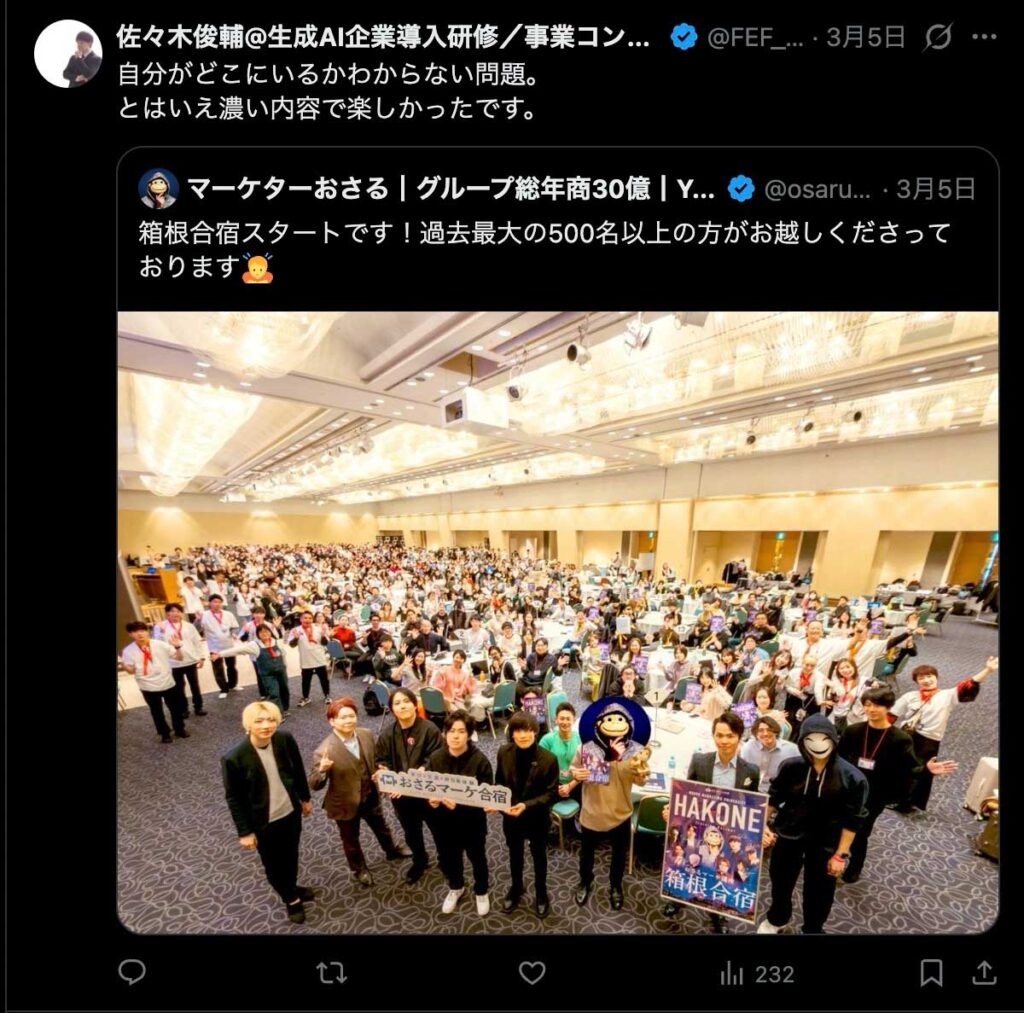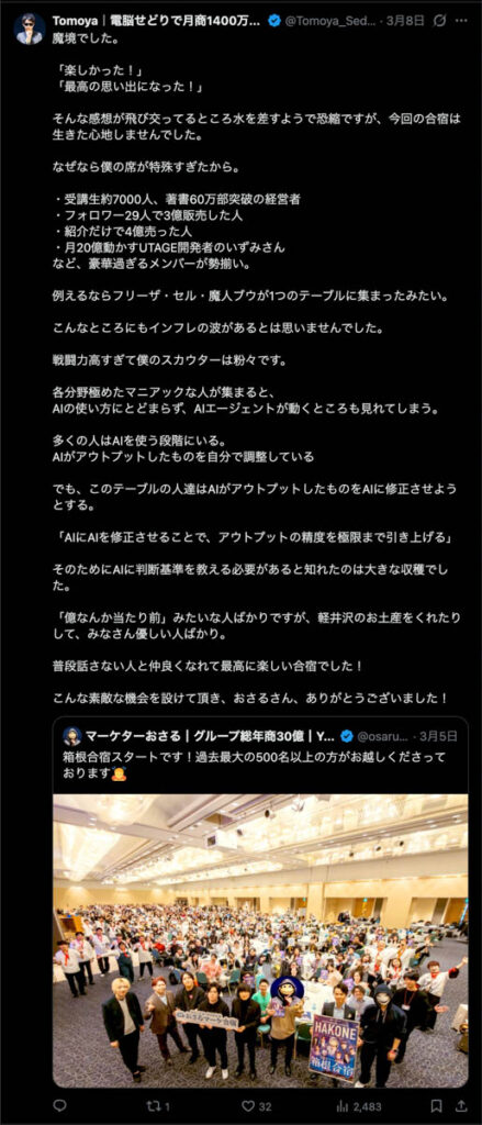 2026年3月5日-6日にかけて、箱根にて、おさるマーケ講座の合宿を開催しました。今回は過去最大規模の500名近い受講生を無料招待しました。