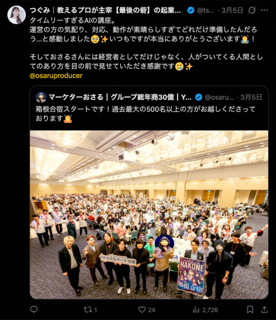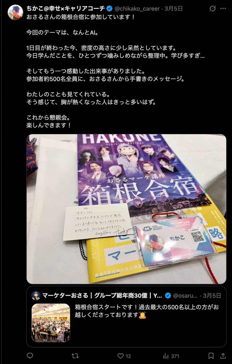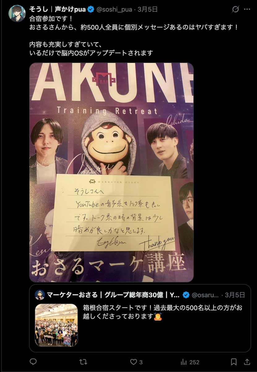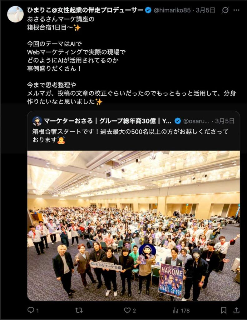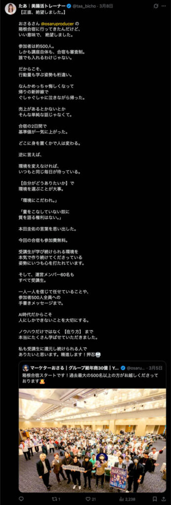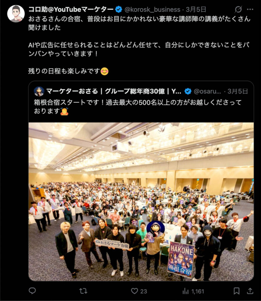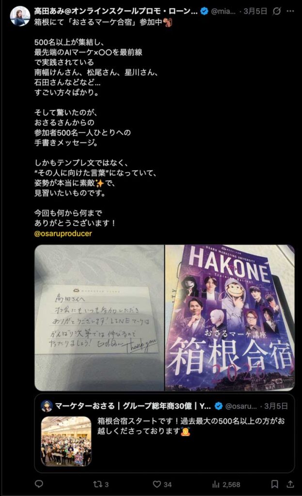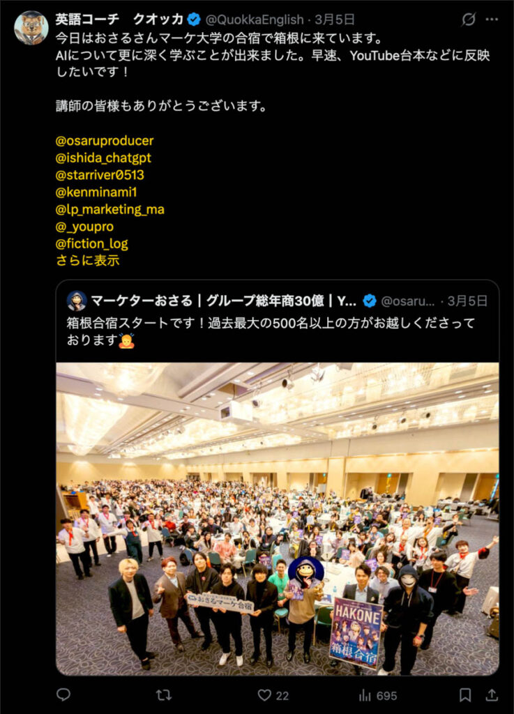 2026年3月5日-6日にかけて、箱根にて、おさるマーケ講座の合宿を開催しました。今回は過去最大規模の500名近い受講生を無料招待しました。