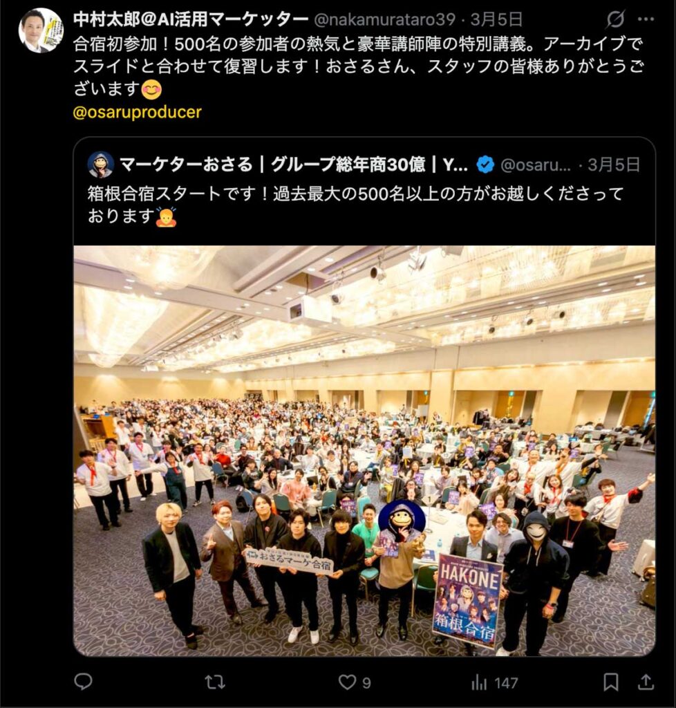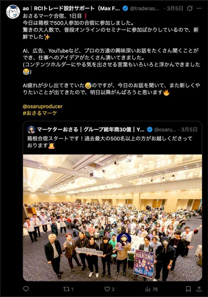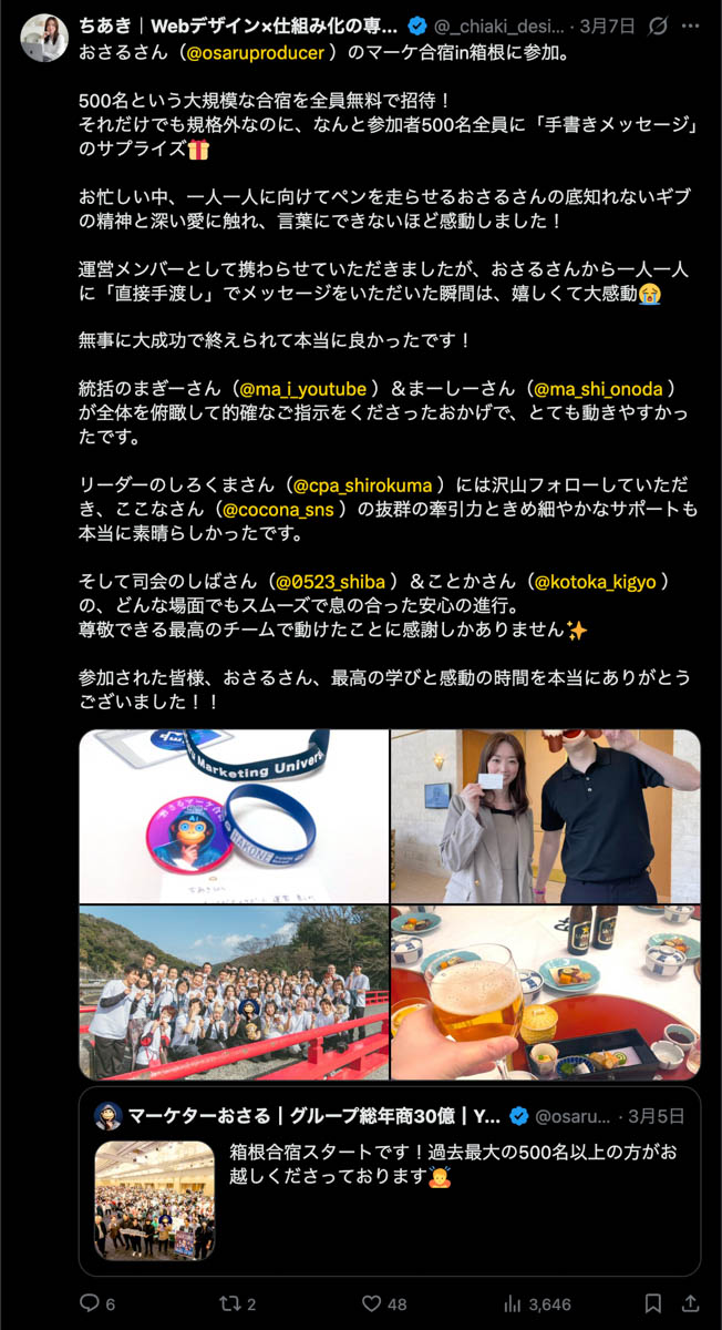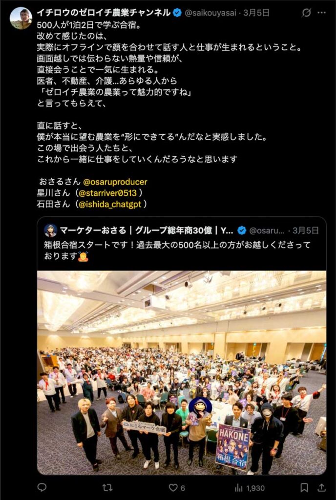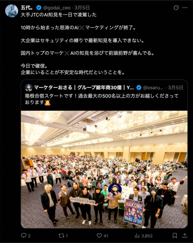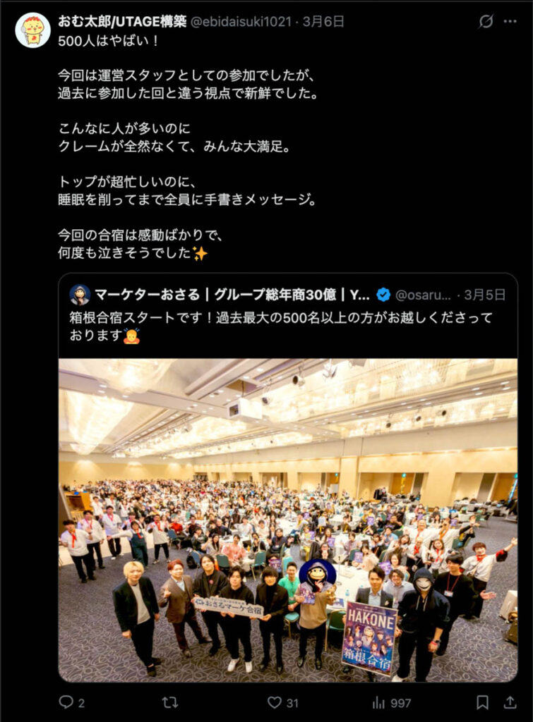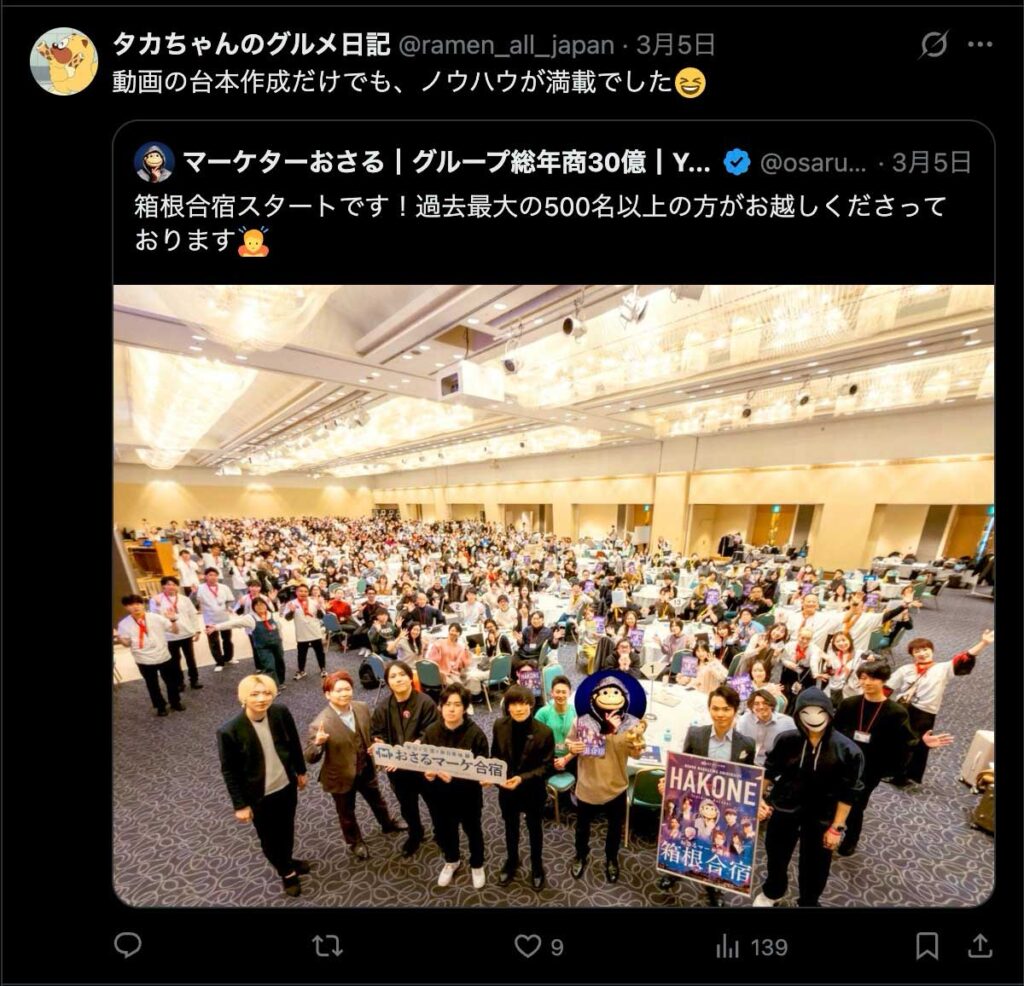 2026年3月5日-6日にかけて、箱根にて、おさるマーケ講座の合宿を開催しました。今回は過去最大規模の500名近い受講生を無料招待しました。