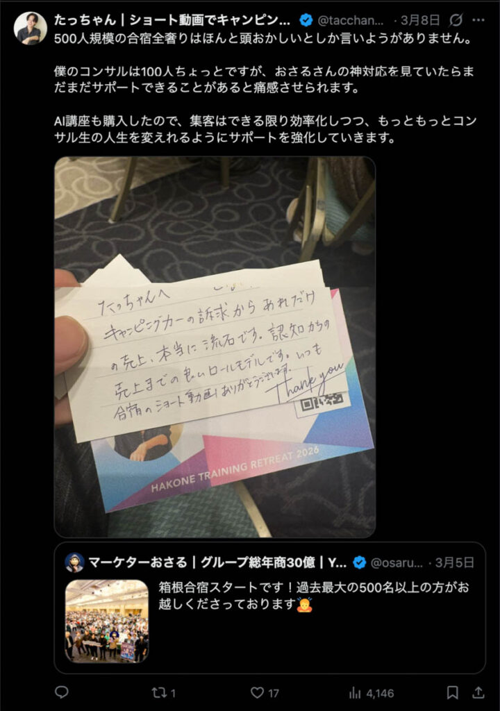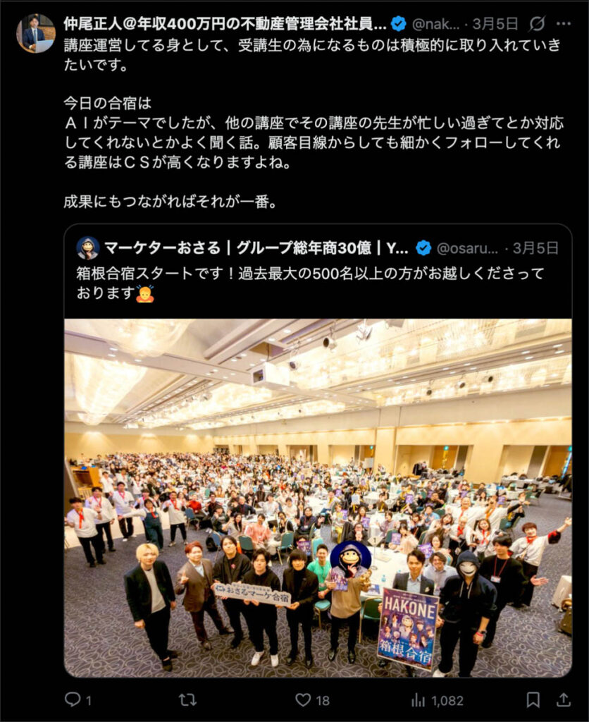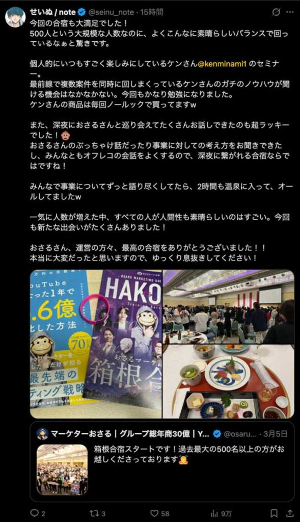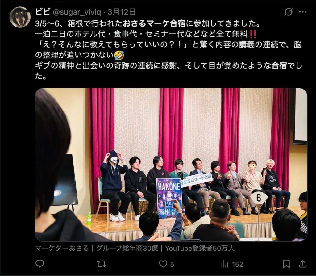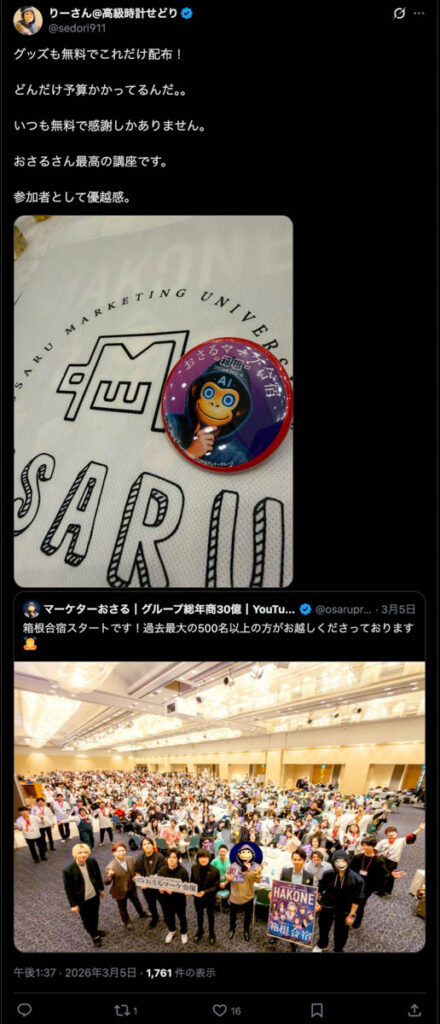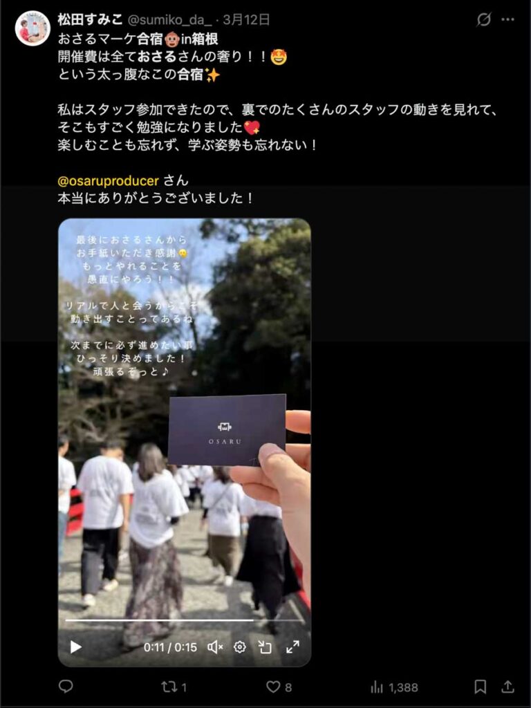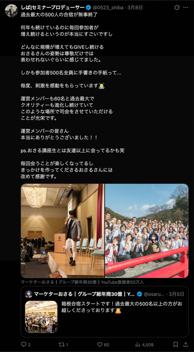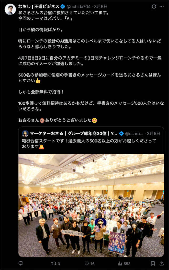 2026年3月5日-6日にかけて、箱根にて、おさるマーケ講座の合宿を開催しました。今回は過去最大規模の500名近い受講生を無料招待しました。