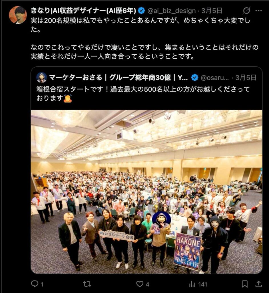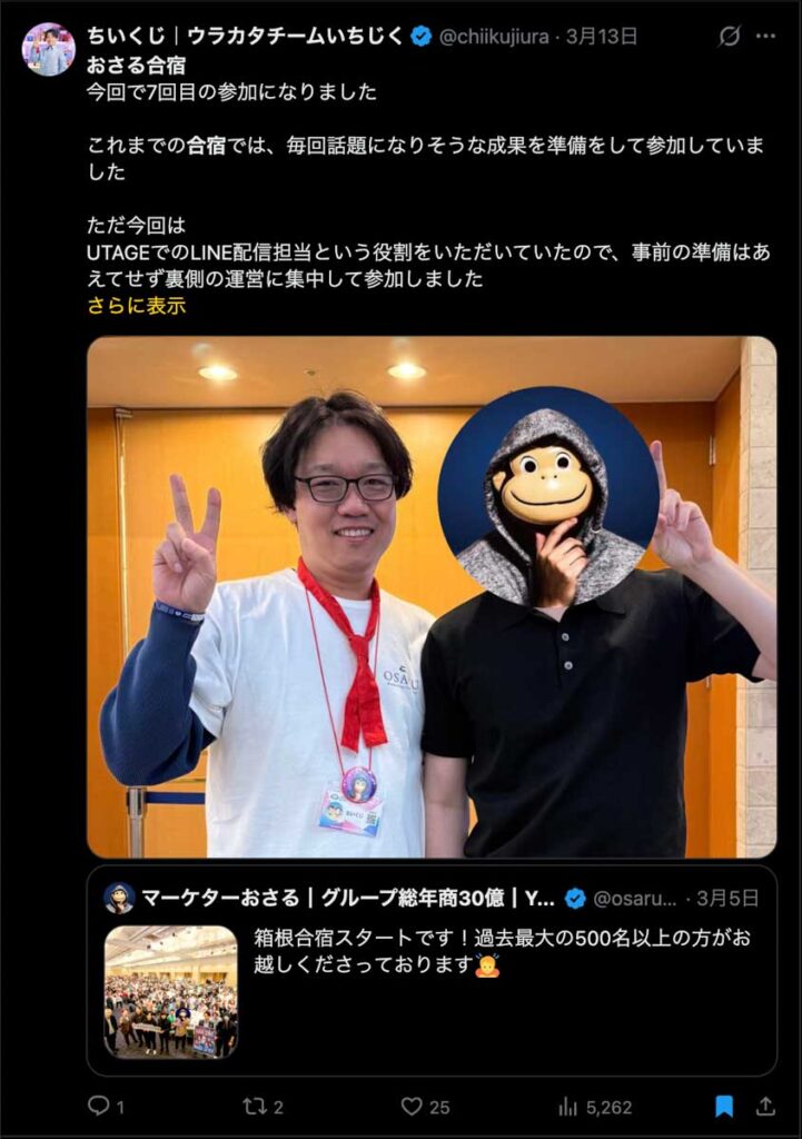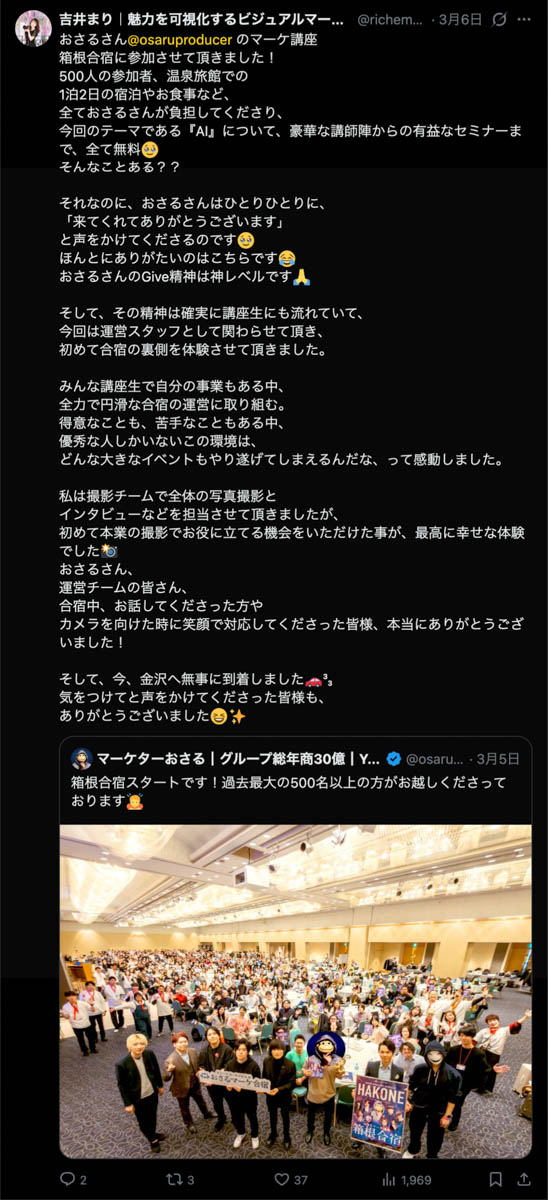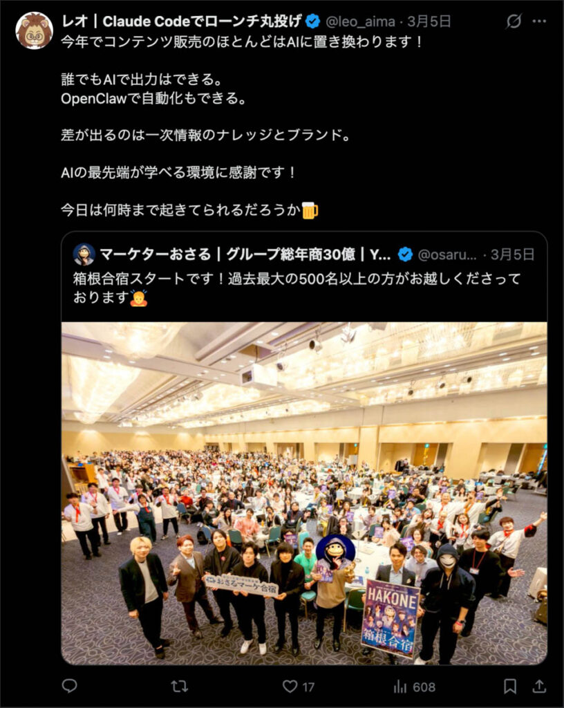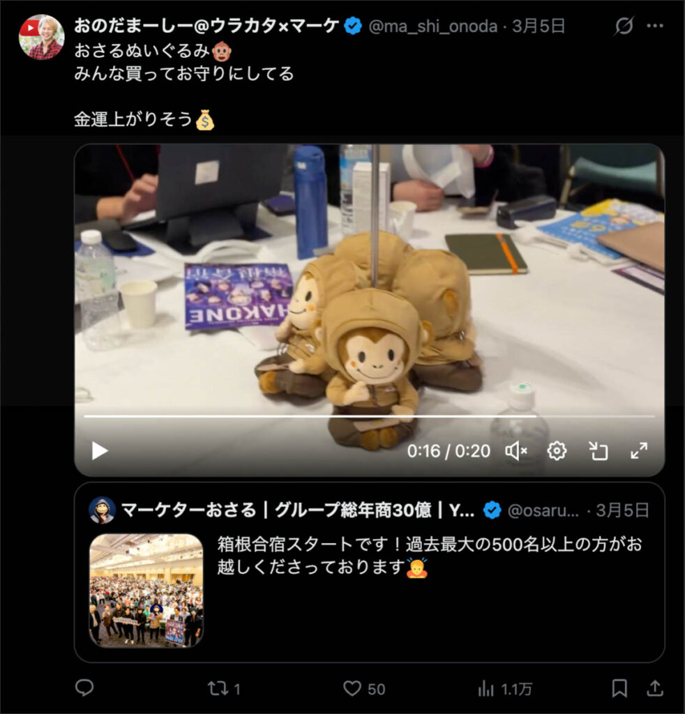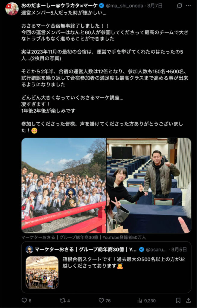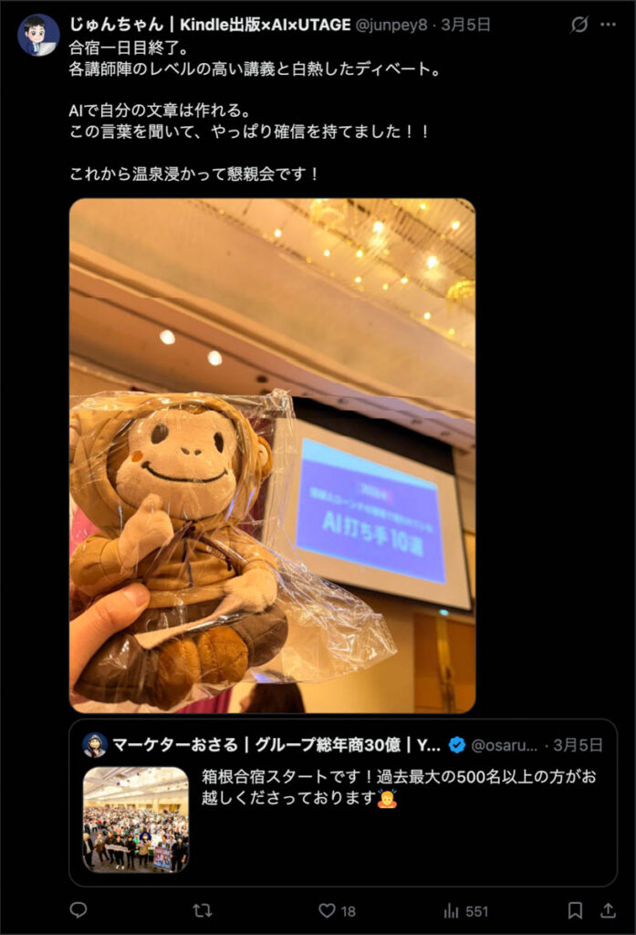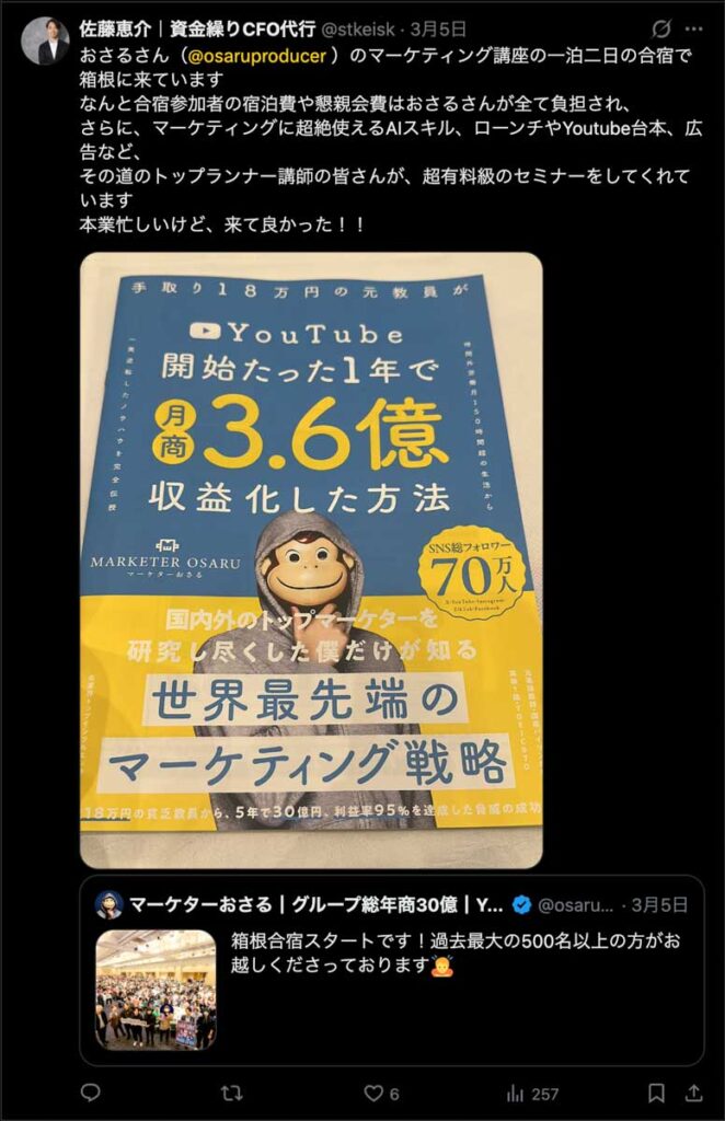 2026年3月5日-6日にかけて、箱根にて、おさるマーケ講座の合宿を開催しました。今回は過去最大規模の500名近い受講生を無料招待しました。