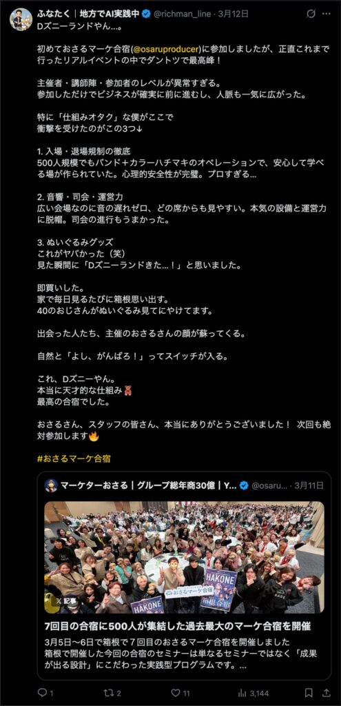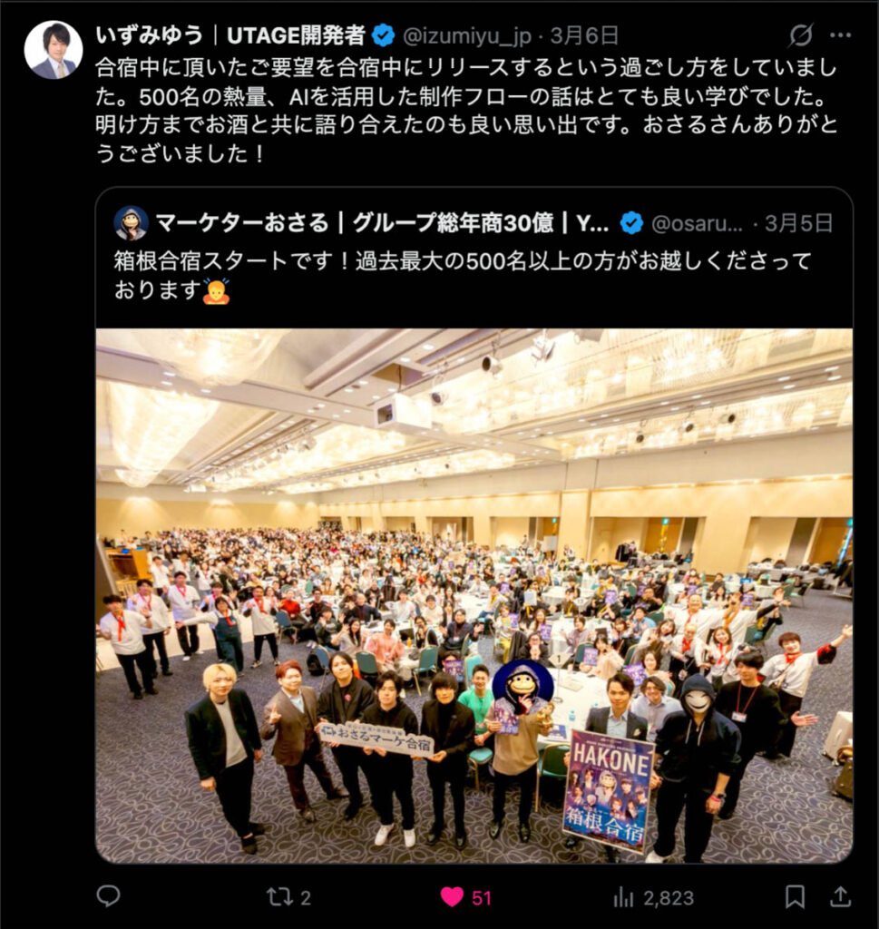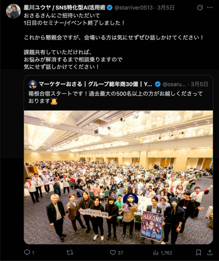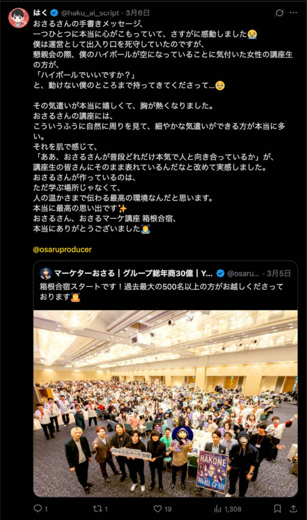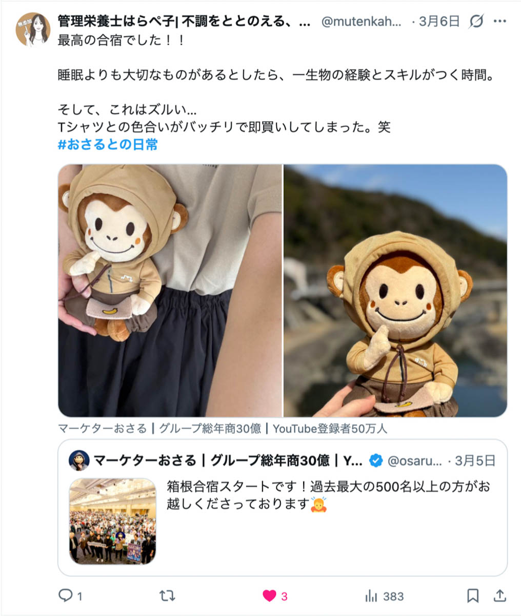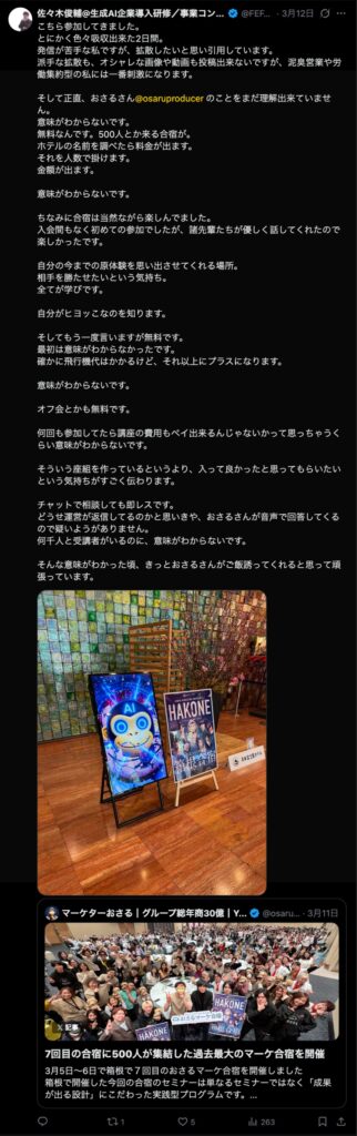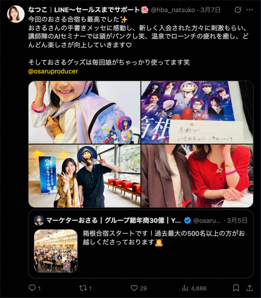 2026年3月5日-6日にかけて、箱根にて、おさるマーケ講座の合宿を開催しました。今回は過去最大規模の500名近い受講生を無料招待しました。