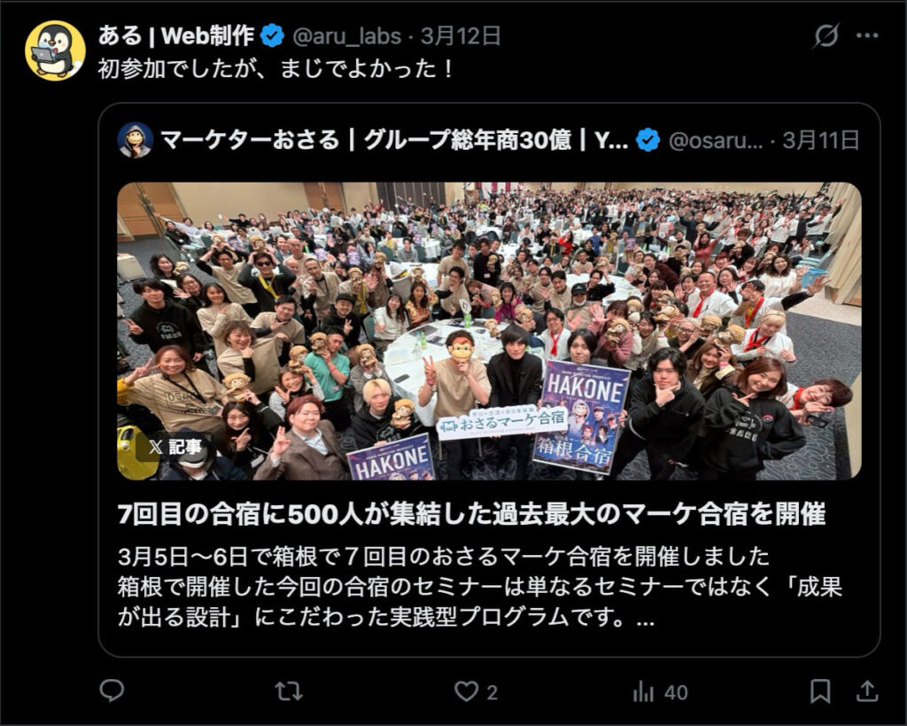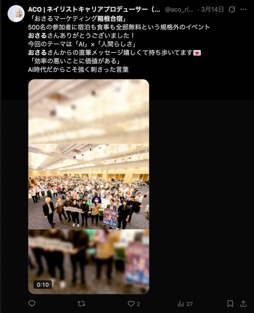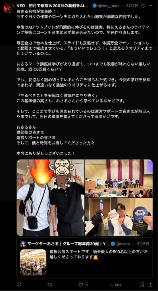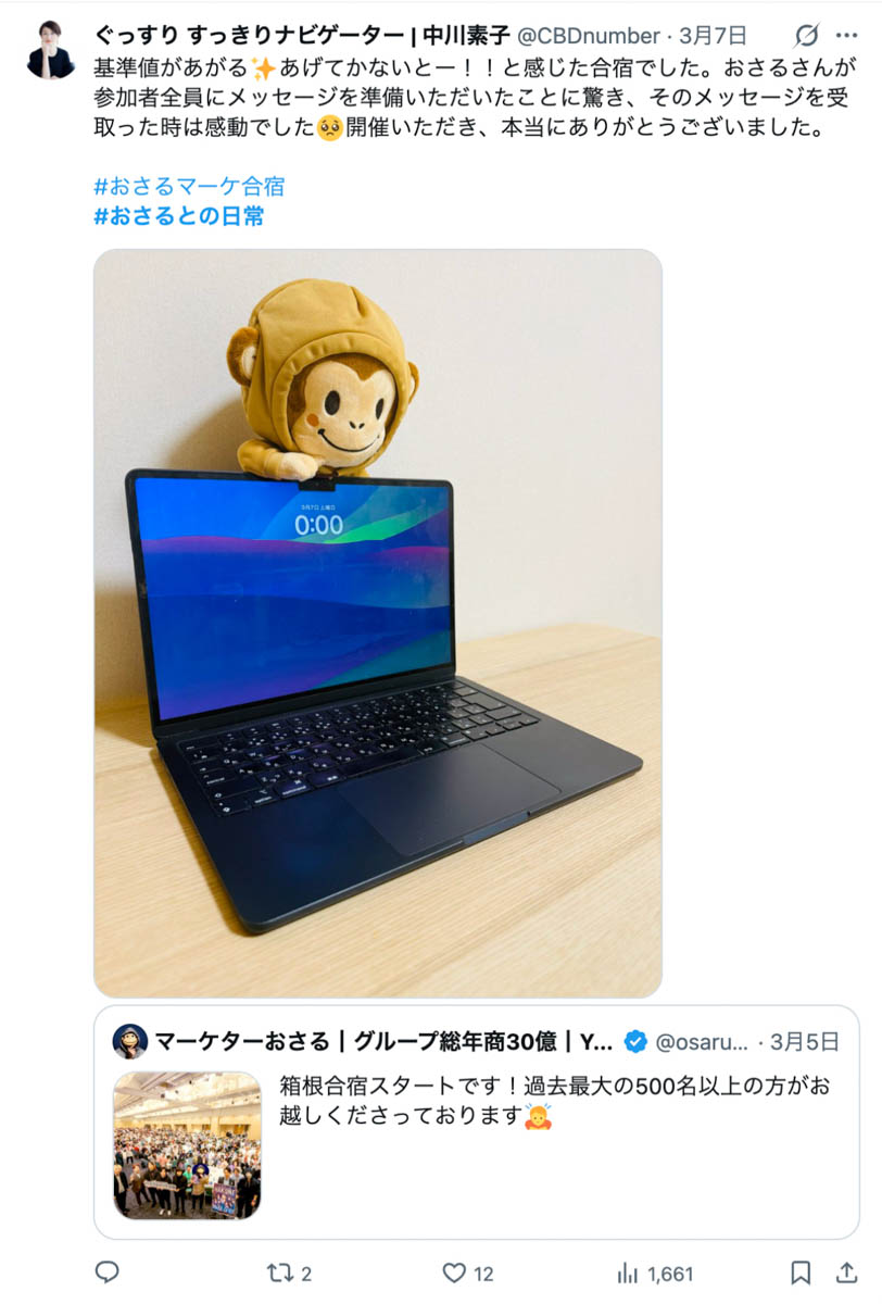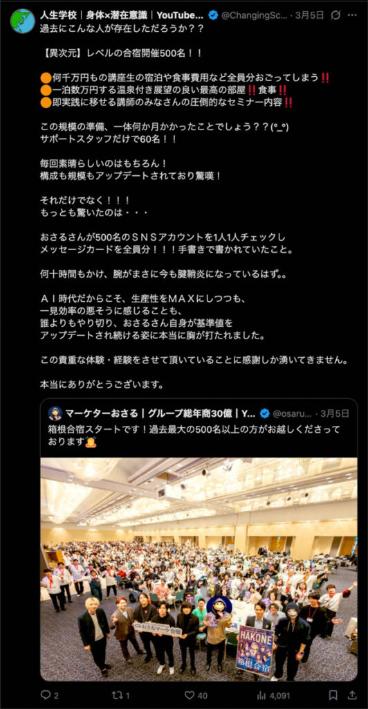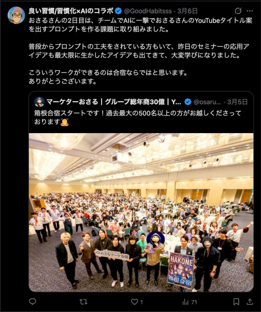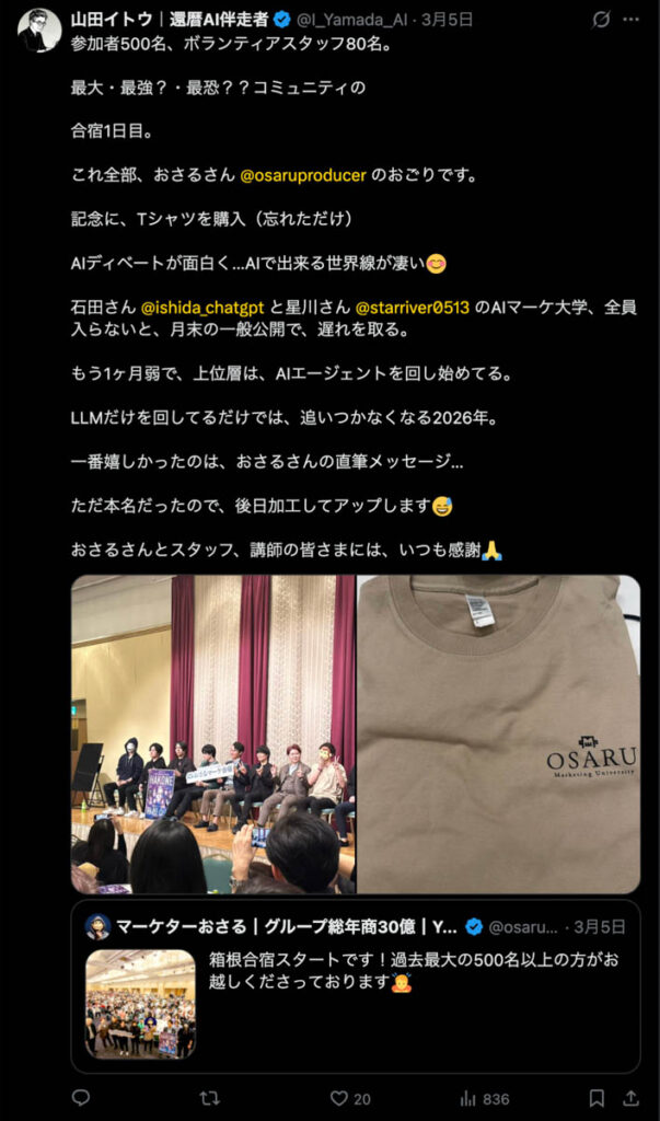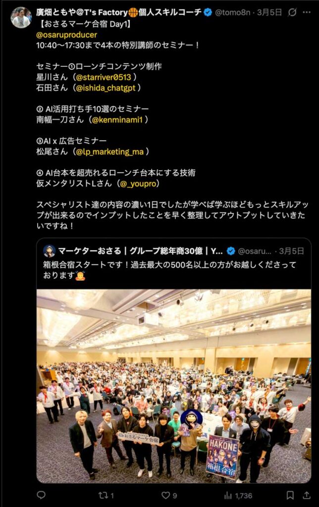 2026年3月5日-6日にかけて、箱根にて、おさるマーケ講座の合宿を開催しました。今回は過去最大規模の500名近い受講生を無料招待しました。