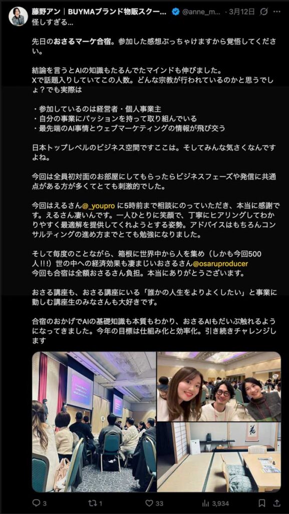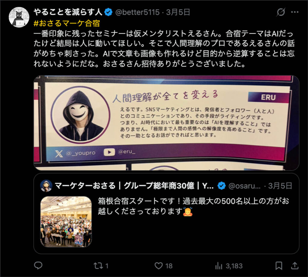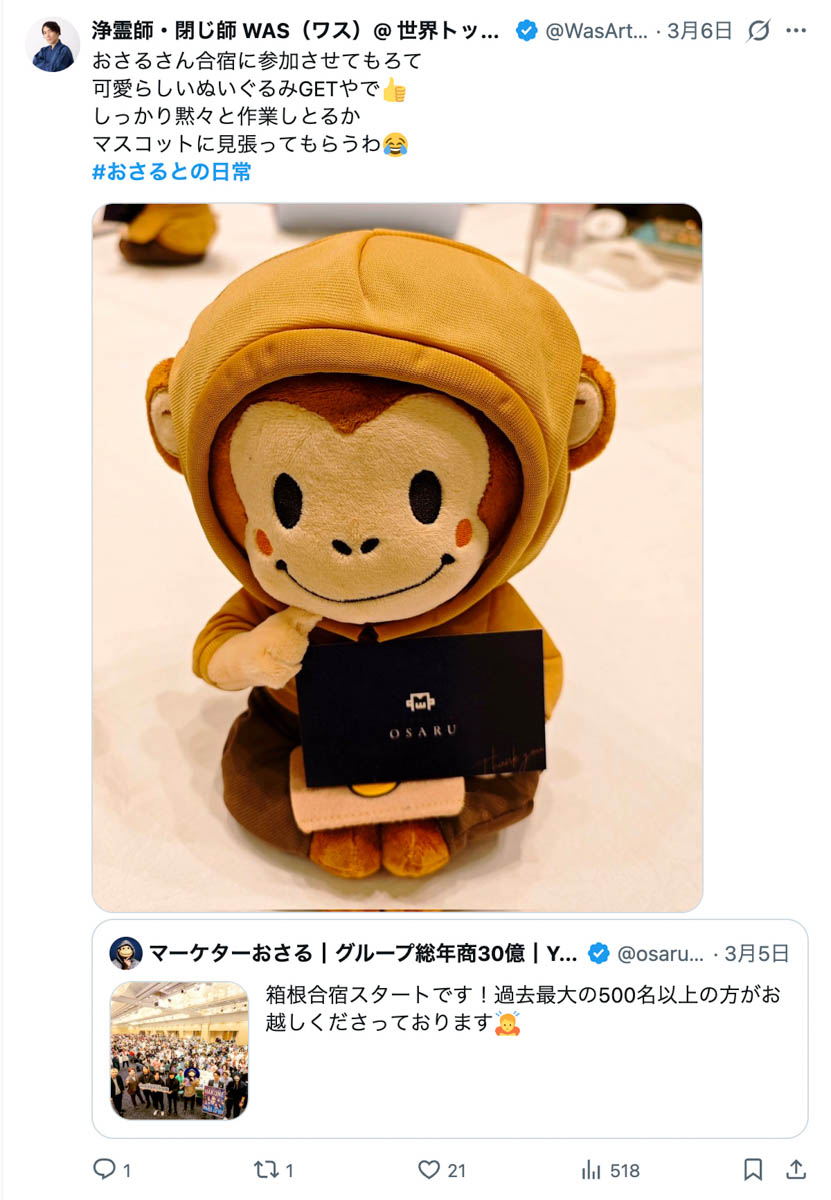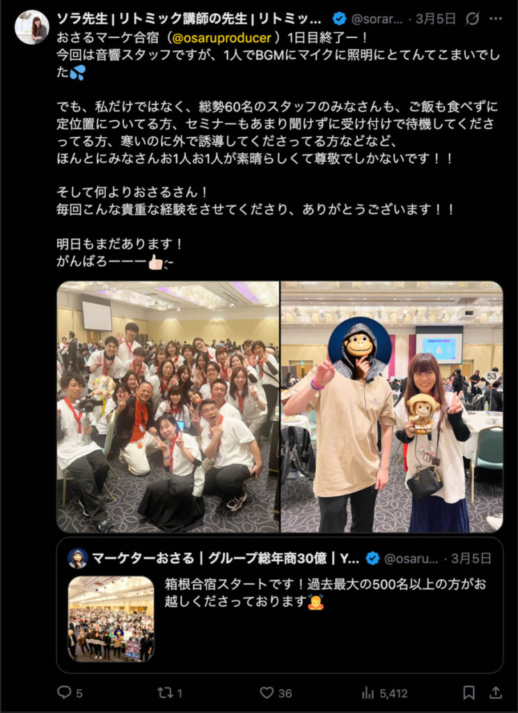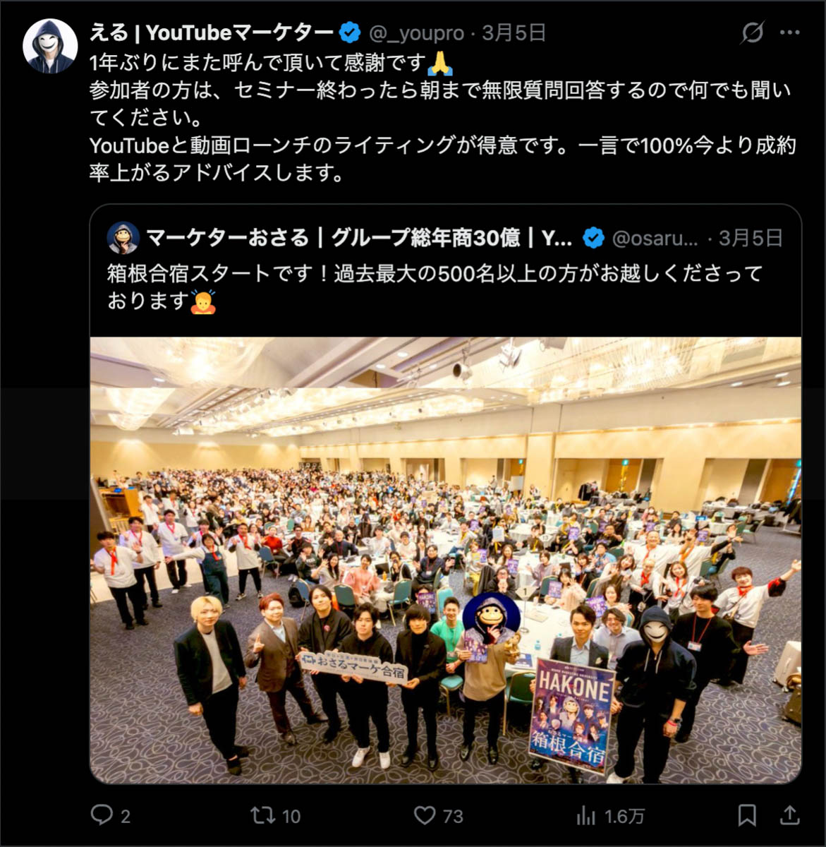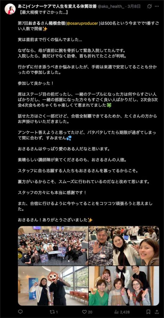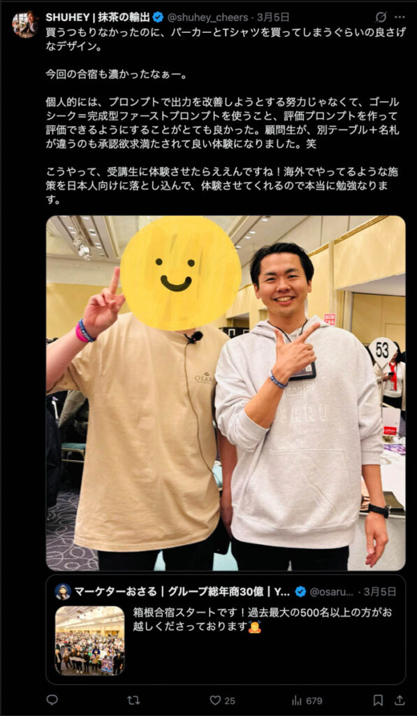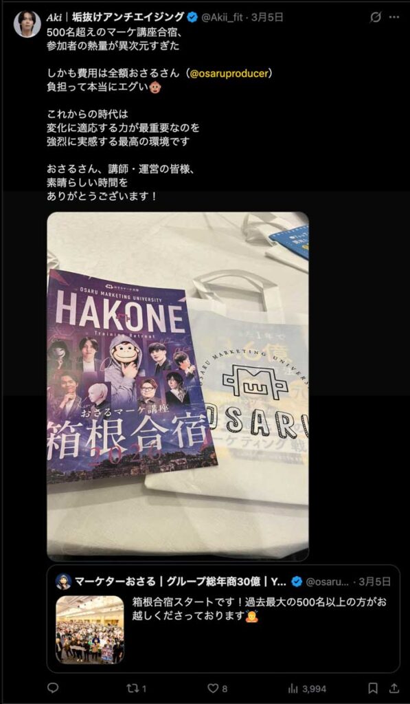 2026年3月5日-6日にかけて、箱根にて、おさるマーケ講座の合宿を開催しました。今回は過去最大規模の500名近い受講生を無料招待しました。