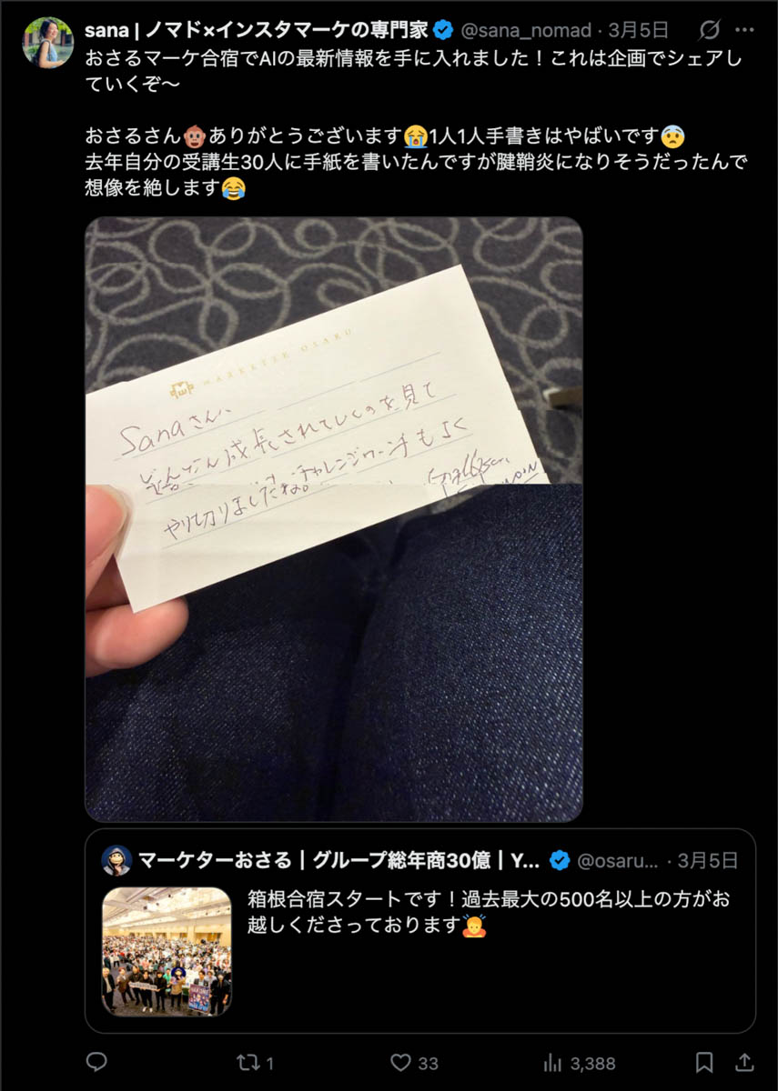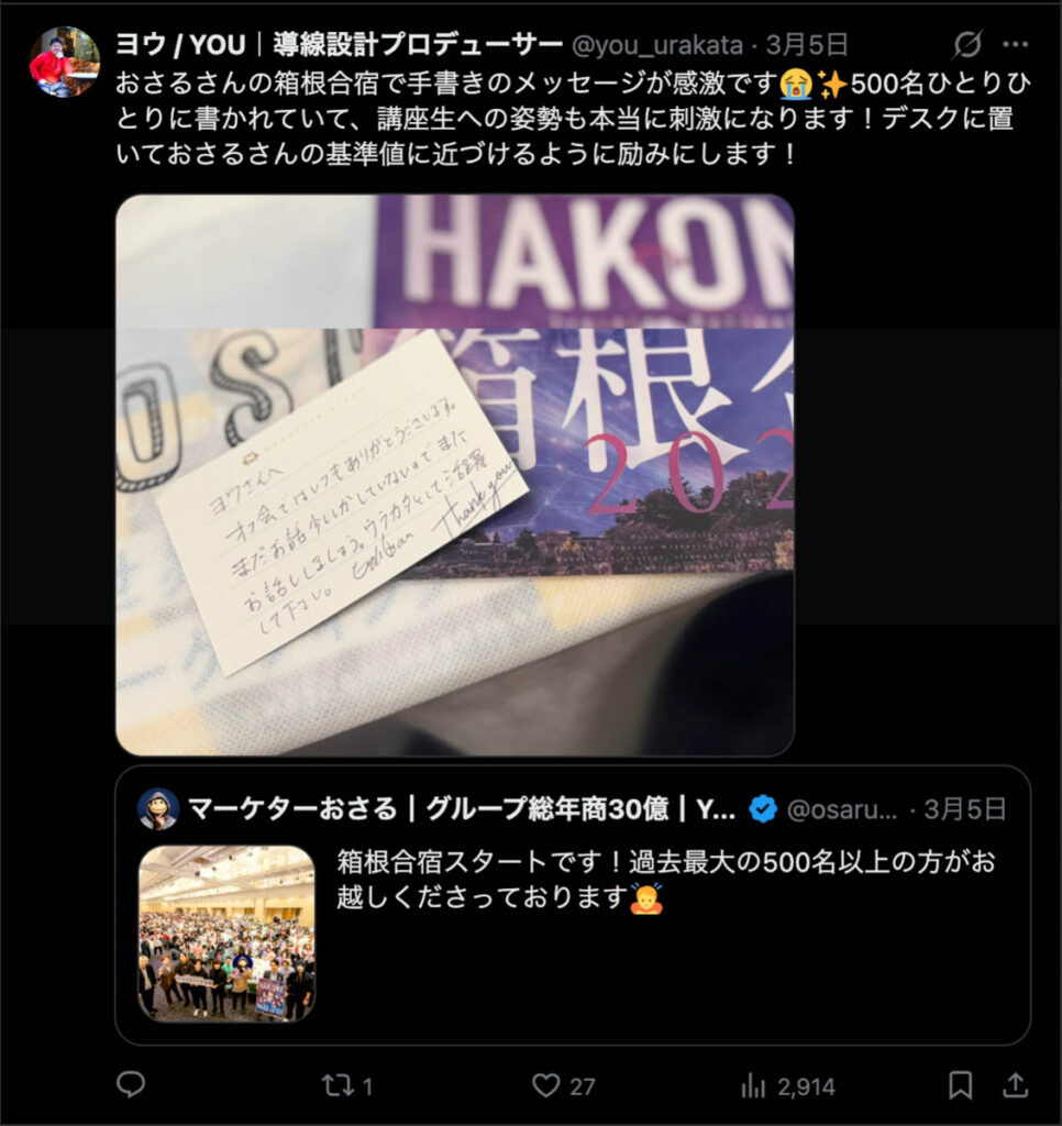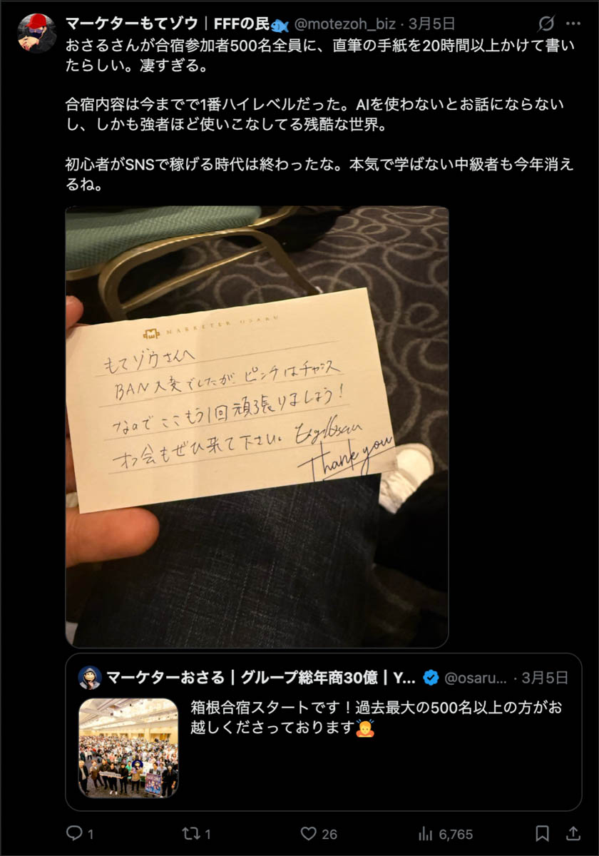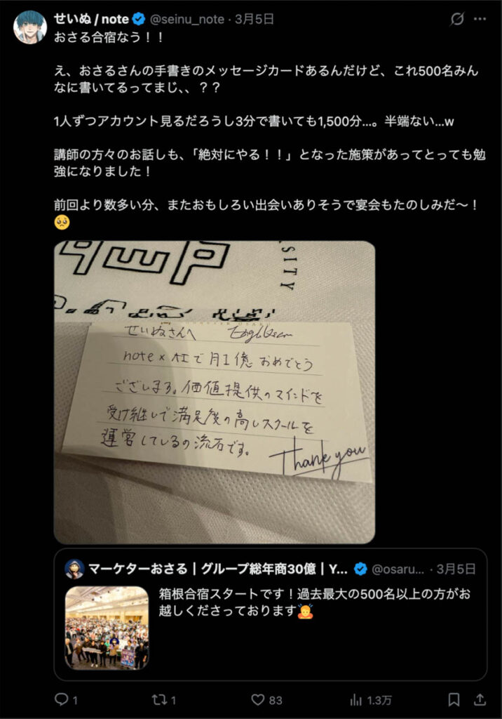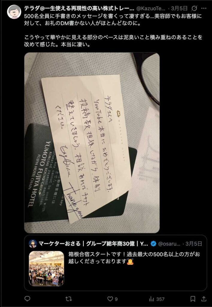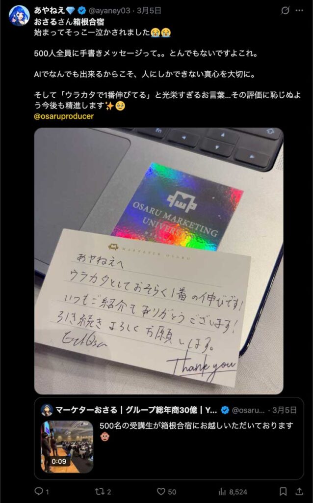 僕が自ら参加者全員、500通超の手書きカードを数日かけて準備しました。泣いて喜んでくれる人もいました。Xのトレンド入りもしました。