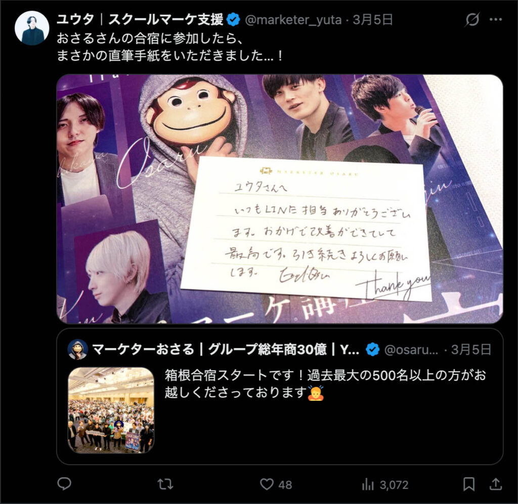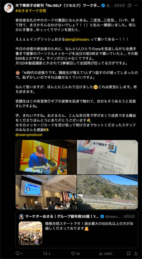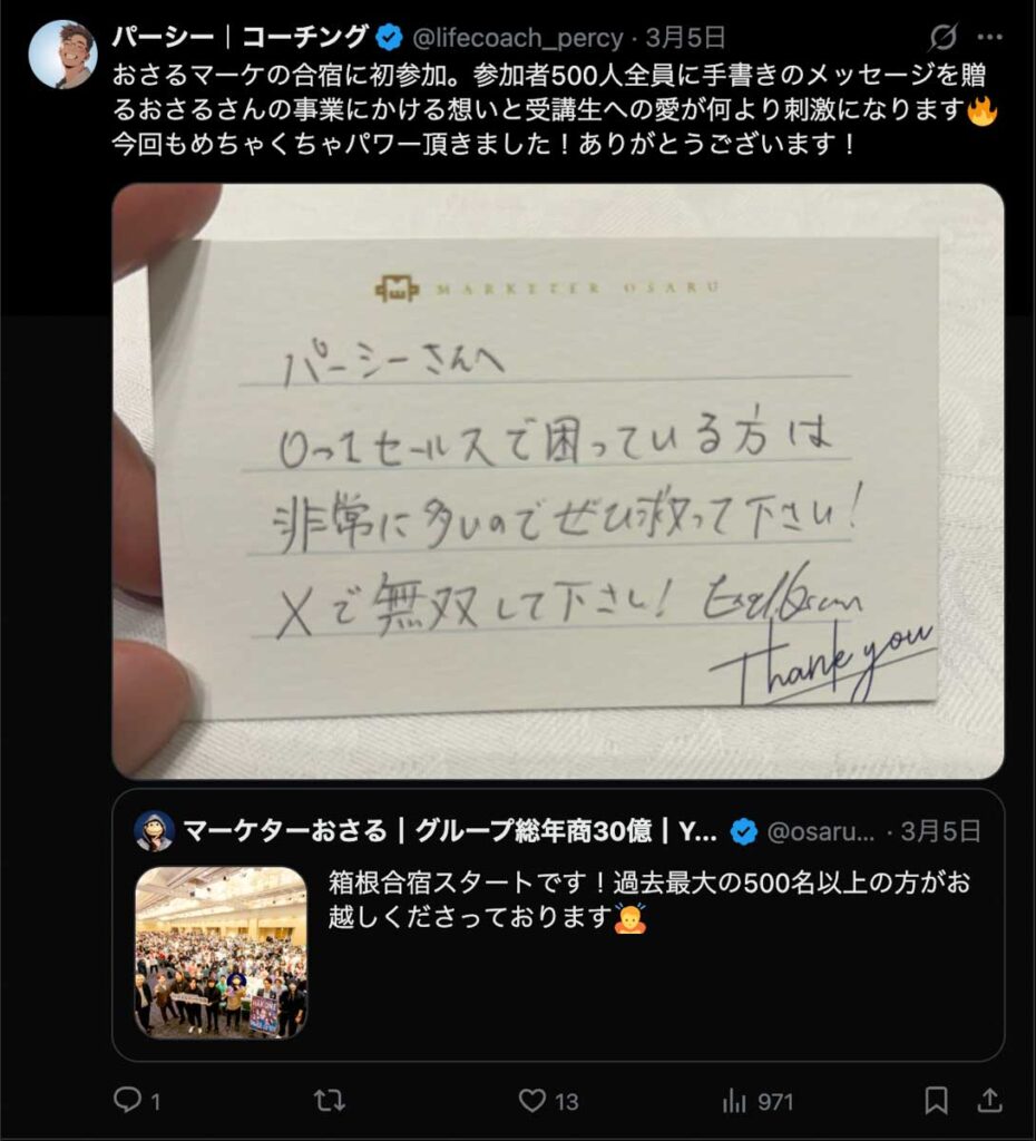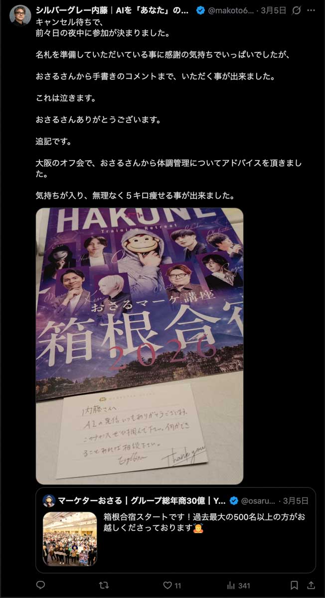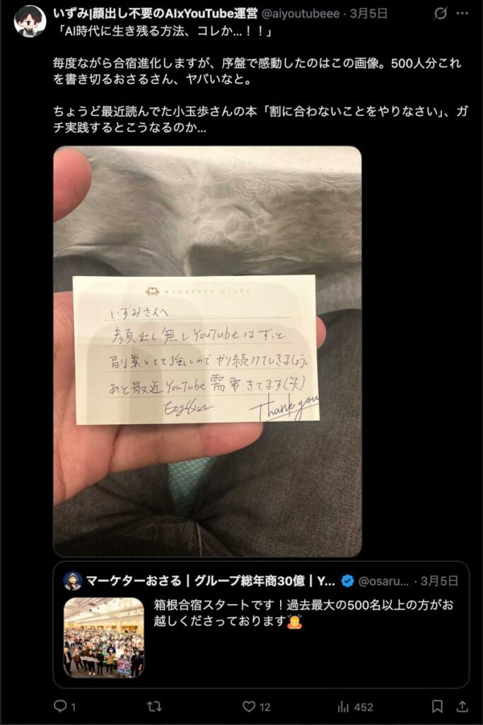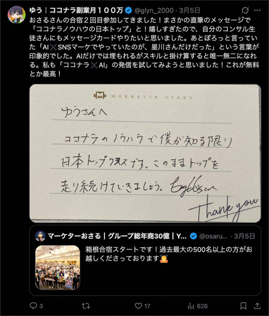 僕が自ら参加者全員、500通超の手書きカードを数日かけて準備しました。泣いて喜んでくれる人もいました。Xのトレンド入りもしました。