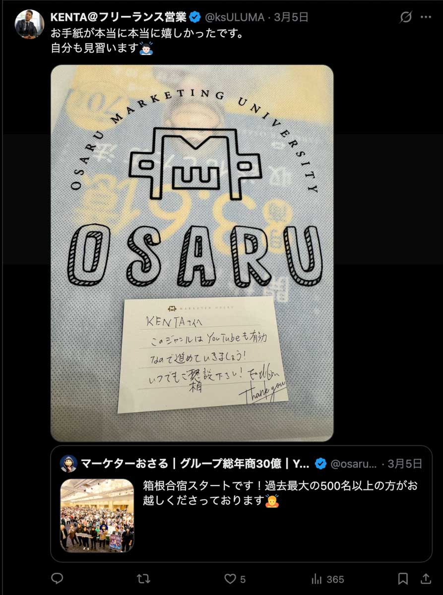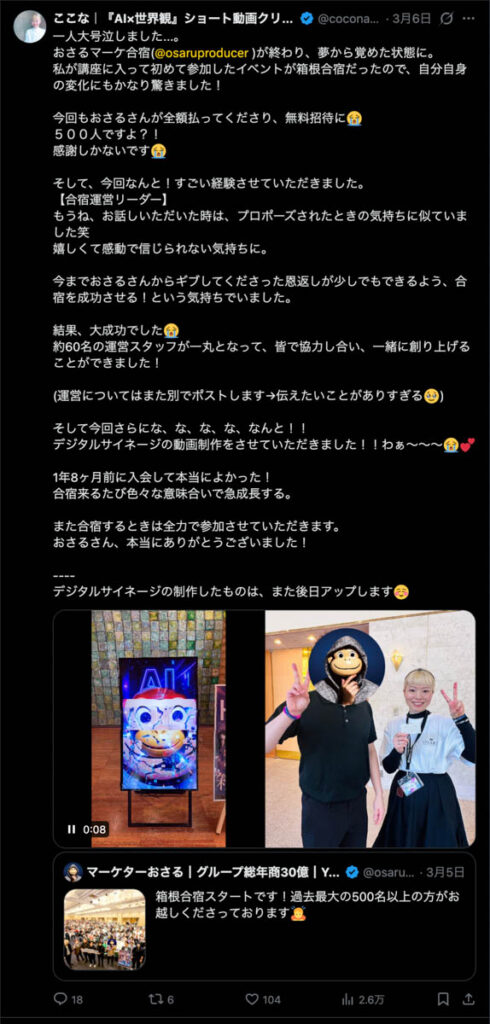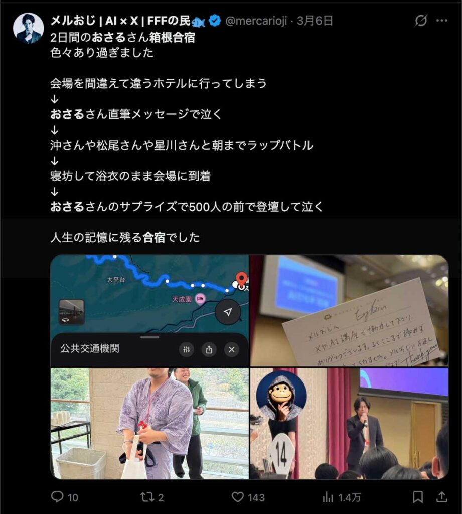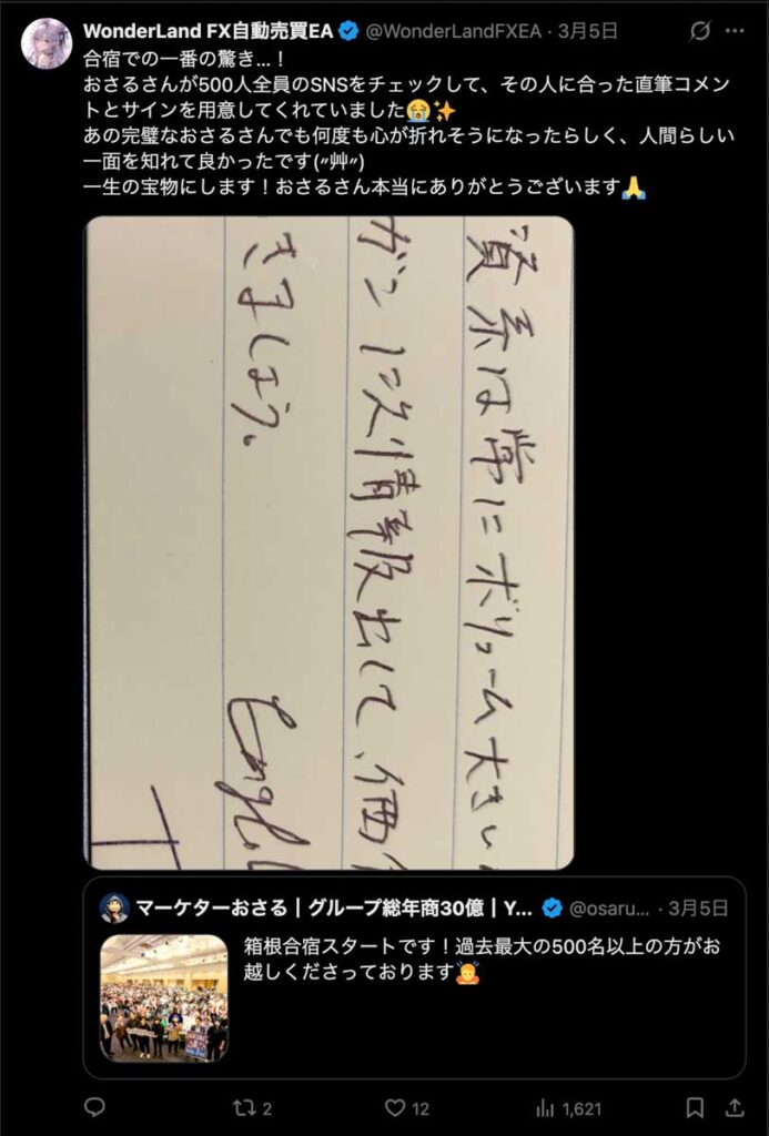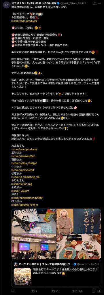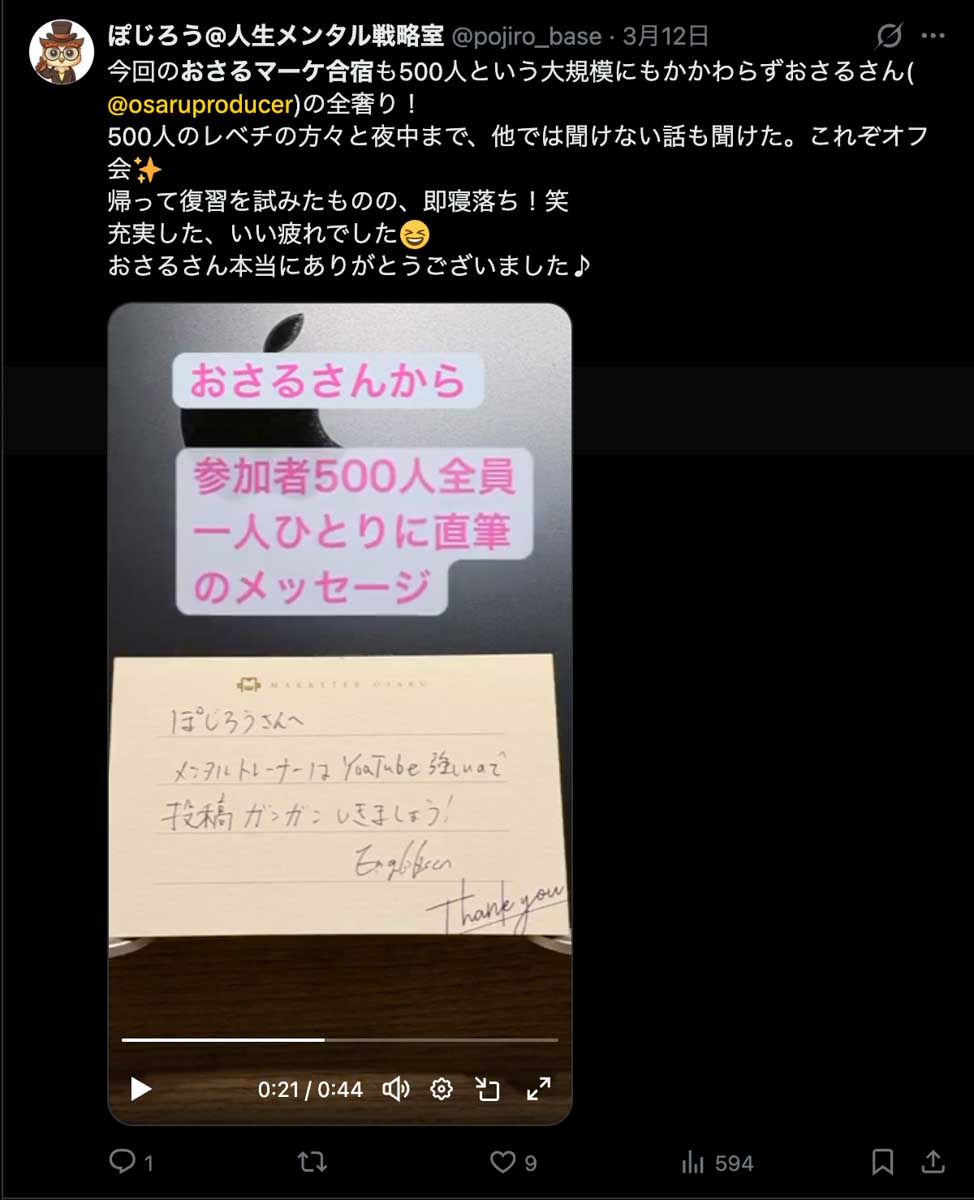 僕が自ら参加者全員、500通超の手書きカードを数日かけて準備しました。泣いて喜んでくれる人もいました。Xのトレンド入りもしました。