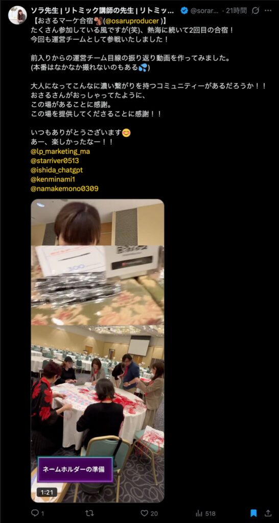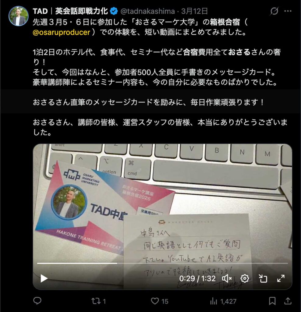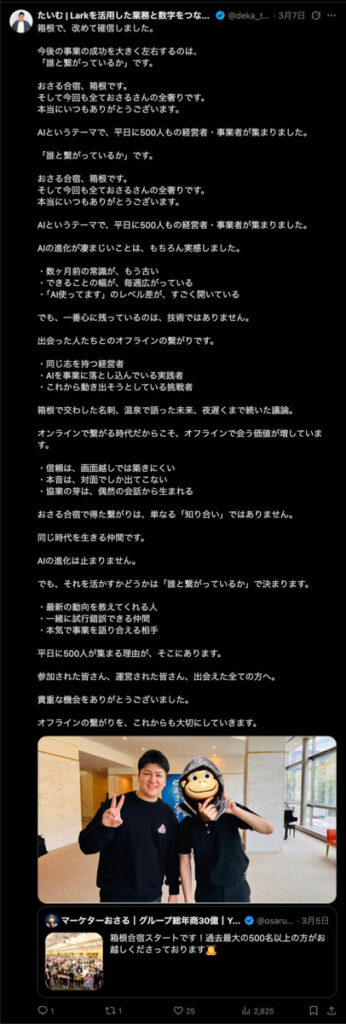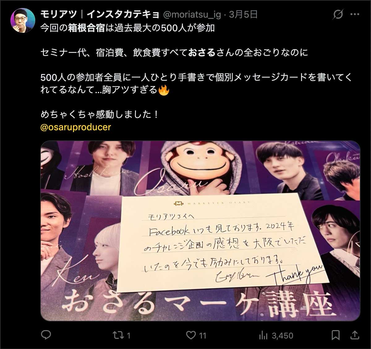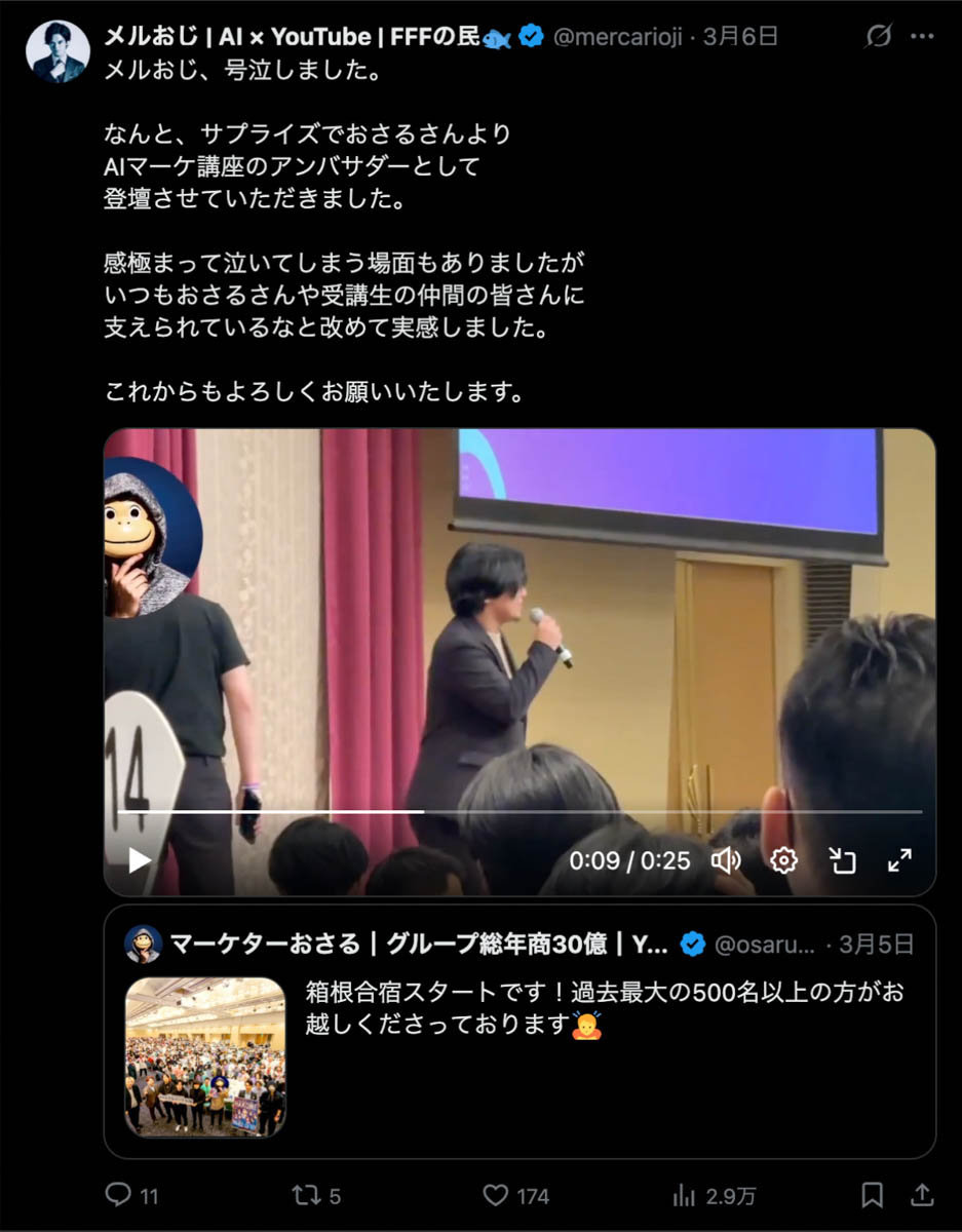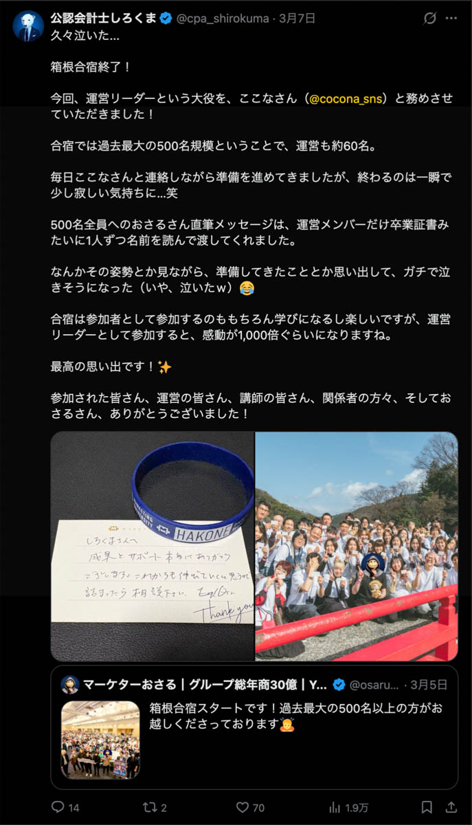僕が自ら参加者全員、500通超の手書きカードを数日かけて準備しました。泣いて喜んでくれる人もいました。Xのトレンド入りもしました。