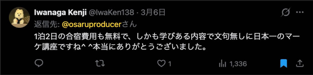 など、そのすべてがおさるの奢りですので、おさるのマーケ受講生は無料で参加することができます。そのため回数を増すごとに参加希望者が増え、キャンセル待ちがでるほど大人気の企画です。