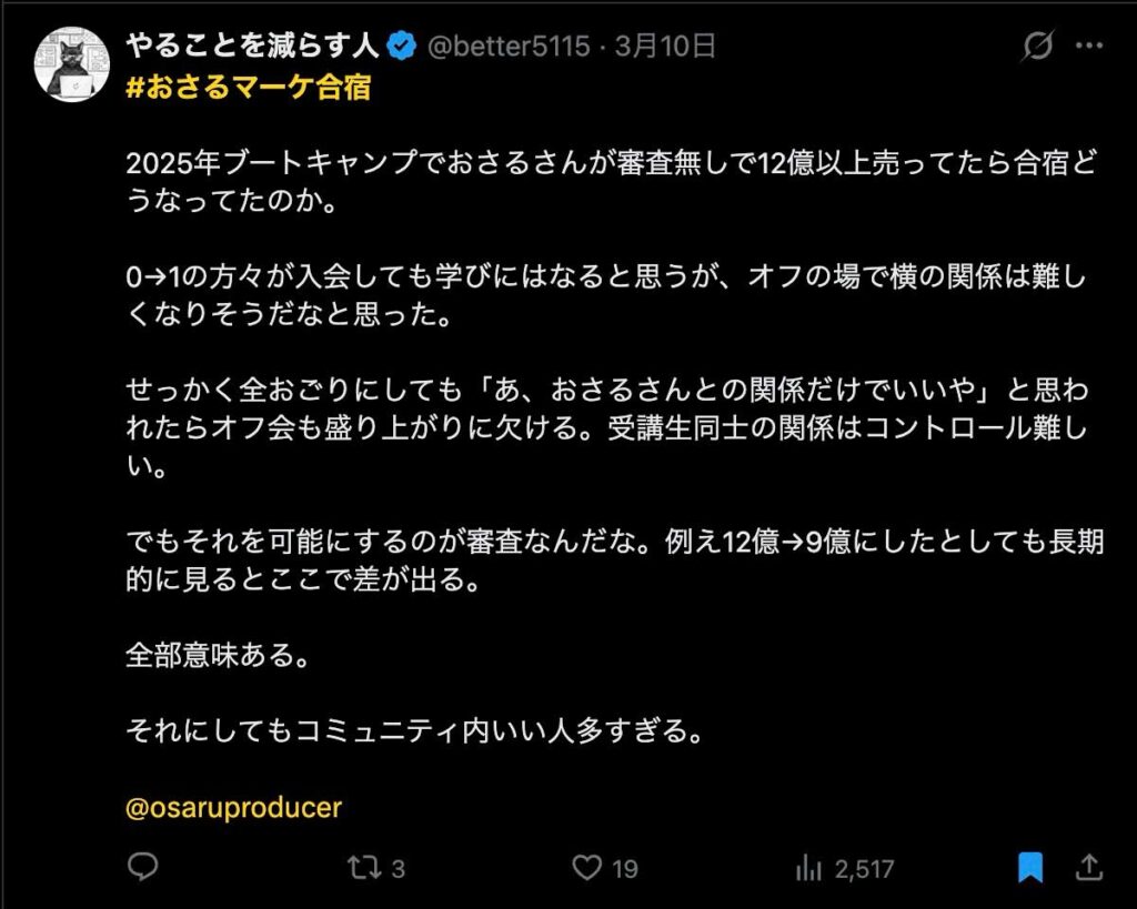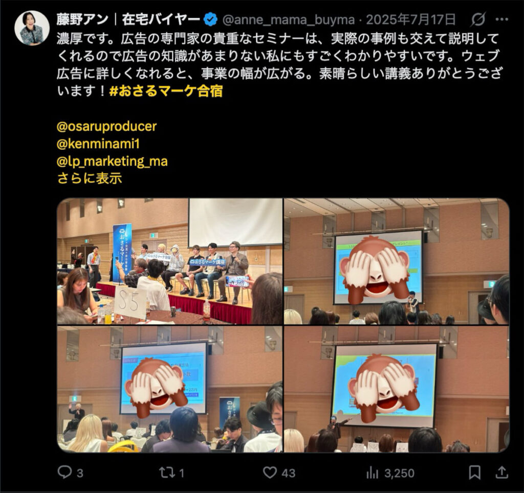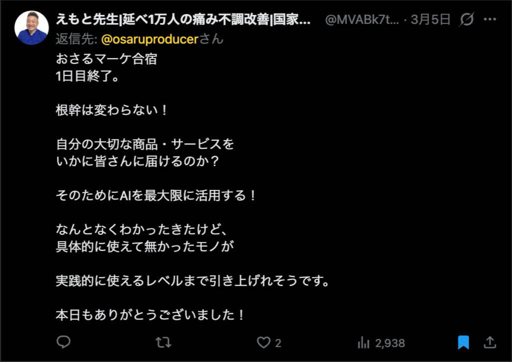 今回のおさるマーケ合宿は、「学んで終わり」ではなく「その場で変わる」ことを目的に設計した2日間でした。