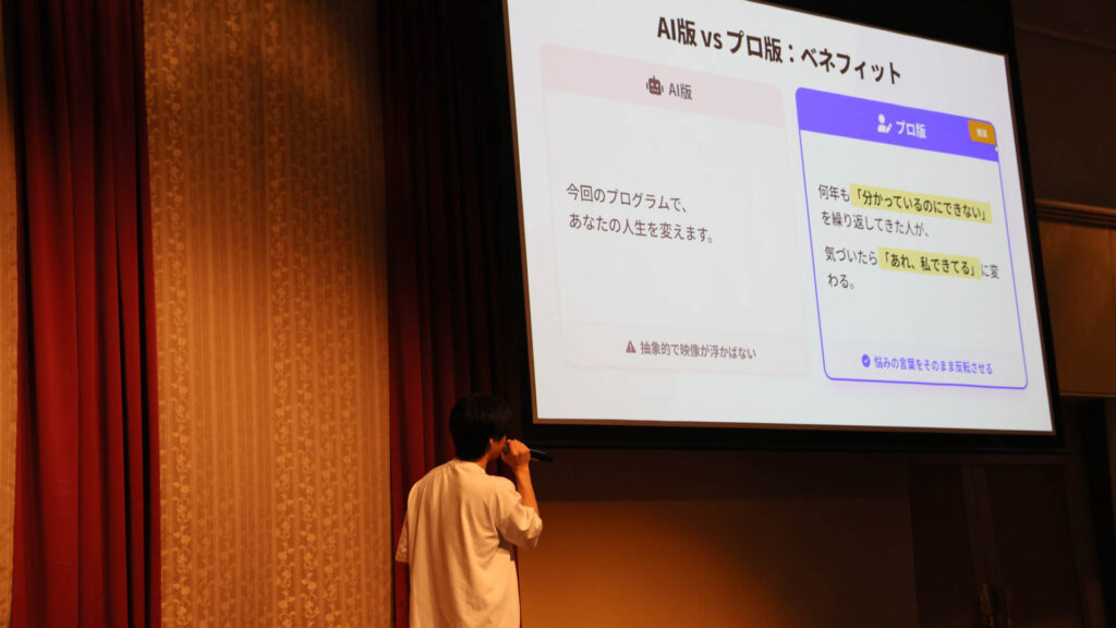 さらに、「あなたもこうなれますよ」という薄い一般論は捨ててください。代わりに、実際に受講生がこう変わりましたという特定の1人のリアルなエピソードを描写する。これが、読者の共感を生み心の壁を自然と取り払う最強のフックになります。