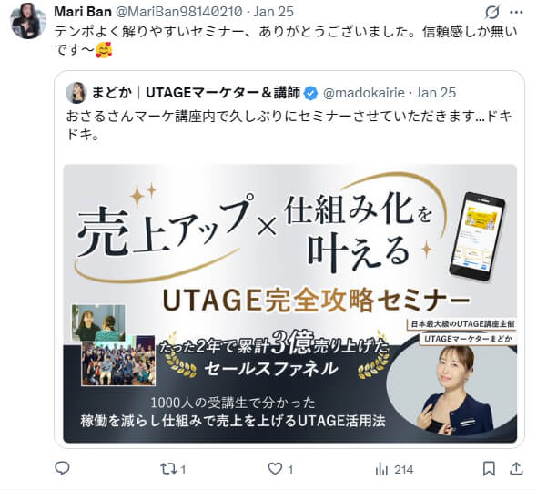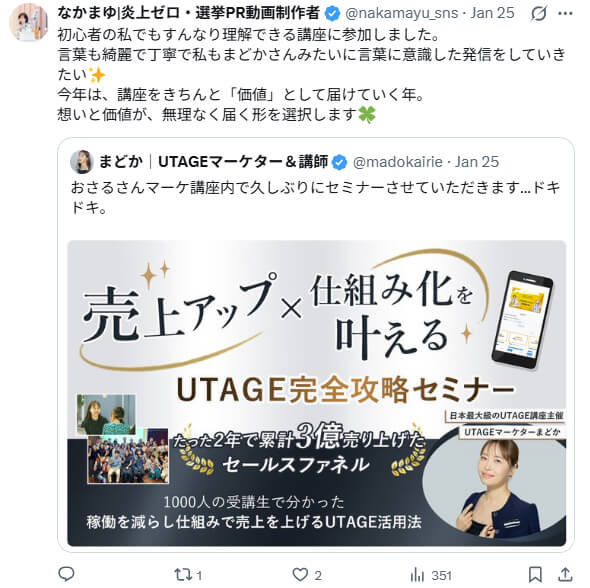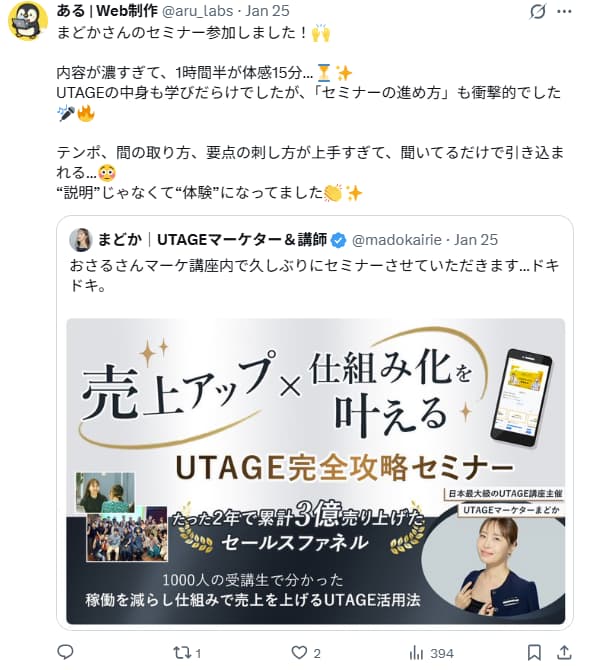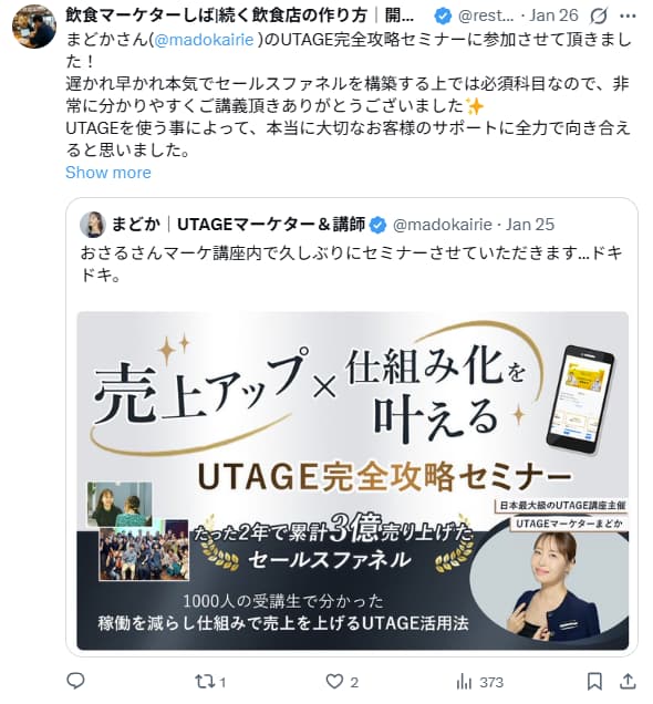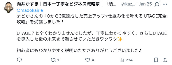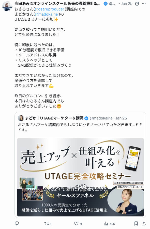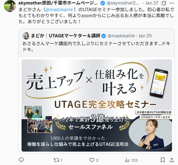 2026年1月25日(日)オンラインにて「0から3億達成した売上アップ×仕組み化を叶えるUTAGE完全攻略」セミナーを開催しました。