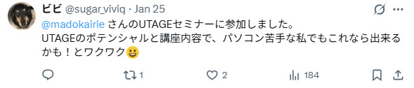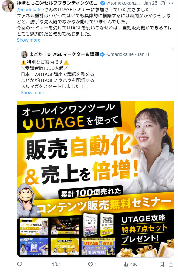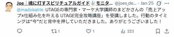 まどかさんはおさるマーケ大学の講師であり、2年以上前からUTAGEを活用した仕組み化を先駆けて実践されています。