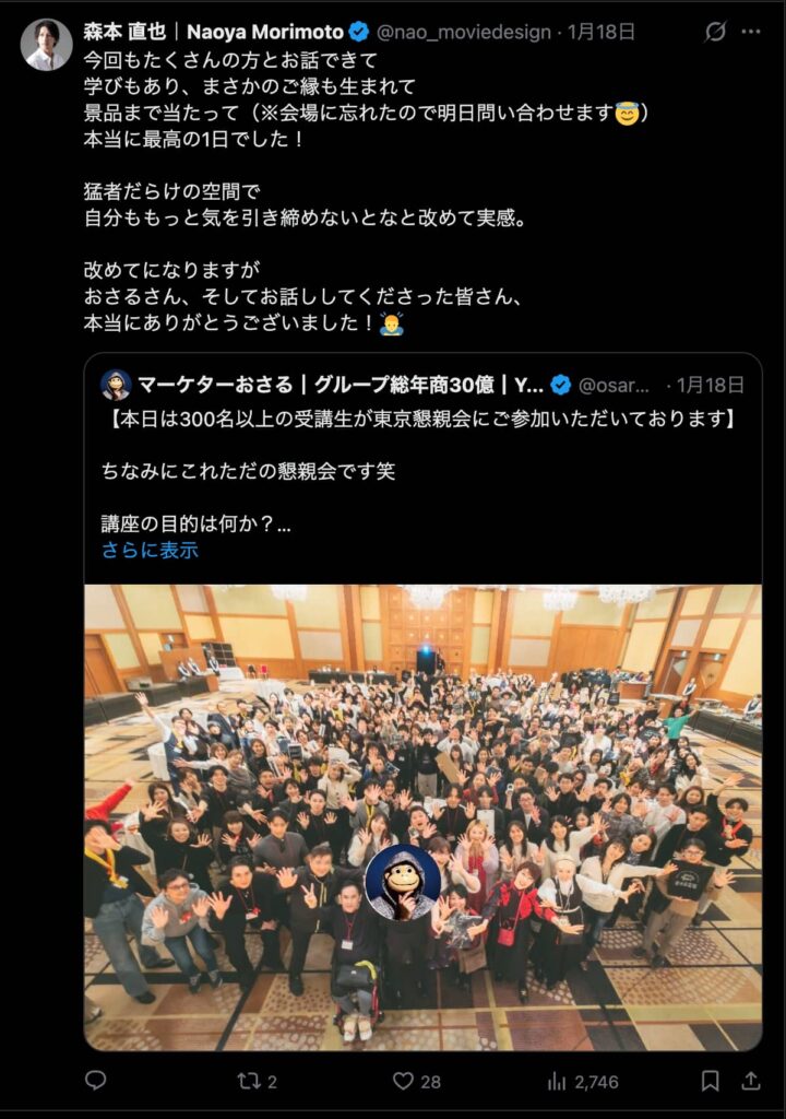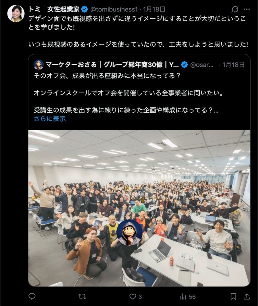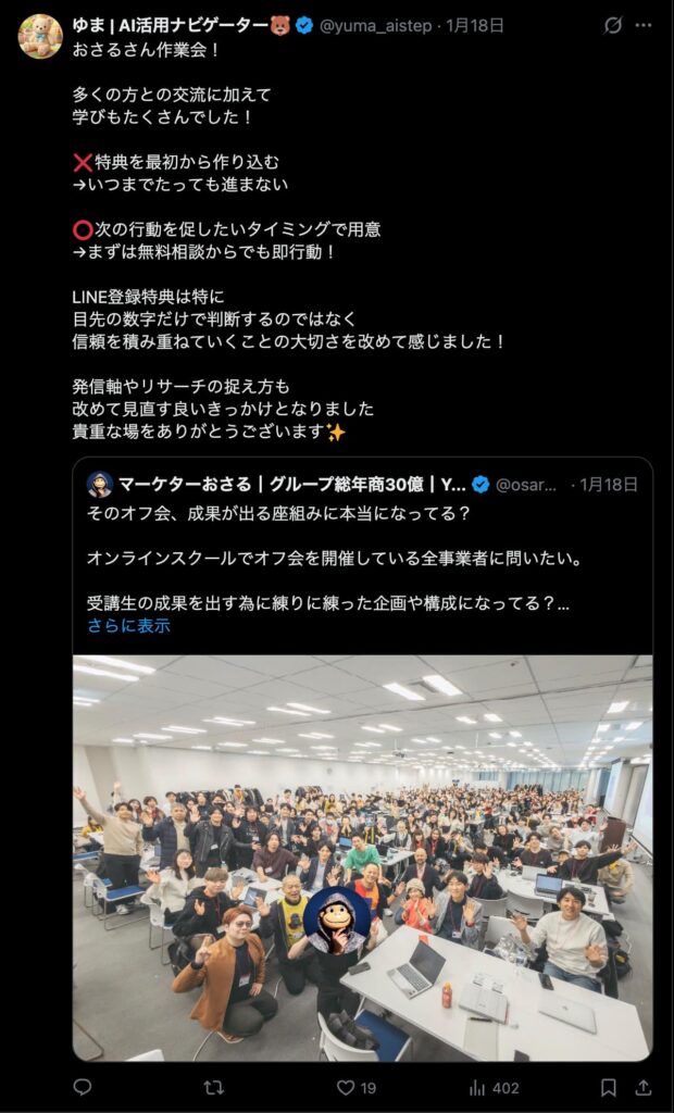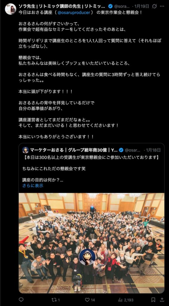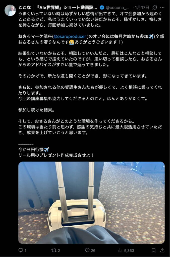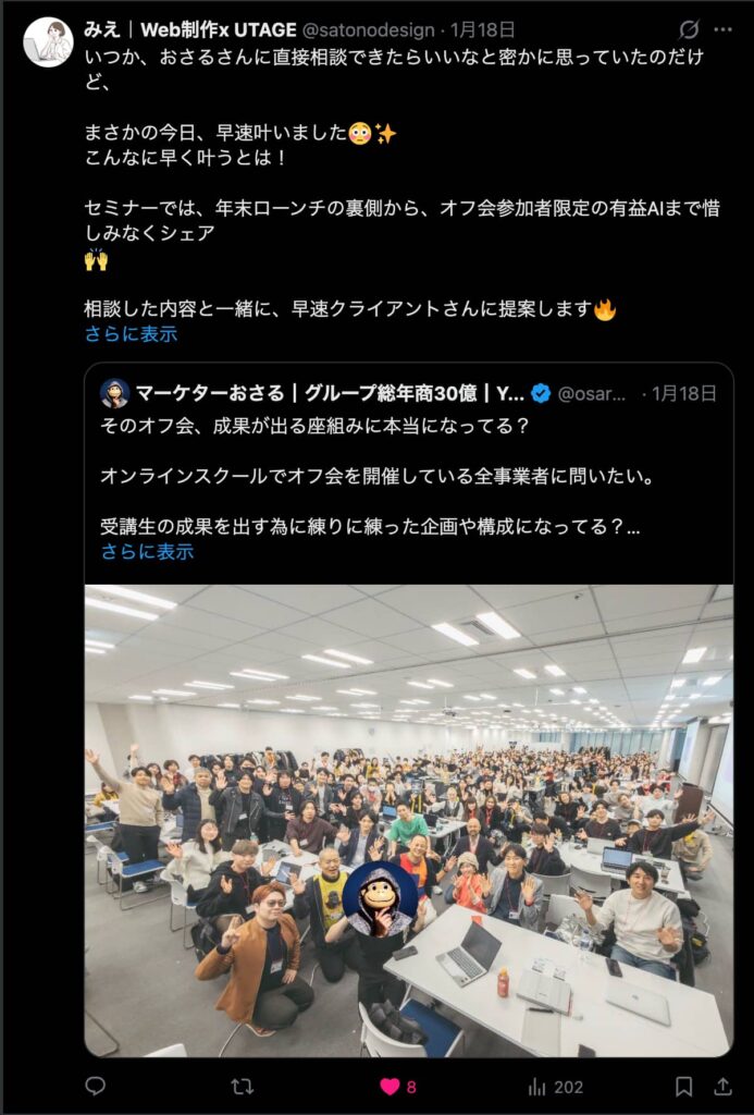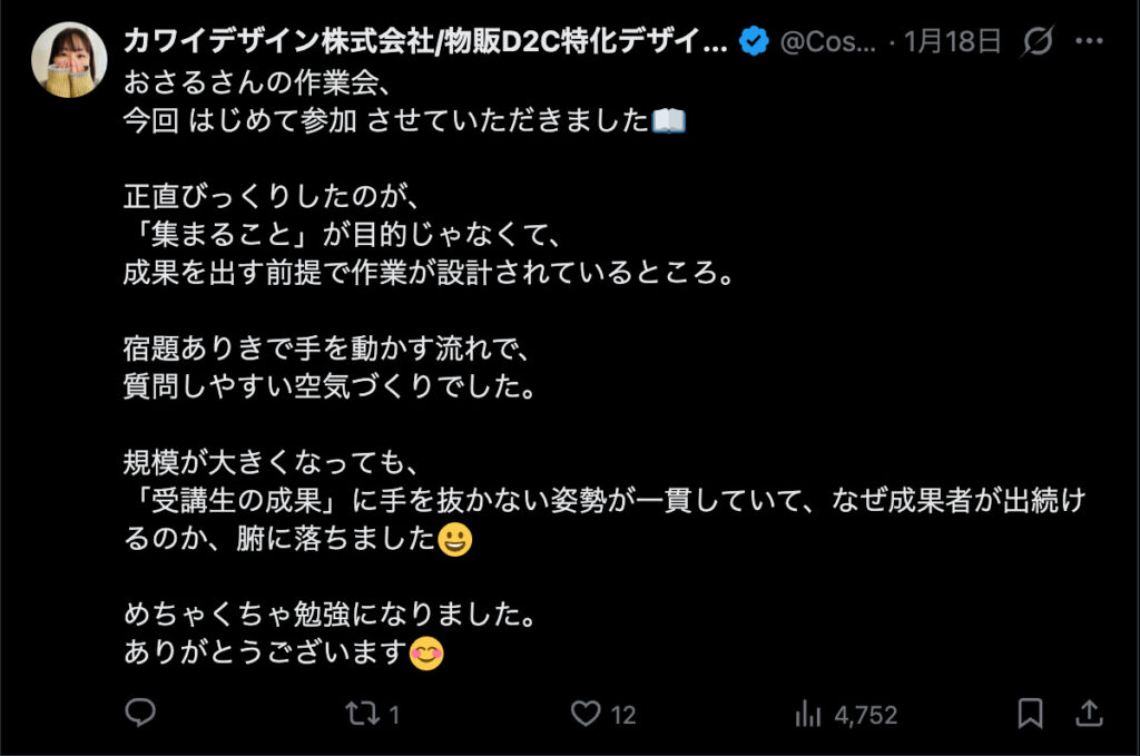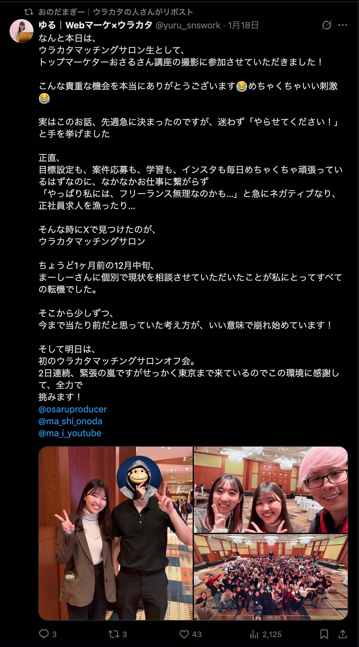 また、自身のブランドがまだ確立されていない段階では、なによりも手厚いサポートが重要であること。そして、お客様からの口コミや声こそが、もっとも強力なランディングページ(LP)になることを伝え、おさる自身がどうやって信頼を積み重ねてきたか、その根幹となる部分をお伝えしました。