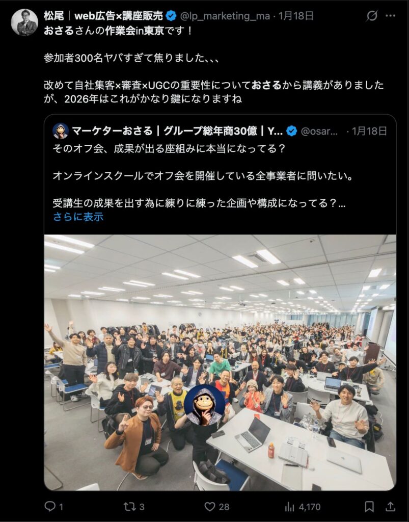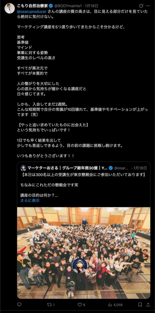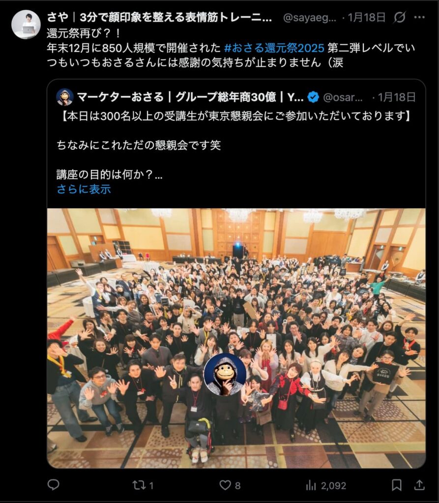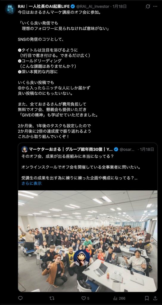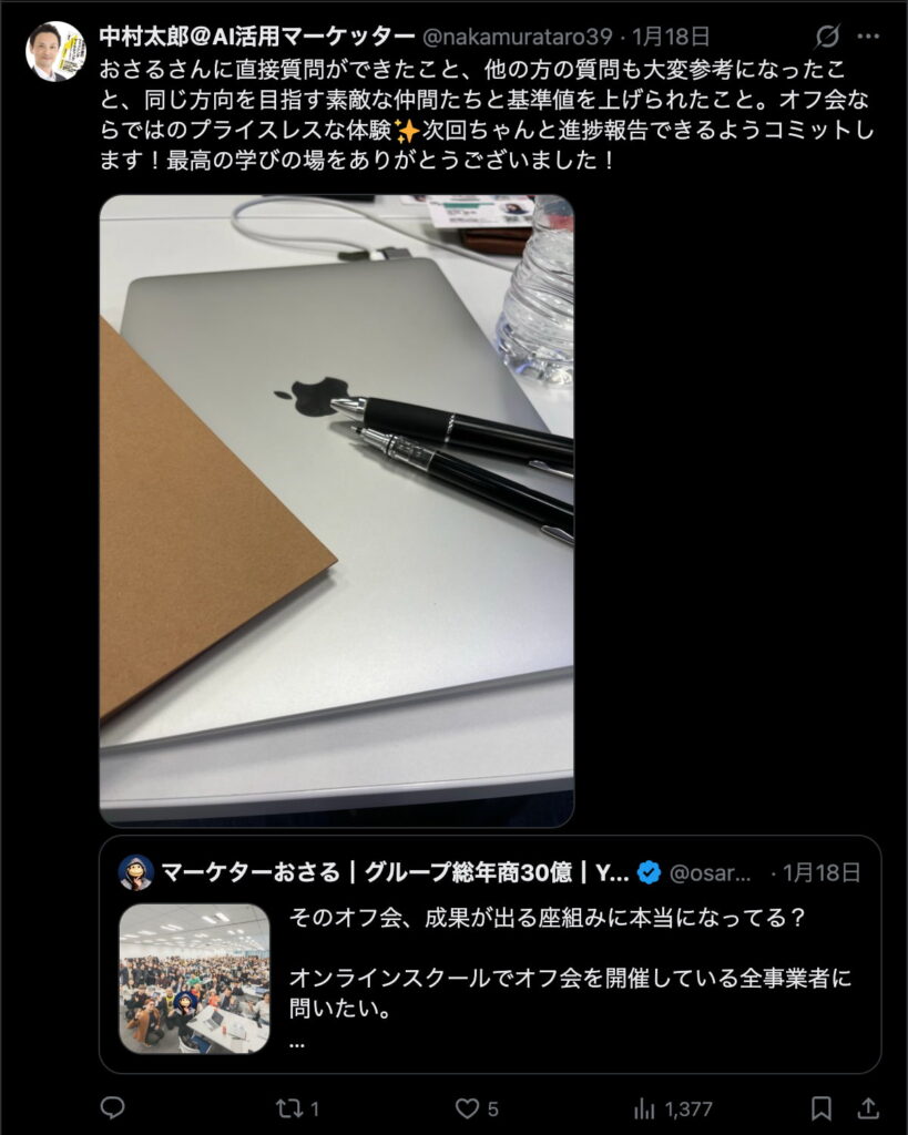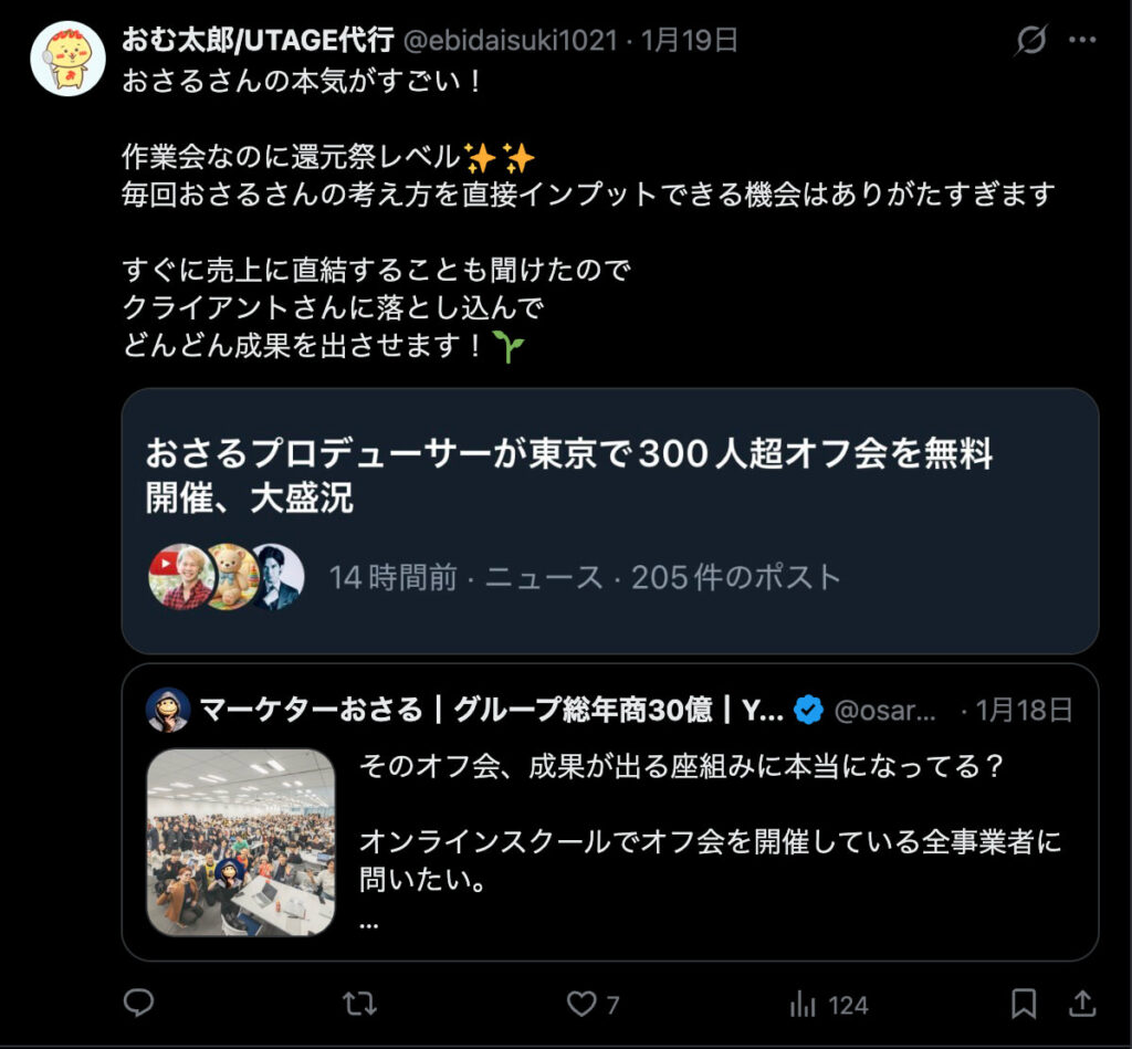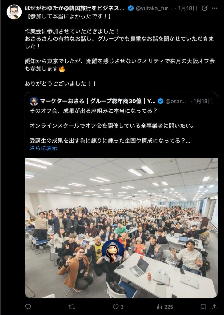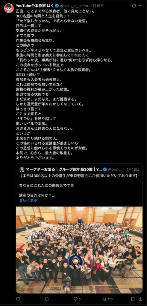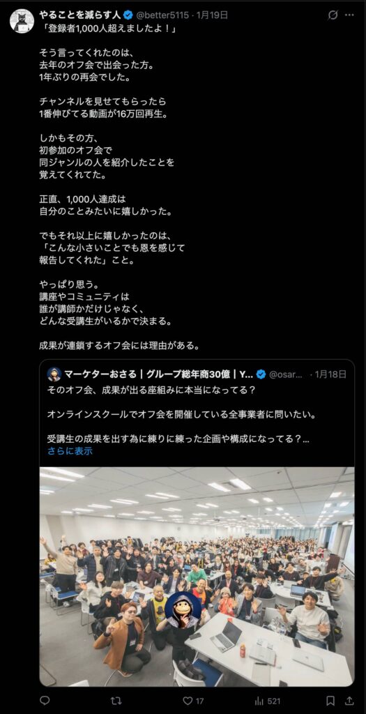 また、自身のブランドがまだ確立されていない段階では、なによりも手厚いサポートが重要であること。そして、お客様からの口コミや声こそが、もっとも強力なランディングページ(LP)になることを伝え、おさる自身がどうやって信頼を積み重ねてきたか、その根幹となる部分をお伝えしました。