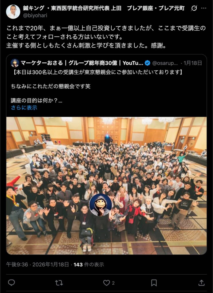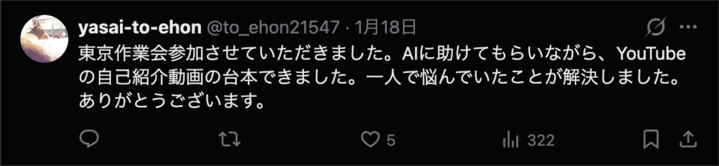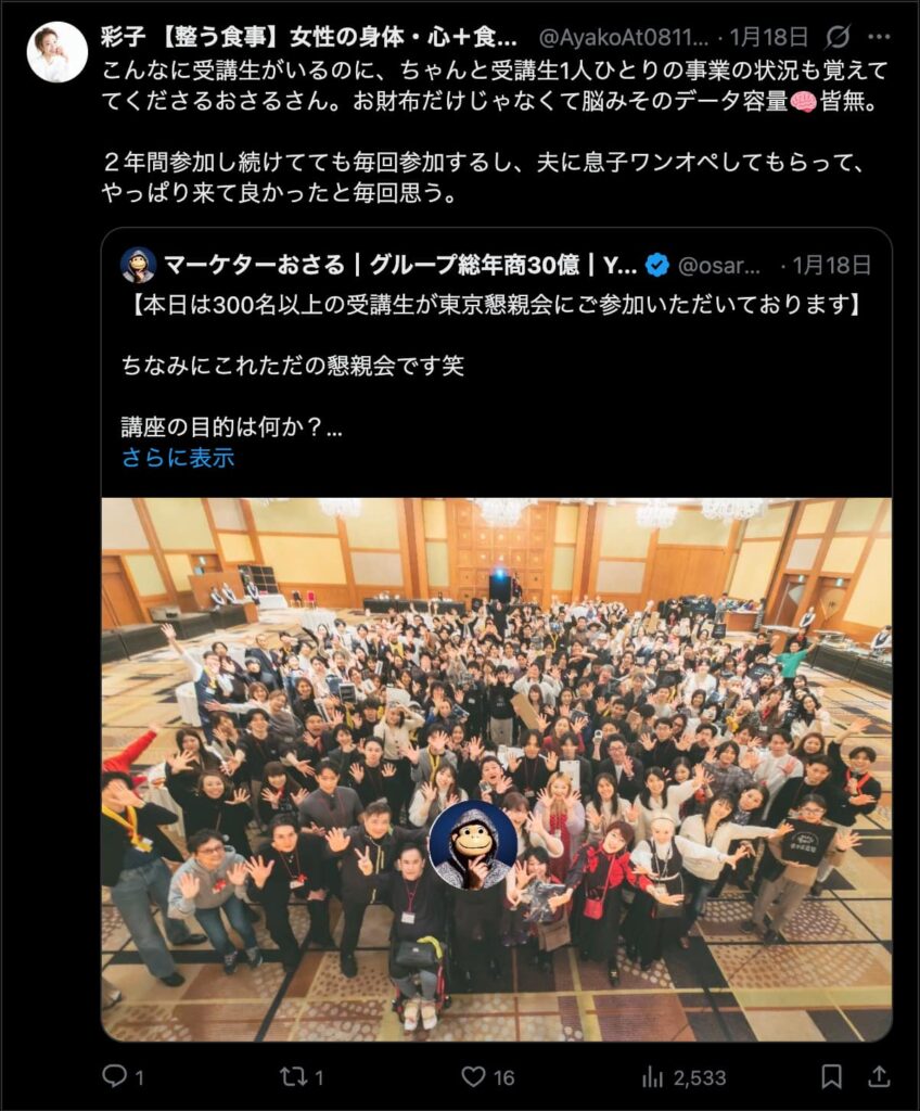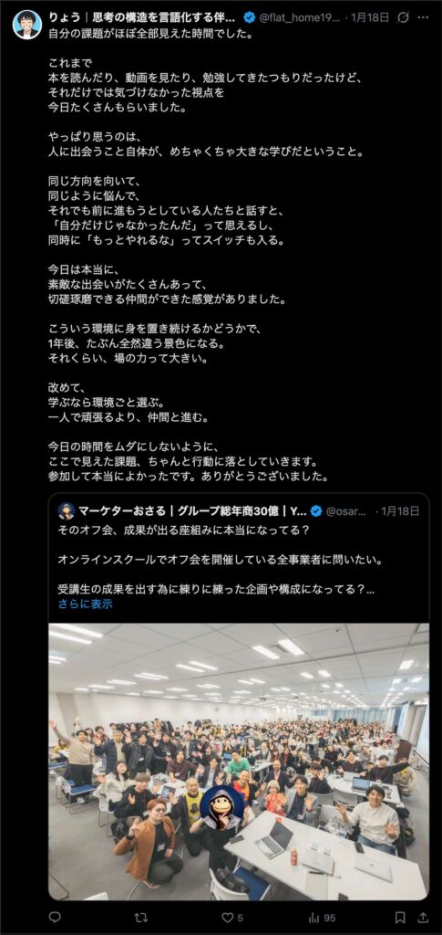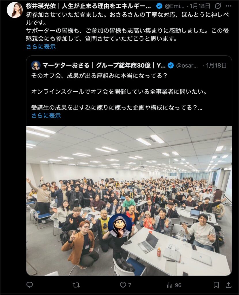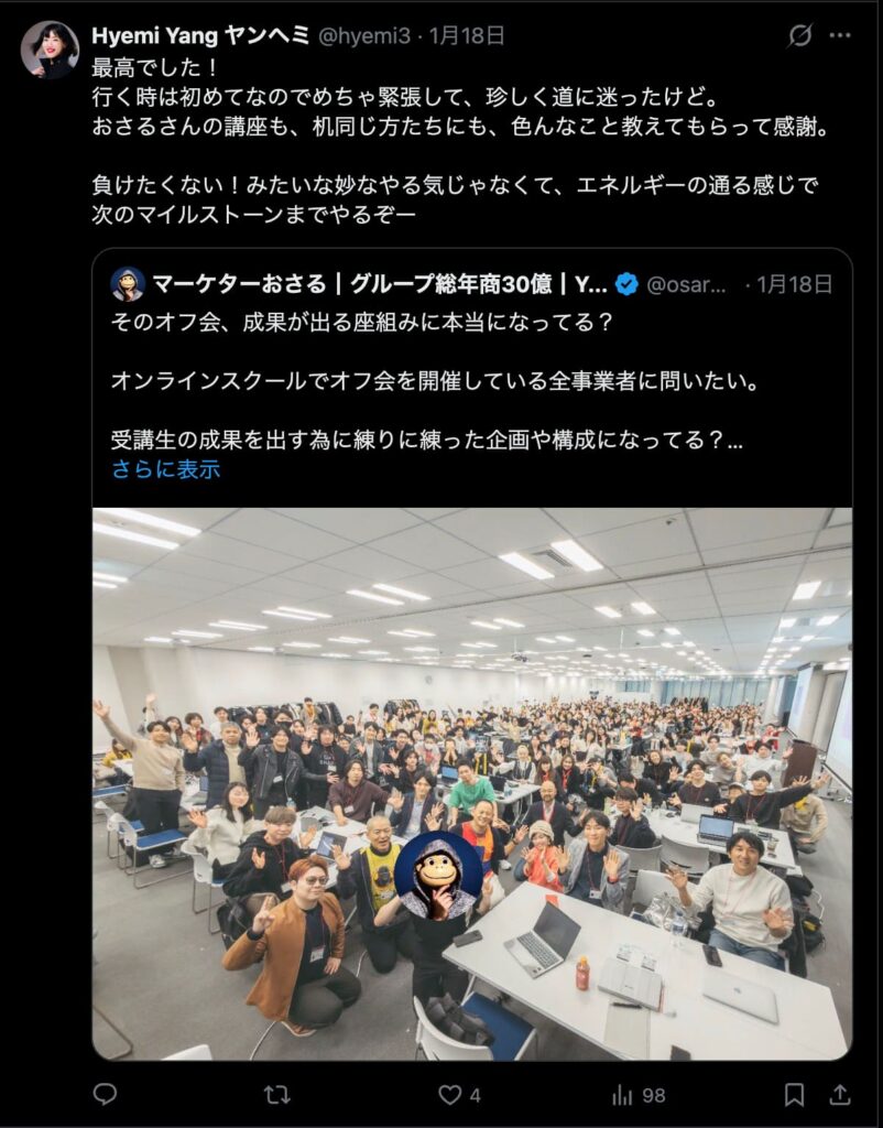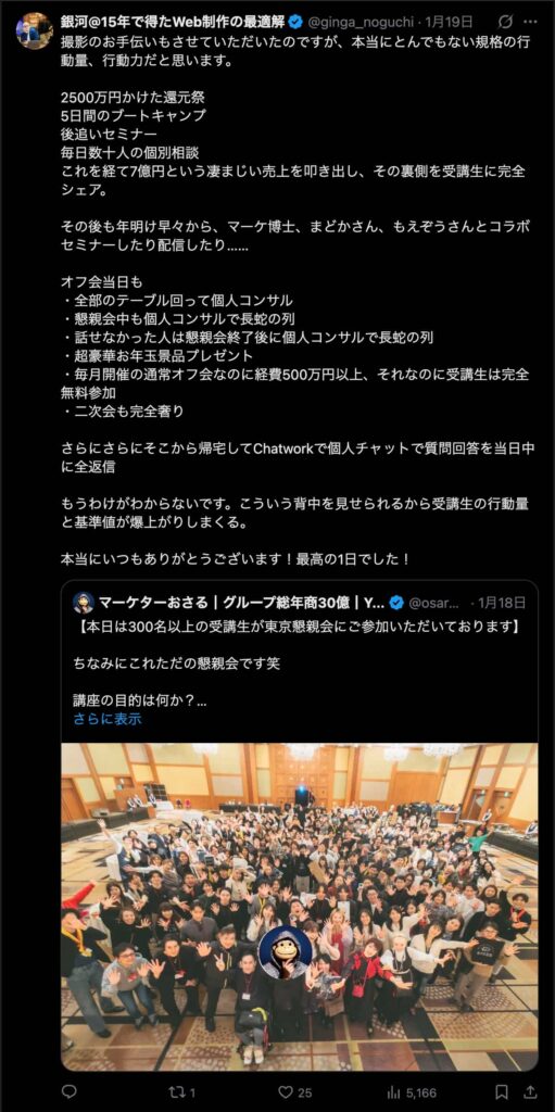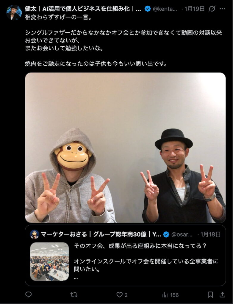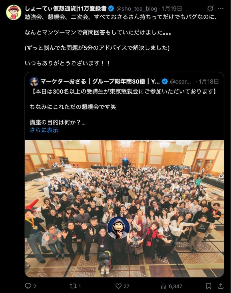 また、自身のブランドがまだ確立されていない段階では、なによりも手厚いサポートが重要であること。そして、お客様からの口コミや声こそが、もっとも強力なランディングページ(LP)になることを伝え、おさる自身がどうやって信頼を積み重ねてきたか、その根幹となる部分をお伝えしました。