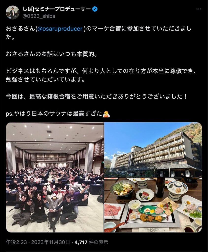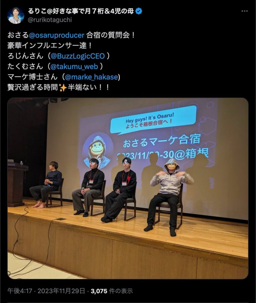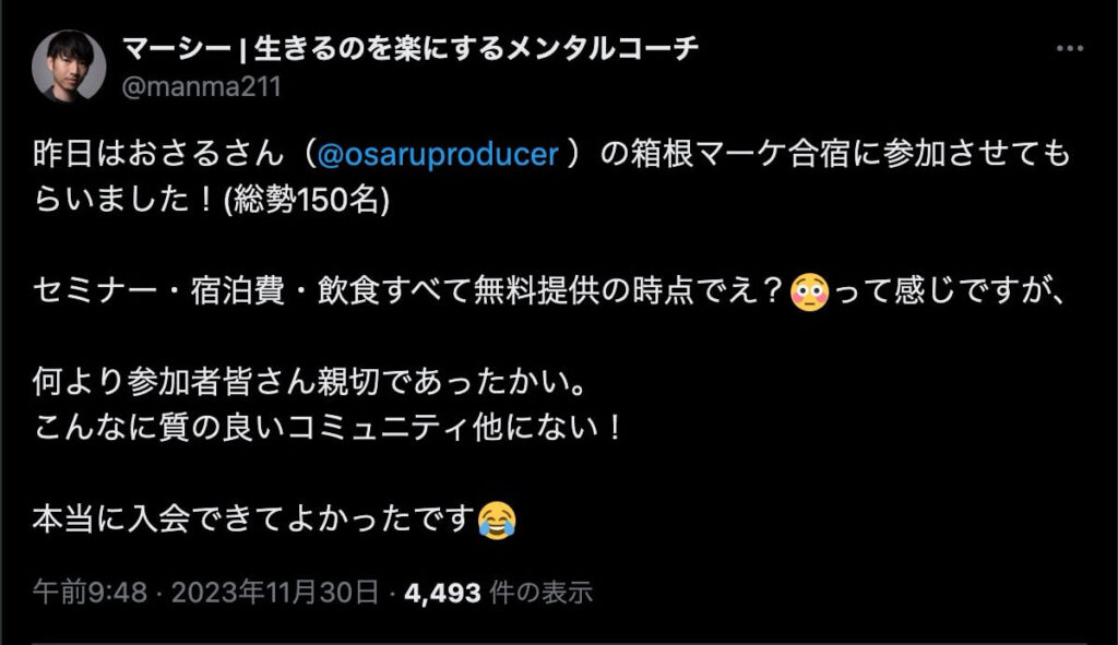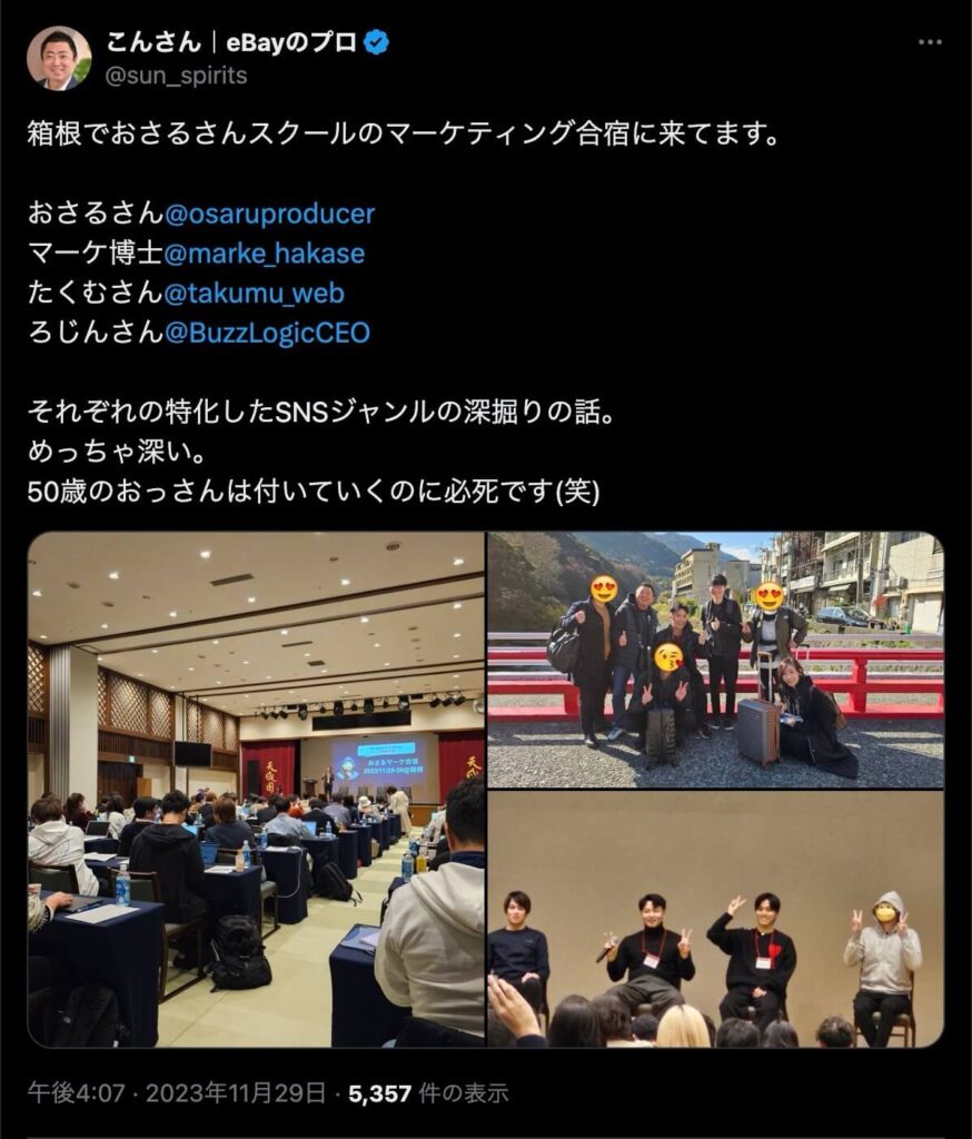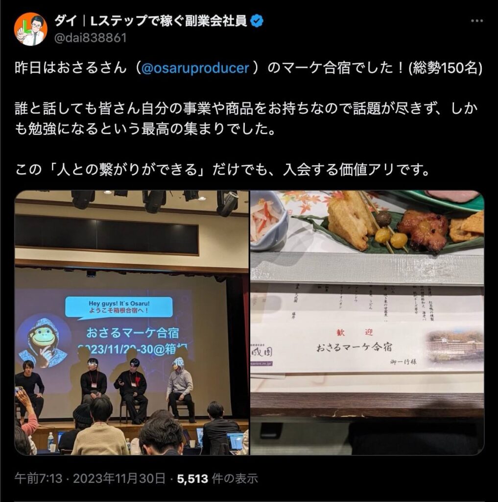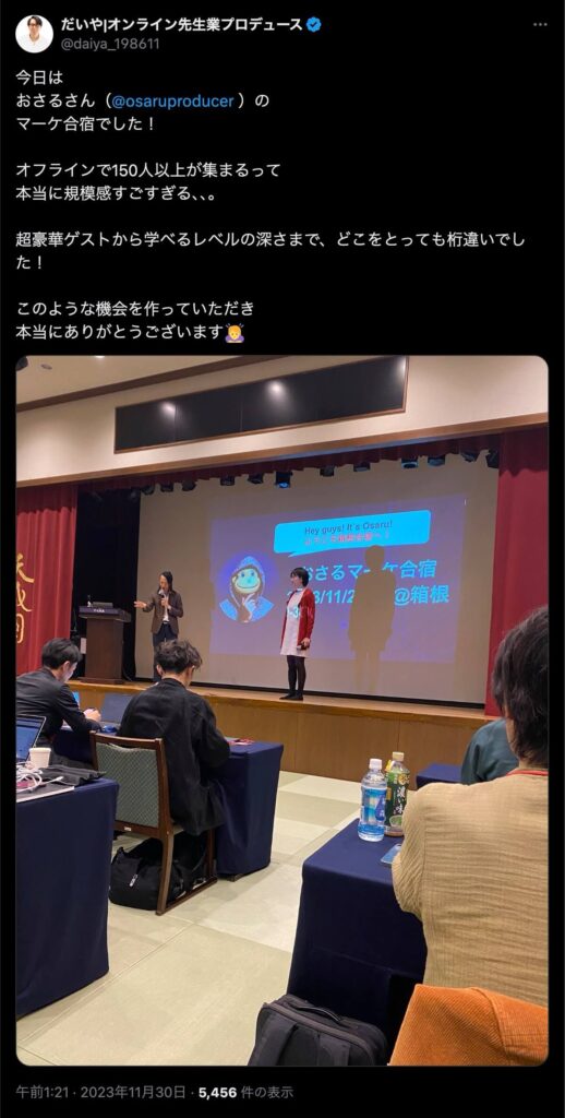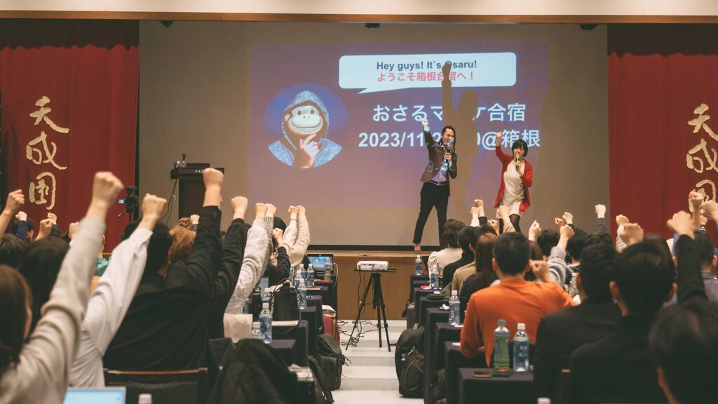 2023年11月29日、おさるマーケ講座のおさるマーケ合宿が開催されました。今回は総勢150名以上が参加する特大規模となりましたので、その様子を参加者の口コミとともにお伝えします。
