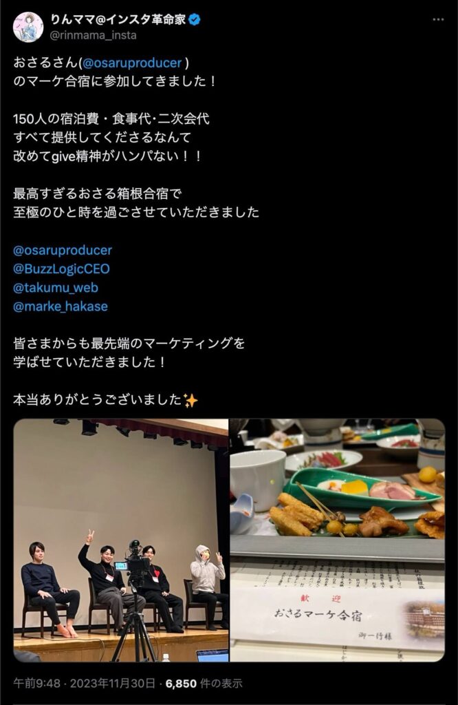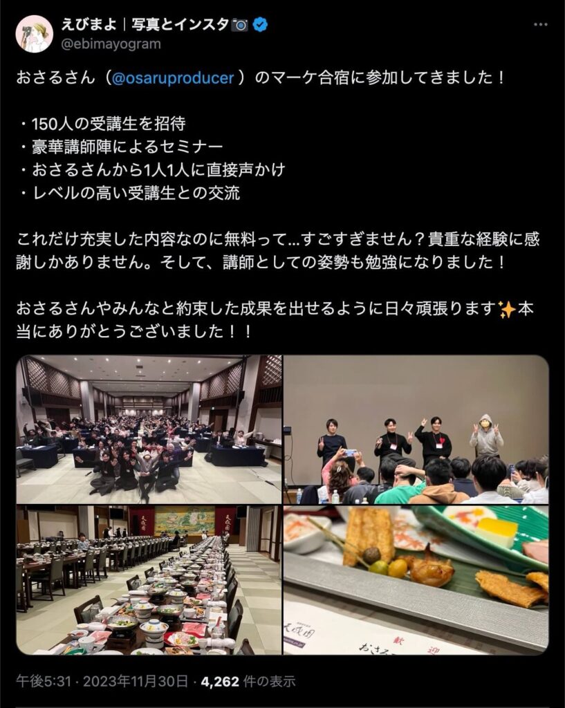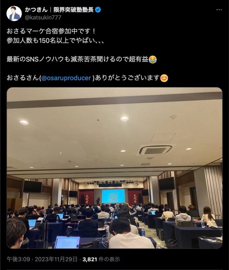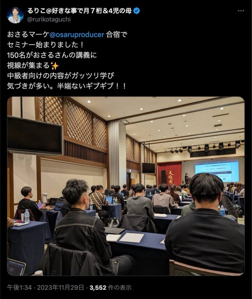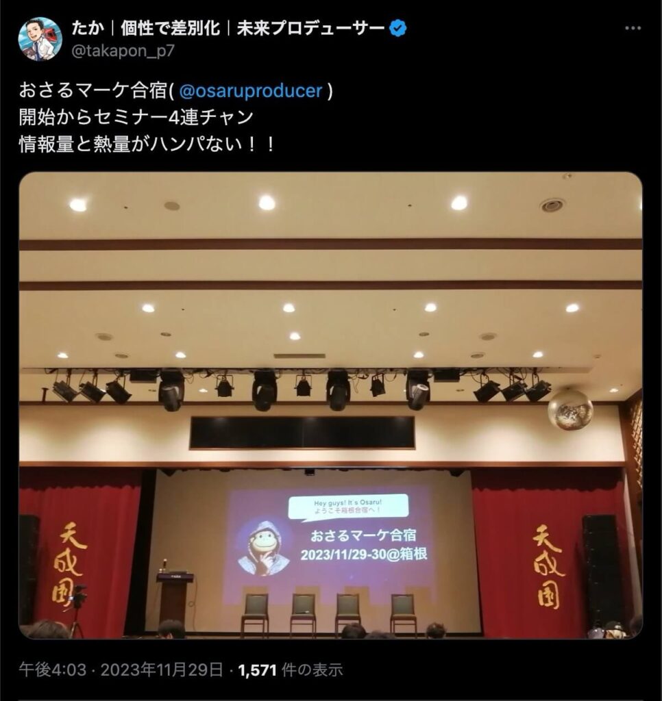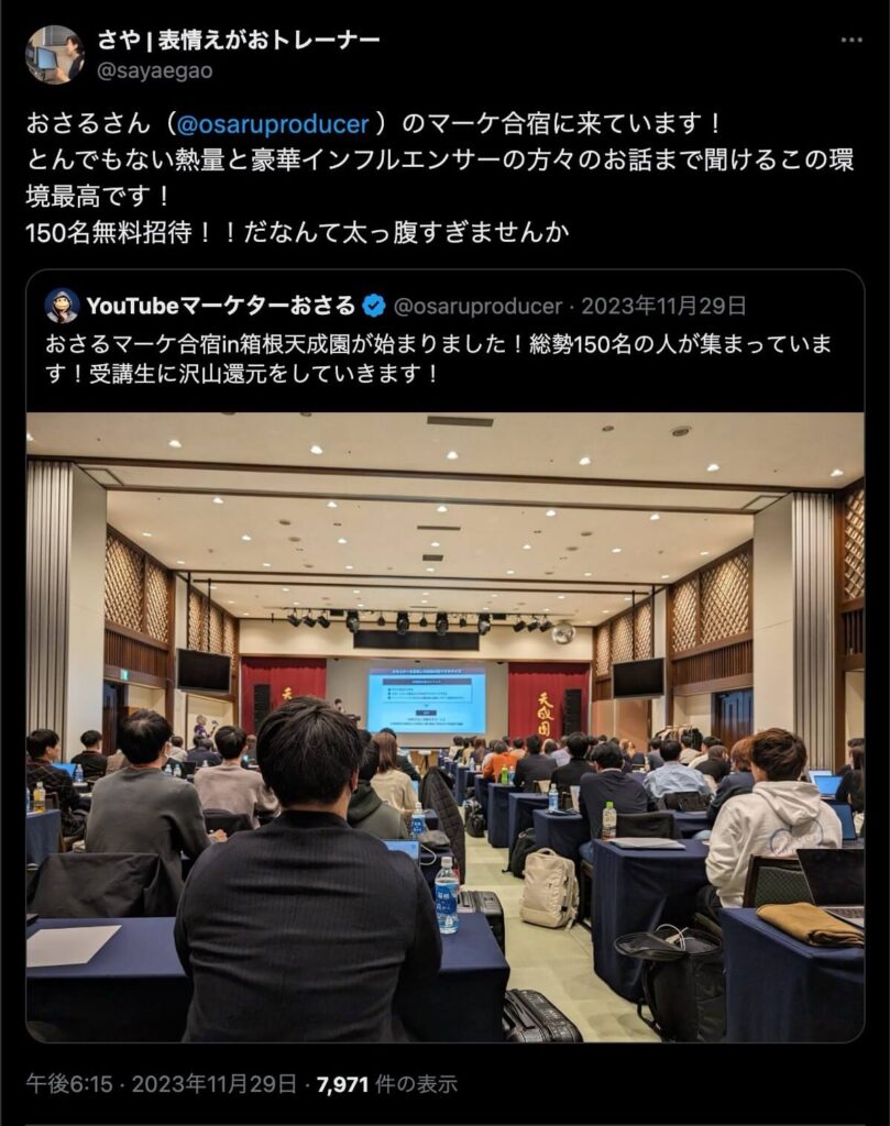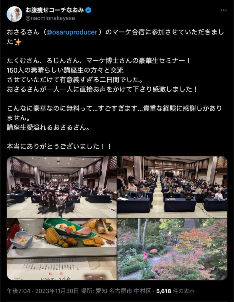 2023年11月29日、おさるマーケ講座のおさるマーケ合宿が開催されました。今回は総勢150名以上が参加する特大規模となりましたので、その様子を参加者の口コミとともにお伝えします。